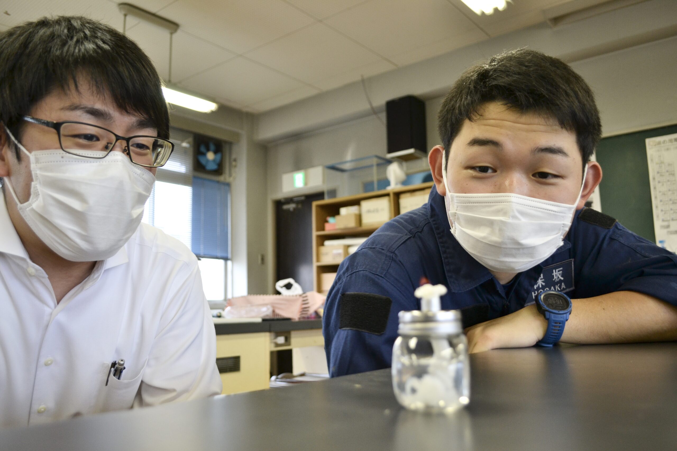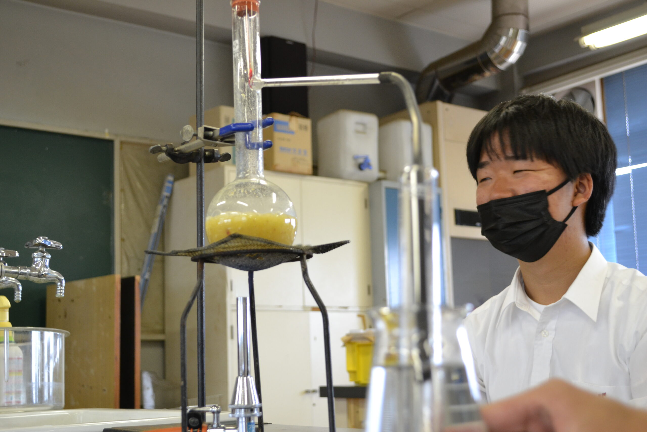 昨年度は高校3年生の先輩がサツマイモを砕き、発酵させてバイオエタノールを生成しました。次に後輩の私たちがそれを蒸留し純度を高め、アルコールランプの燃料にして点火する燃焼実験とその熱を利用したスターリングエンジンの稼働実験を行いました。