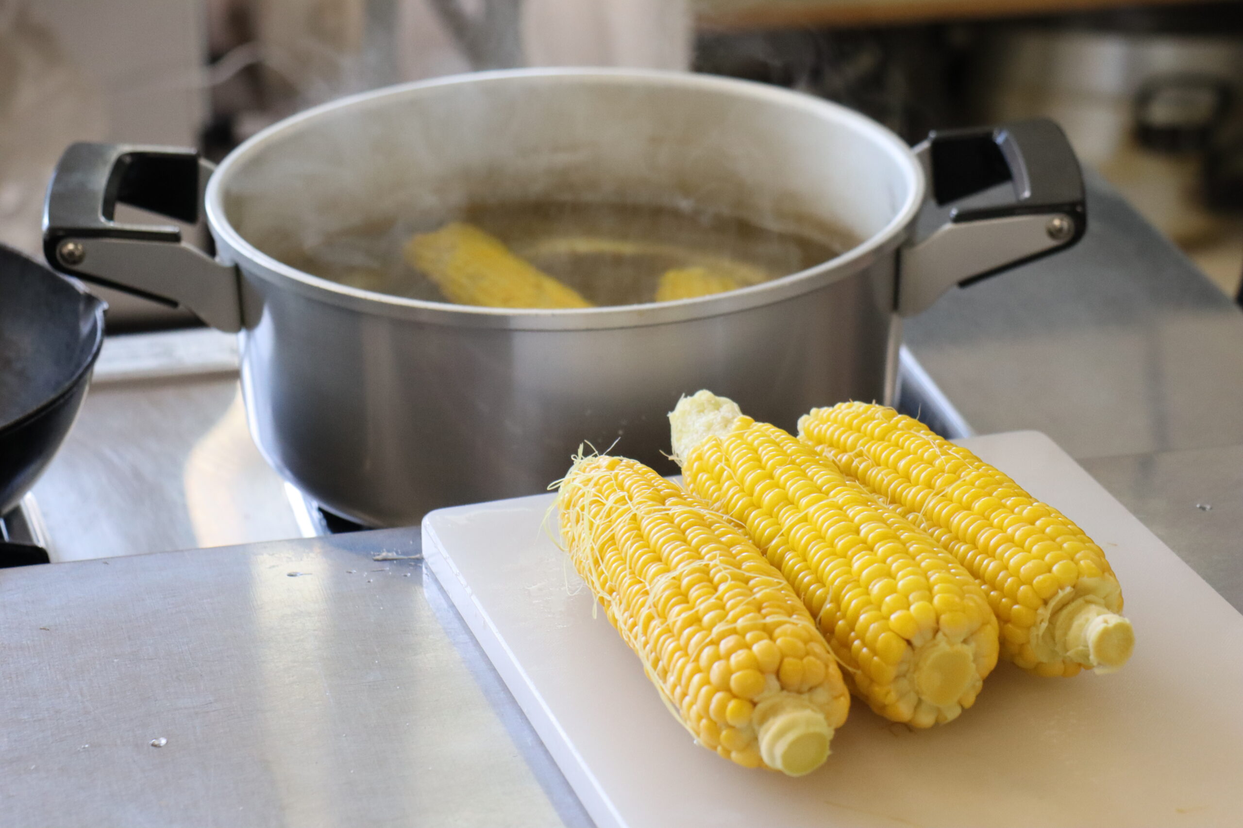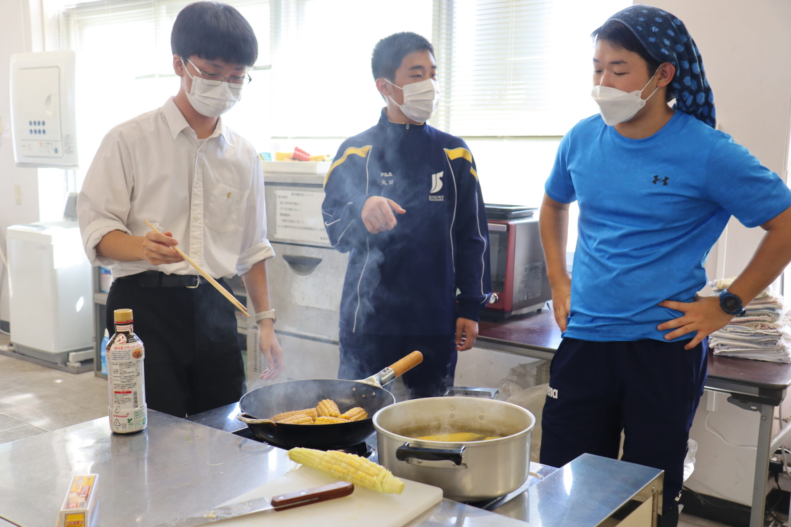 今回はとうもろこしをたくさん収穫!これらを使って調理実習を行いました。 毎日欠かさない水やりのおかげか粒の色艶がいい!食べるのがもったいない気がしますが醤油をたらして、フライパン焼きに・・・。 今までの頑張りが報われたひとときでした。