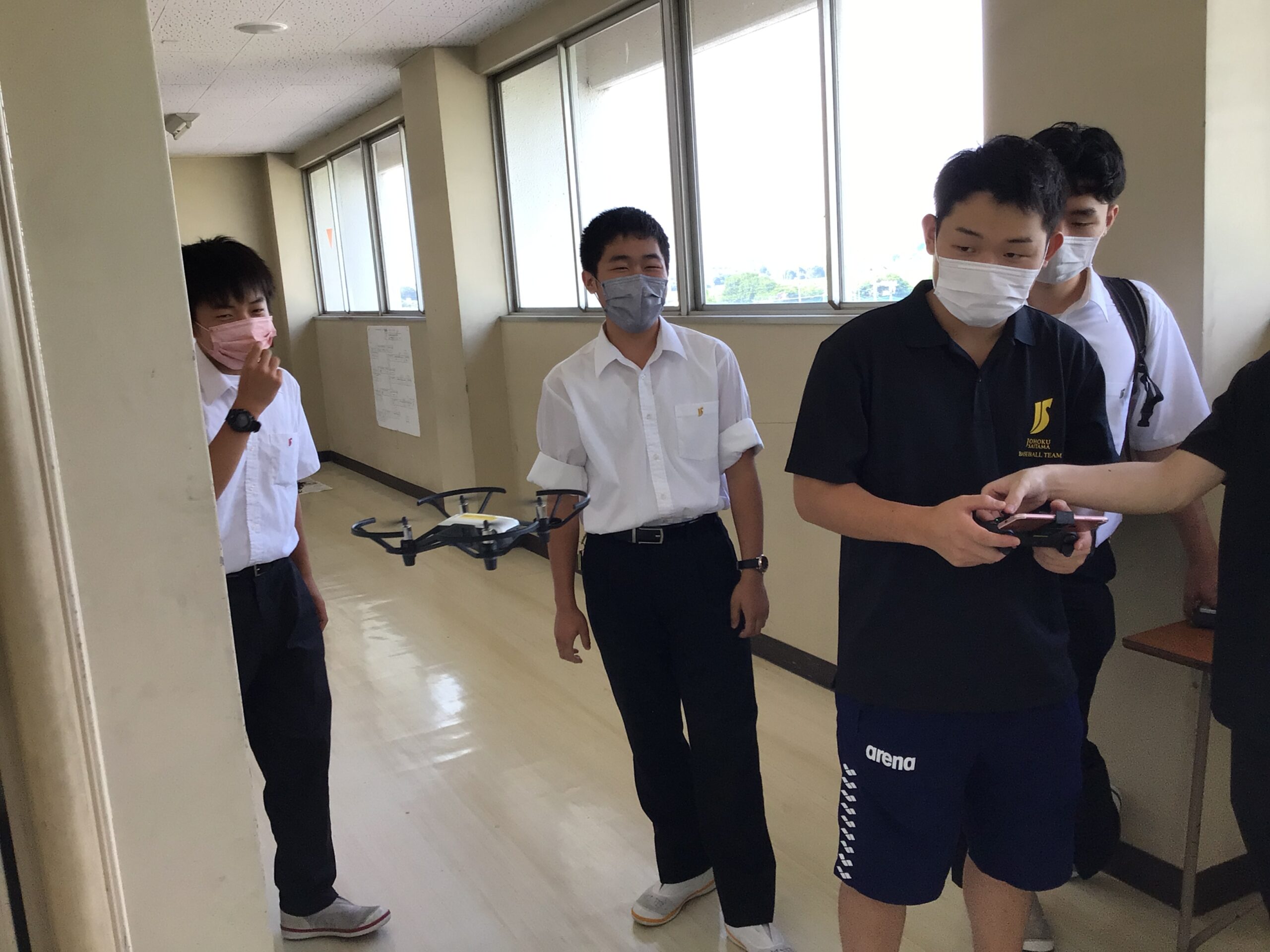 操縦をするのが初めての生徒も多かったので始めはドローン操作に四苦八苦していました。風を考慮した三次元操作に生徒たちも手に汗握りながらコントローラーを握ります。ですが、数回操作していくとすぐに慣れが出始め、新たにいろいろな技に挑戦する生徒たちの姿もありました。