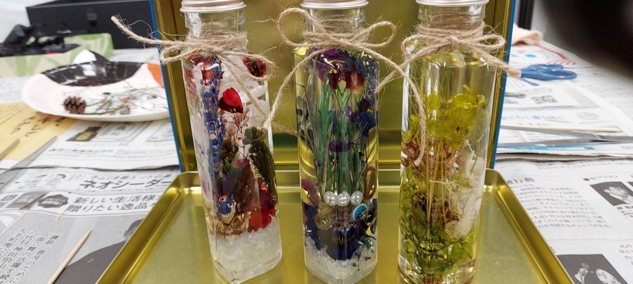 文化祭では今回作成のハーバリウムや、手作り作品、植木鉢物の販売をいたします。
