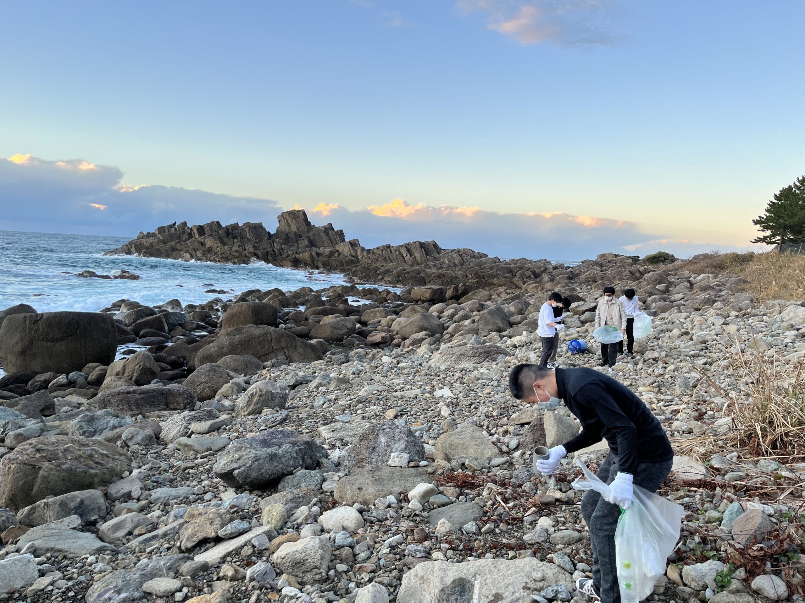 最後は志野さん達と一緒に越前海岸のゴミ拾いをしました。この時期はまだ少ない方と言われましたが、ヘルメットや韓国語の書かれたサンダルなど驚くほどの量が海岸に流れ着いていました。