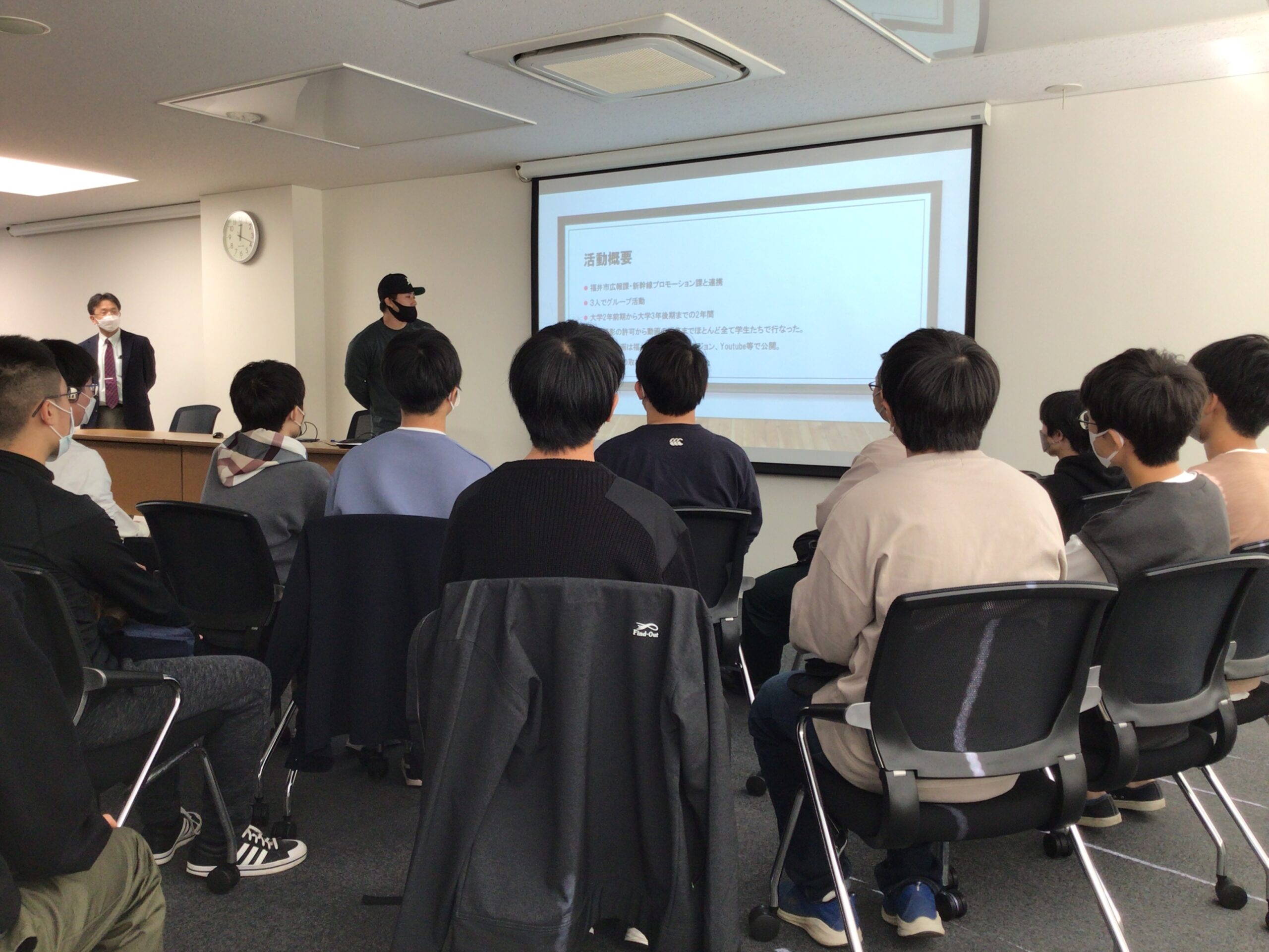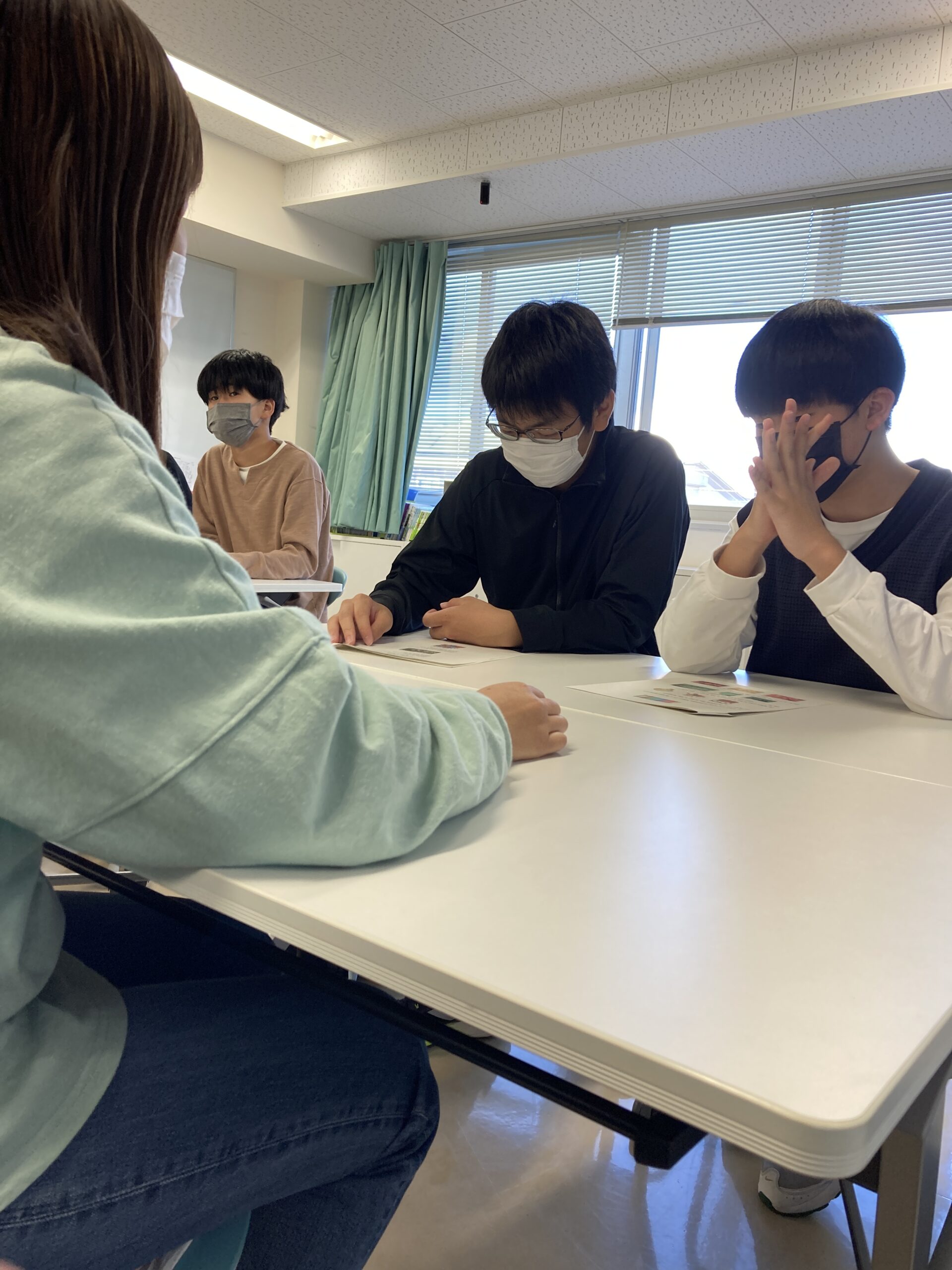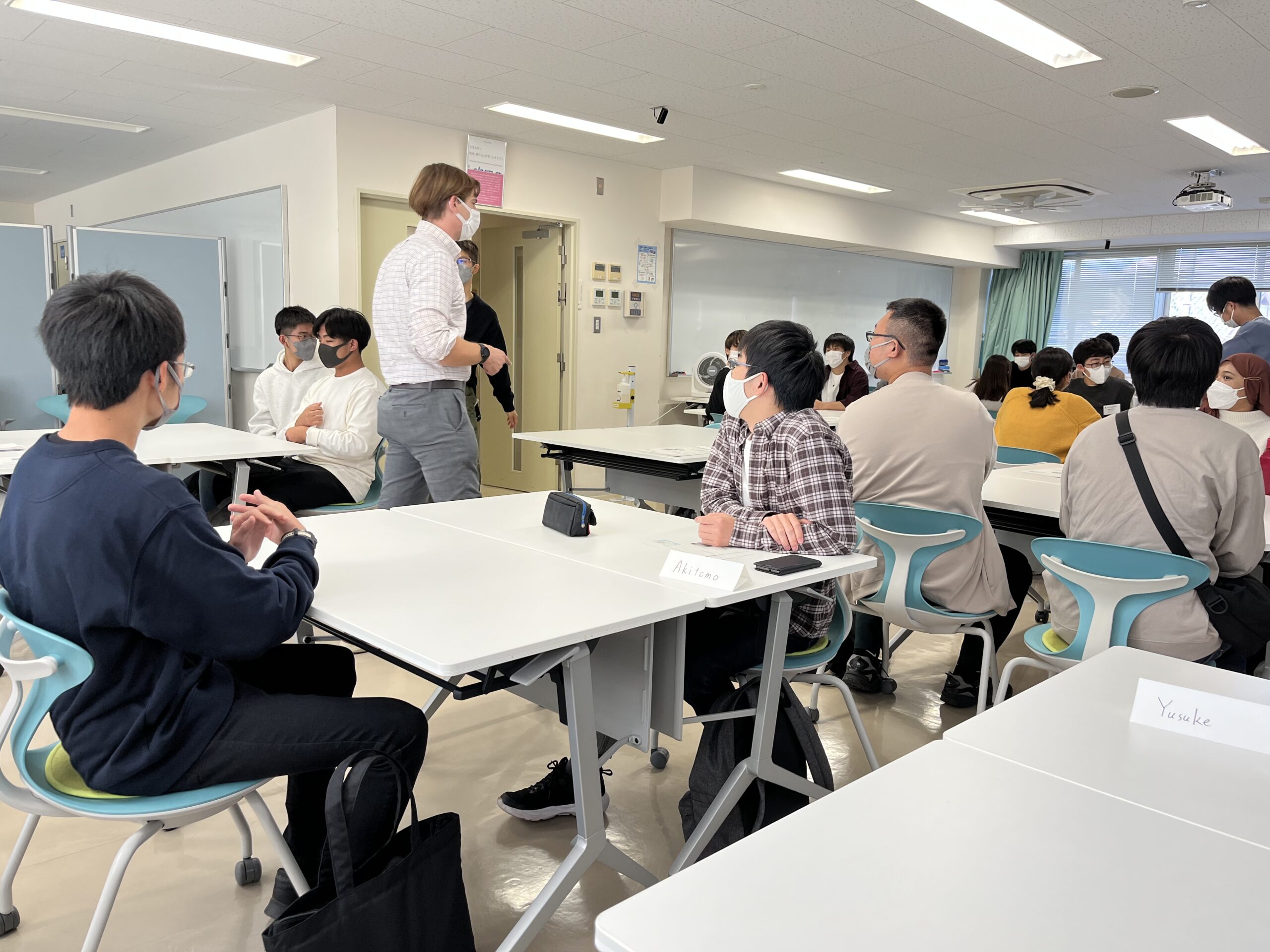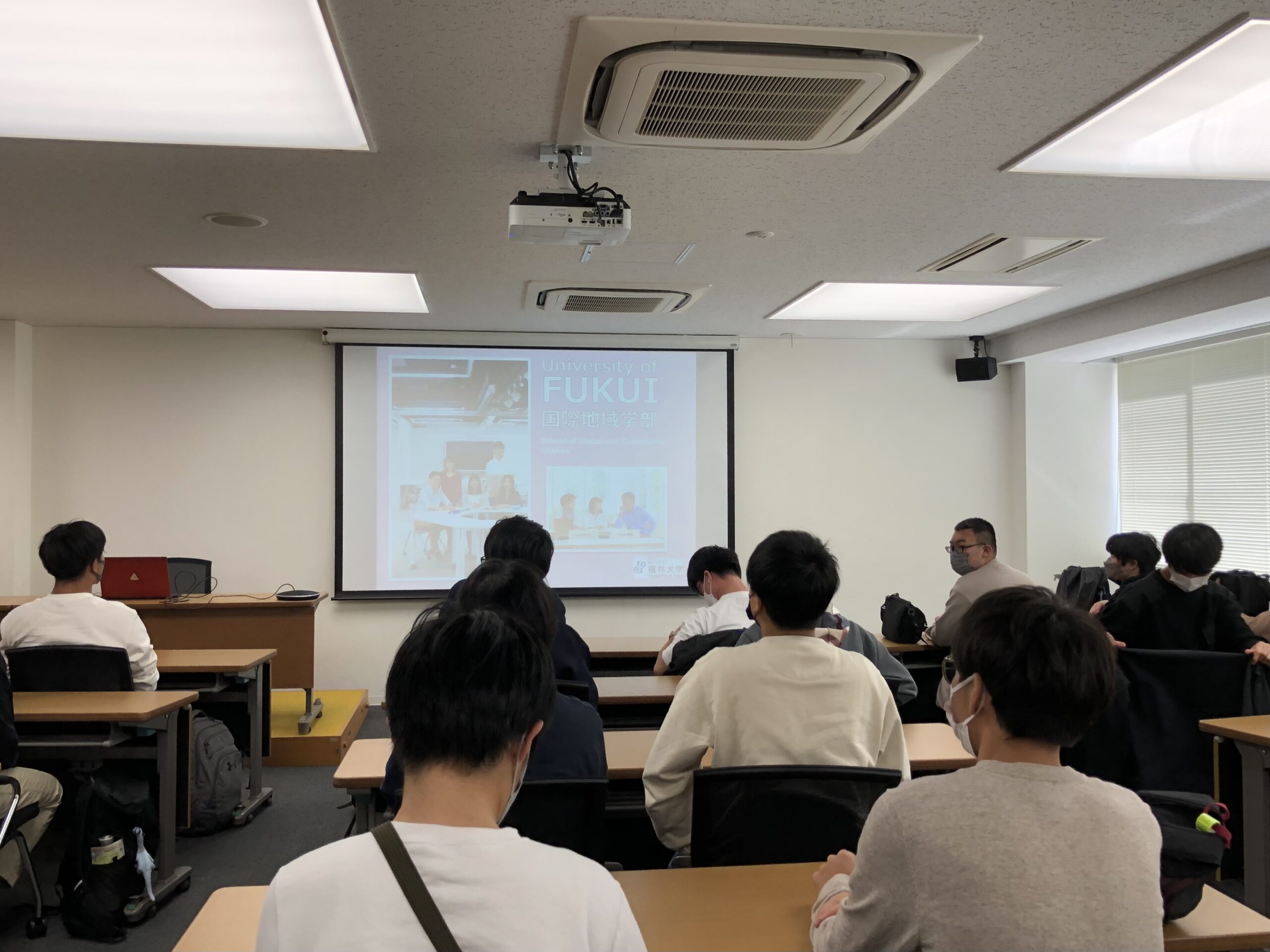 国際地域学部の英語の授業も体験させていただきました。はじめましての福井大生、それも英語でコミュニケーションするという難易度の高いミッションです。中には留学生もいて、同じ問いに対して我々にない視点からの意見がありました。改めて英語は4スキルだけではなく、異文化同士が理解し合うために必要なツールだと深く感じられました。