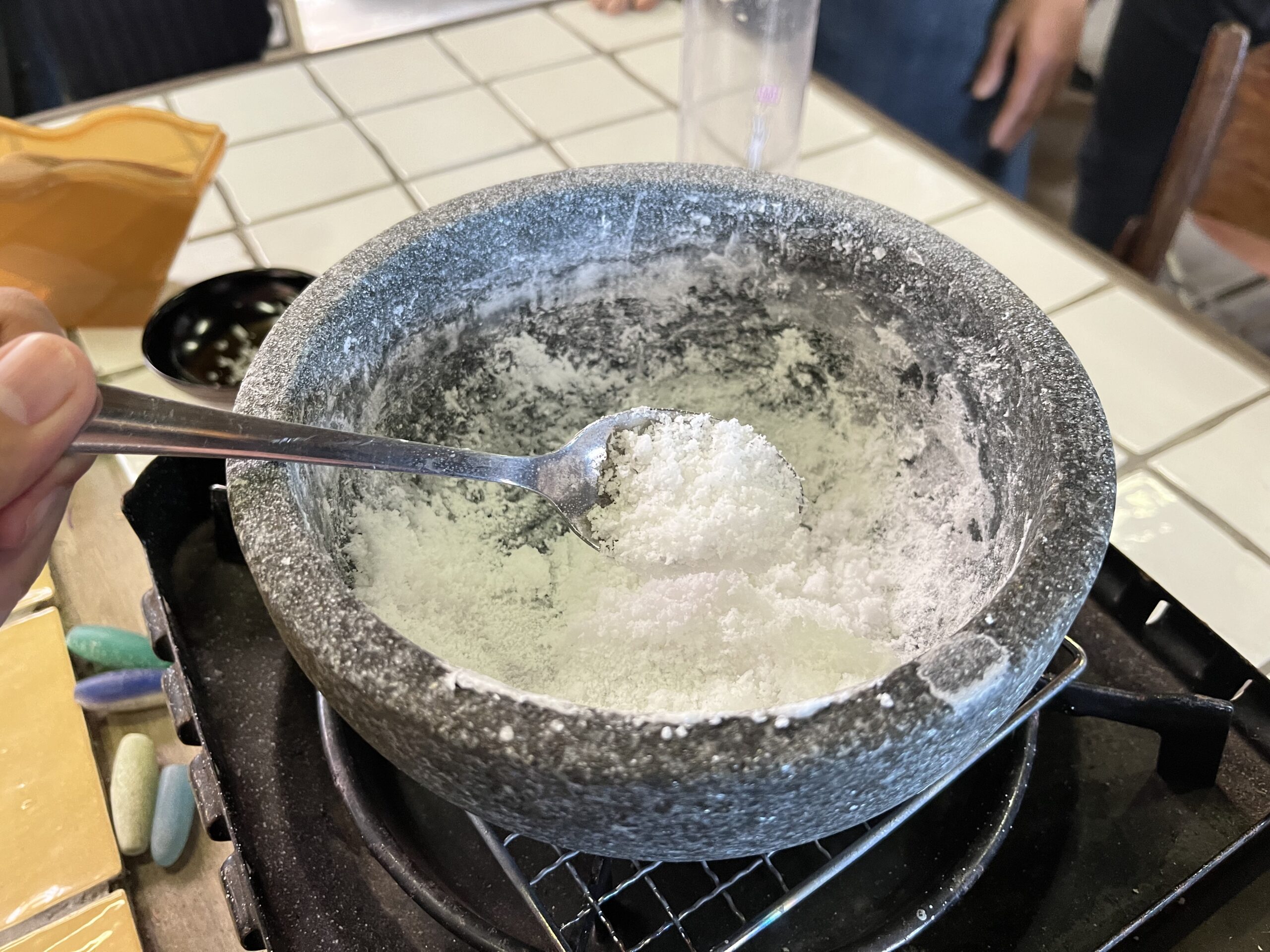 塩分濃度を高めた海水を石鍋に入れて沸騰させます。海の近くに山もあるので、湧水が海に流れ出します。淡水と海水が混ざり合う越前海岸の海はとてもミネラルが豊富です。そんな海水を沸騰させること1時間。水が蒸発し塩が出来上がりました。その塩をオリジナルの封筒に入れて完成です。