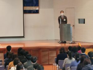 その間に、保護者は近藤記念ホールで全体会をおこない、校長・教頭・学年主任から新年度の行事や学校生活に関する話がありました。