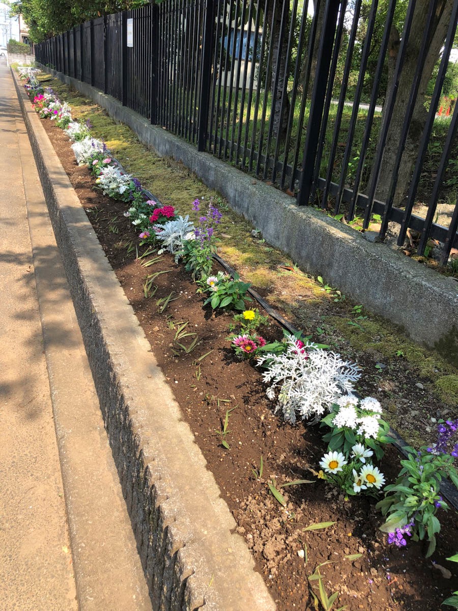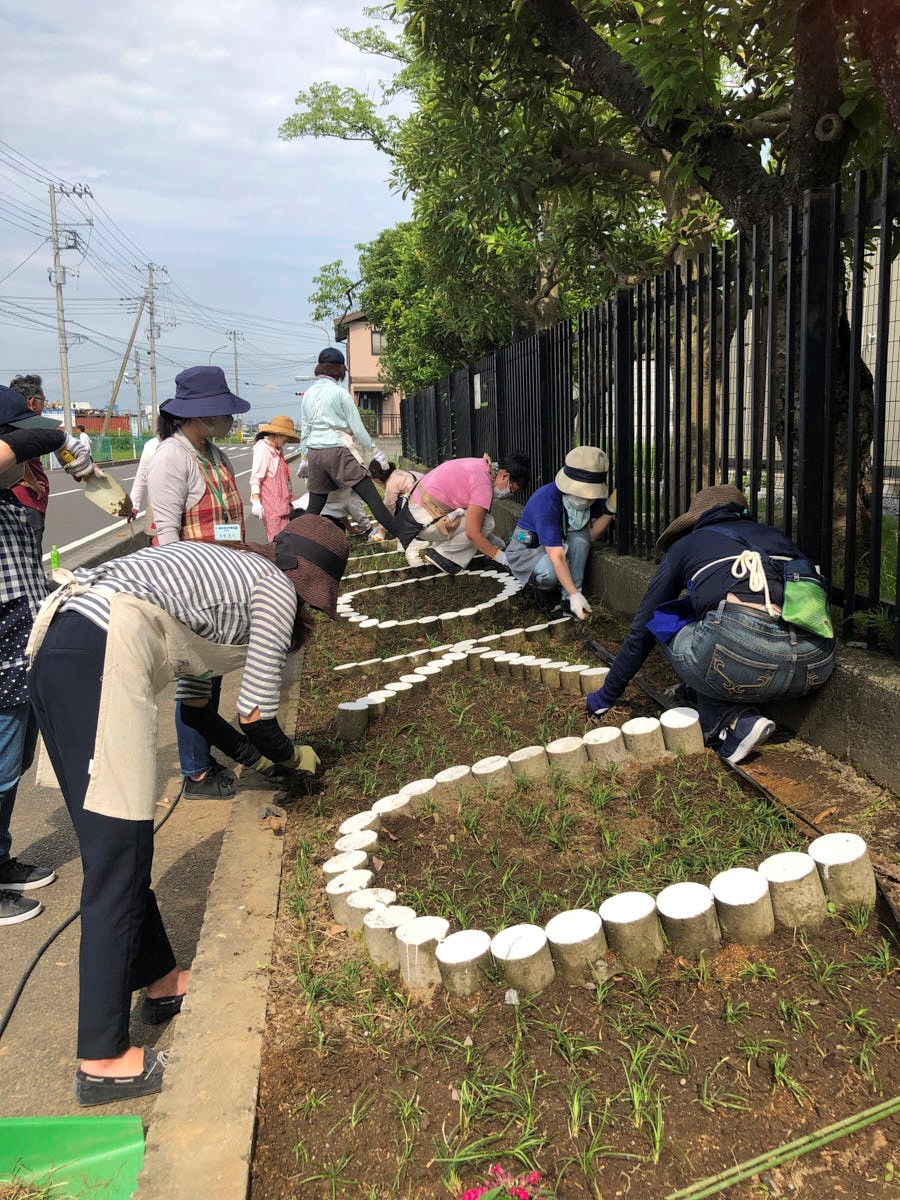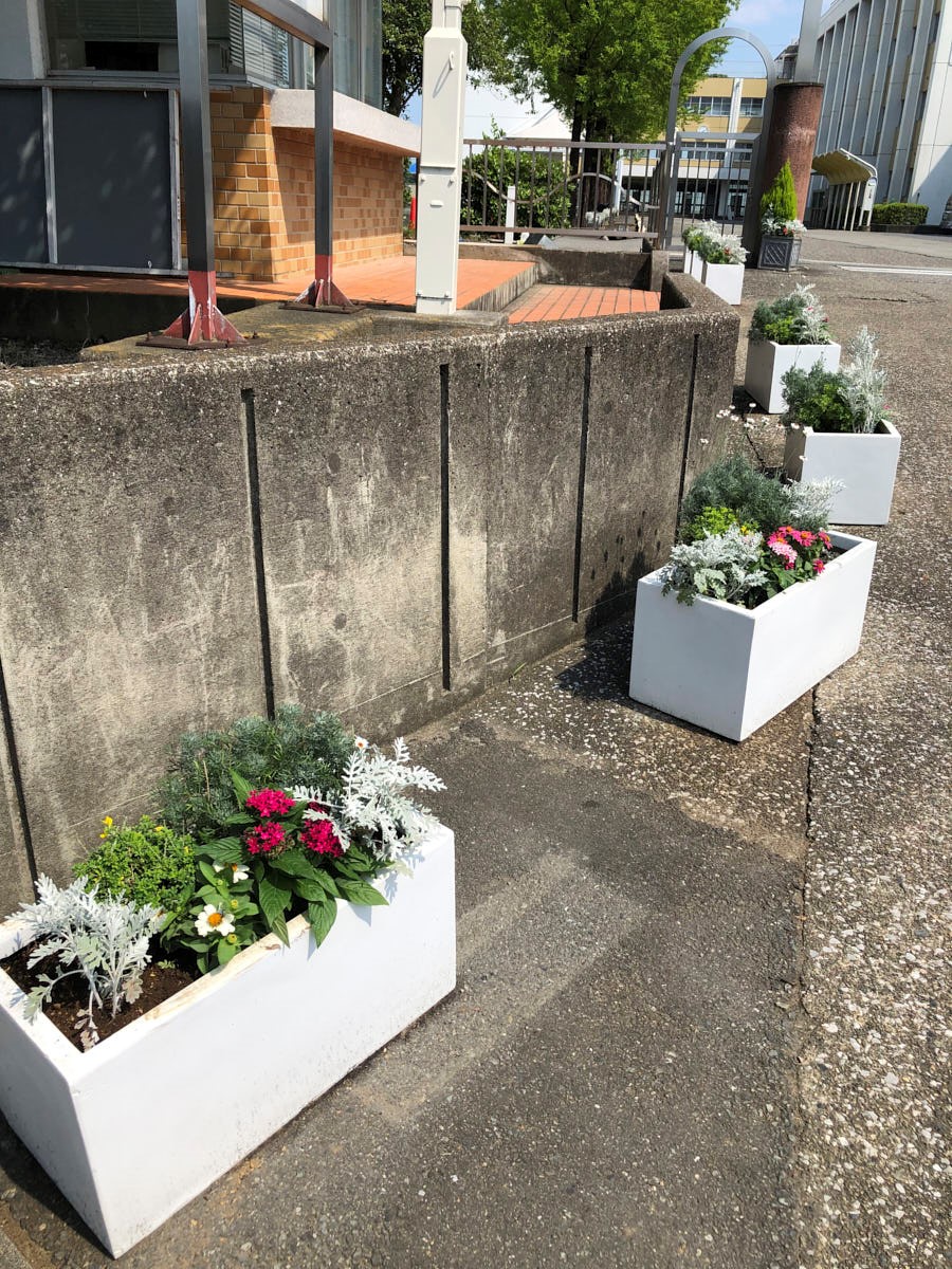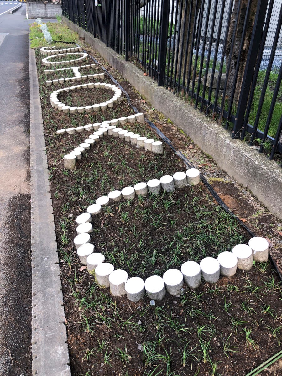 花壇左側のJOHOKUのアイコン周囲にはグラウンド端から採取した玉竜を丁寧に植えて敷き詰めました。用務員さんがあらかじめ文字を塗って下さったので、緑一面に浮かび上がる白い文字が美しく新鮮でした。これからも少しずつ栽植をしながら緑いっぱいに彩るようにと願いを込めて続けていきたいと思います。