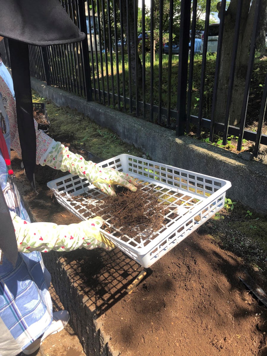 6/17(土)、代表学年とおやじの会の方々にご協力を頂き、左側花壇の土壌改良を行いました。長きに渡り固くなってしまった土の中では古い木の根が張り巡らされて絡まり、石やゴミなどが混入しており土の掘り起こしには多大な労力を要しましたが、皆さまのご尽力により花苗にとって最良の土壌になりました。他の花壇などの改良も今後の課題としたいと思います。