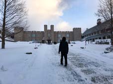 2日目の朝、前夜から舞っていた小雪のため、道にはうっすらと雪が積もっていました。私たちは古い寄宿舎や兵舎を模した建物に泊まっていますが、建物の外観や内装とは異なり、内部はしっかりと暖房が効いていて快適に過ごせました。