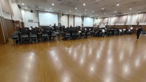 開校式で学年主任より合宿の意義の説明の後、中入生の実行委員が中心となってkeynoteを用いた自己紹介スライドを作りました。