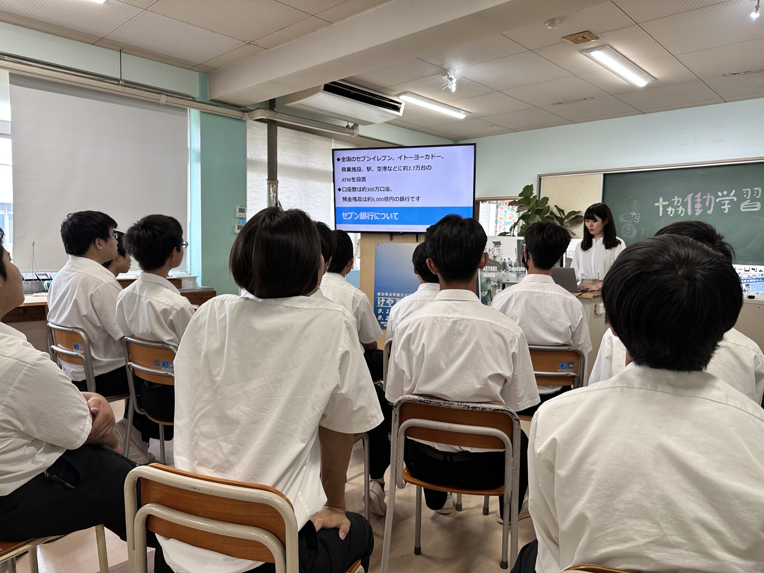 セブン銀行の方からは近年増加傾向にある口座売買の問題についてのお話です。自ら手を染めてしまう者、個人情報を握られ犯罪から抜け出すことができない者など、様々な現状に息を呑む様子でした。高校2年生は昨年度目にした映画「記憶2」とつながる話だと感じたようです。