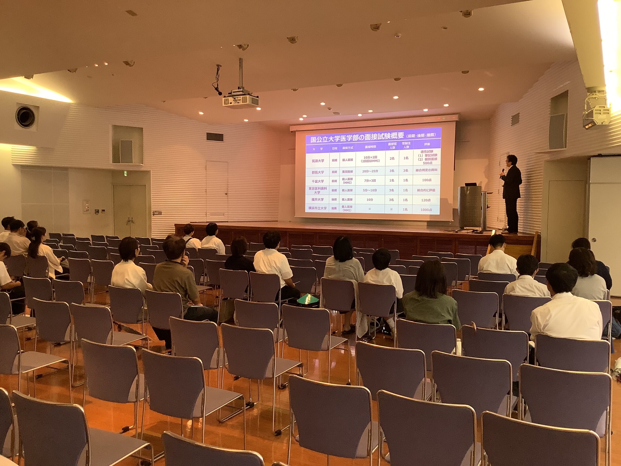 10月5日(土)放課後を利用して、医学部専門予備校富士学院の方を本校に招いて、保護者対象に医学部医学科受験に向けた内容でご講演していただきました。中学1年生から高校3年生までの希望者20組が集まりました。専門予備校ならでは貴重な情報があり、親御様は皆さん真剣にメモを取られていました。