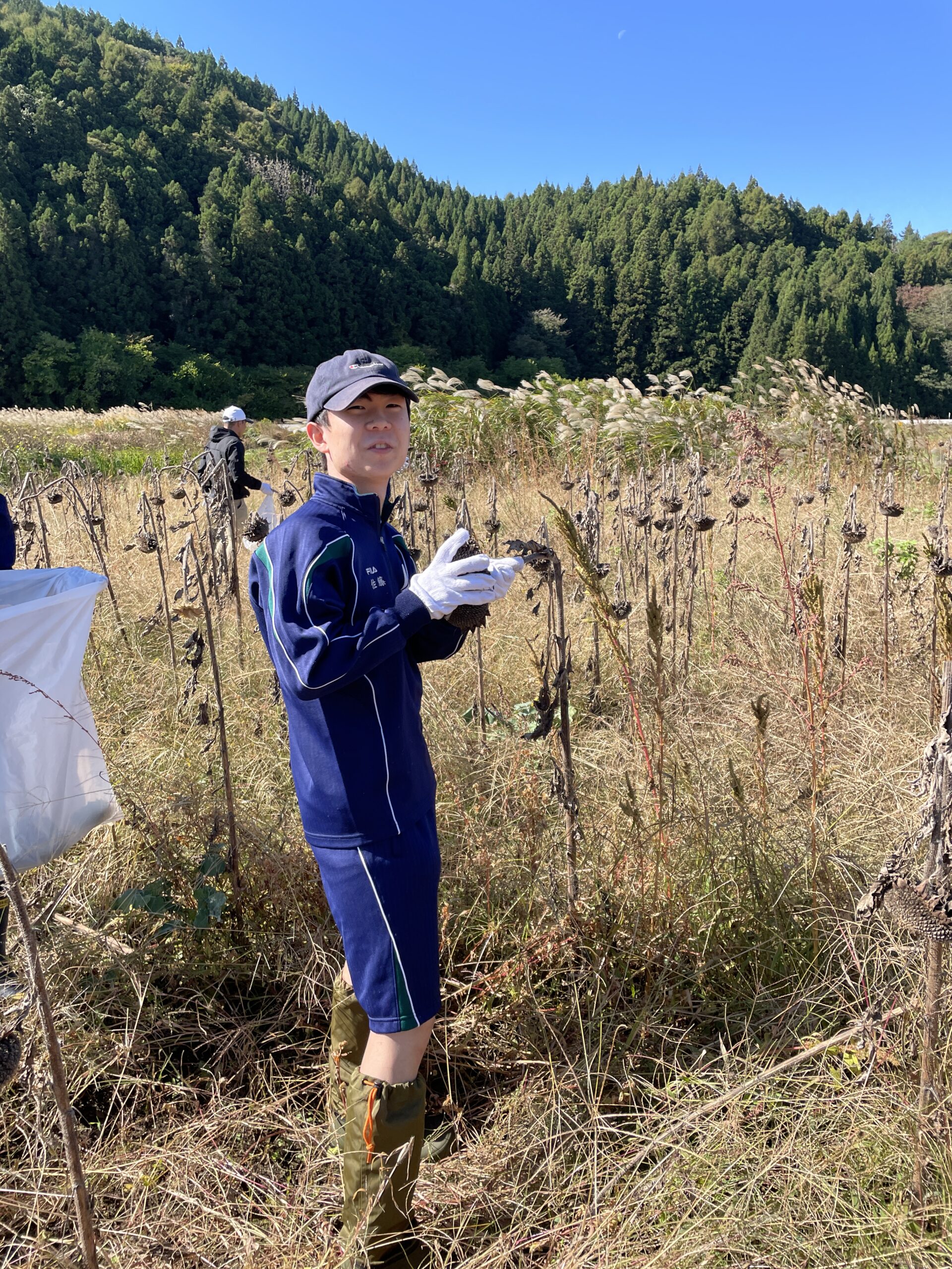 2日目は湖南高校との交流を行いました。湖南高校へは徒歩で向かいました。約10キロという長い距離でしたが、気温もちょうどよく、景色も素晴らしかったのであっという間でした。今回は5回目ということもあり、前回よりも積極的に交流をすることができました。午前中は皆でそばの収穫を行い、私はその隣でひまわりの種の収穫を行いました。午後の稲刈りでは、前回と同様に始めは手動で、その後機械で収穫しました。手作業での収穫はとても地道な作業でしたが、機械を使うと自分たちが長時間かけて収穫したスペースが簡単に収穫されていく様子を目の当たりにし、機械の便利さを強く実感しました。