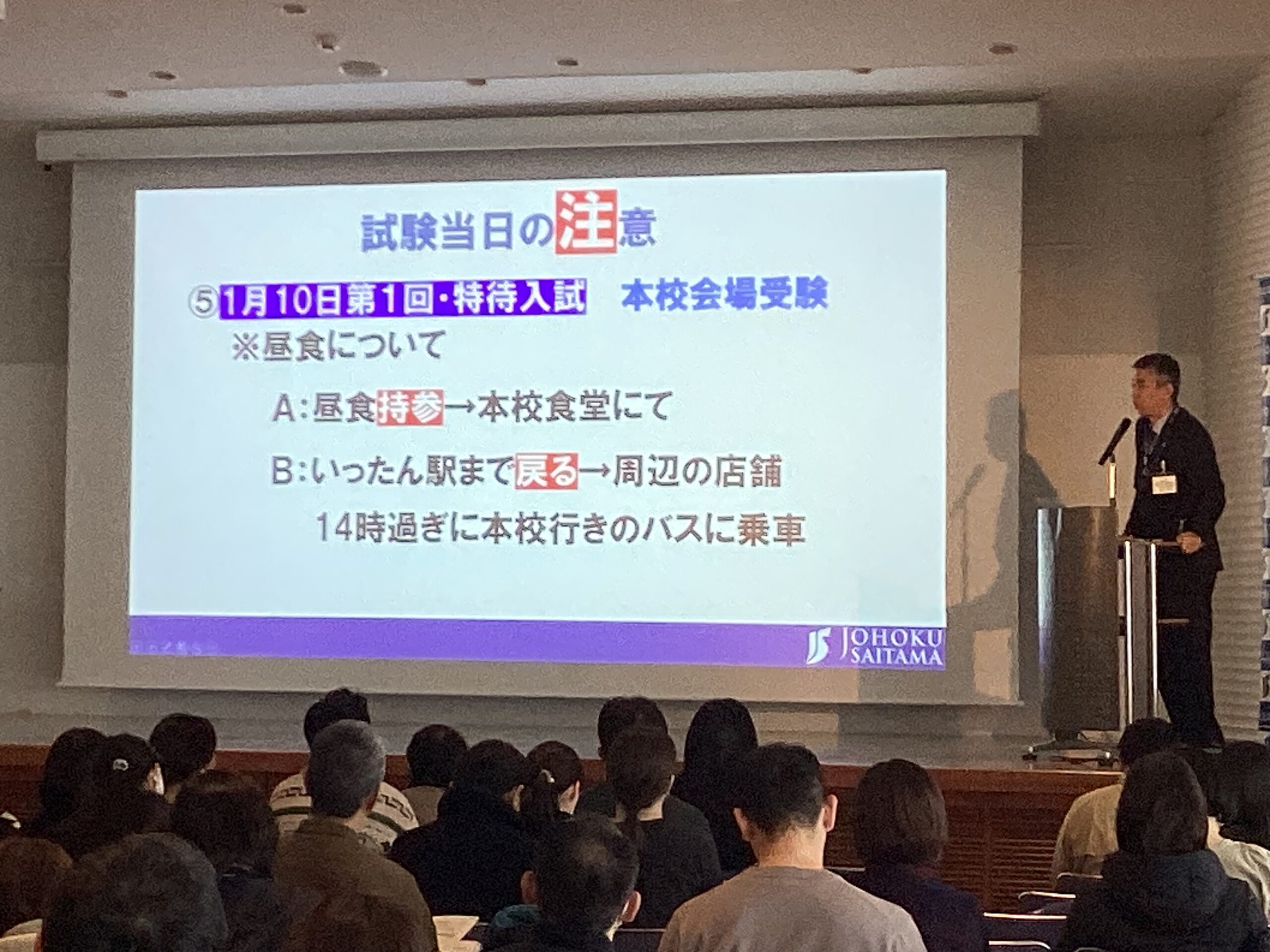 説明会では、校長の挨拶の後、入試広報部長より出願・受験に関する諸注意の説明をいたしました。