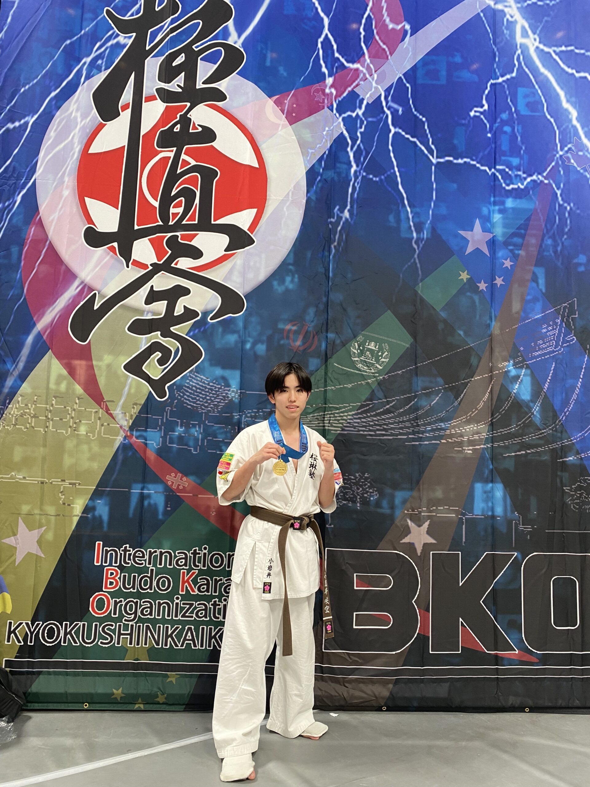 中学3年2年組小岩井咲空くんが第2回空手道選手権ワールドカップに出場し、組手U15男子軽量の部で見事に優勝し、金メダルを獲得しました。校外の活動ですはありますが、文武両道を見事に実践した素晴らしい結果をあげてくれました。