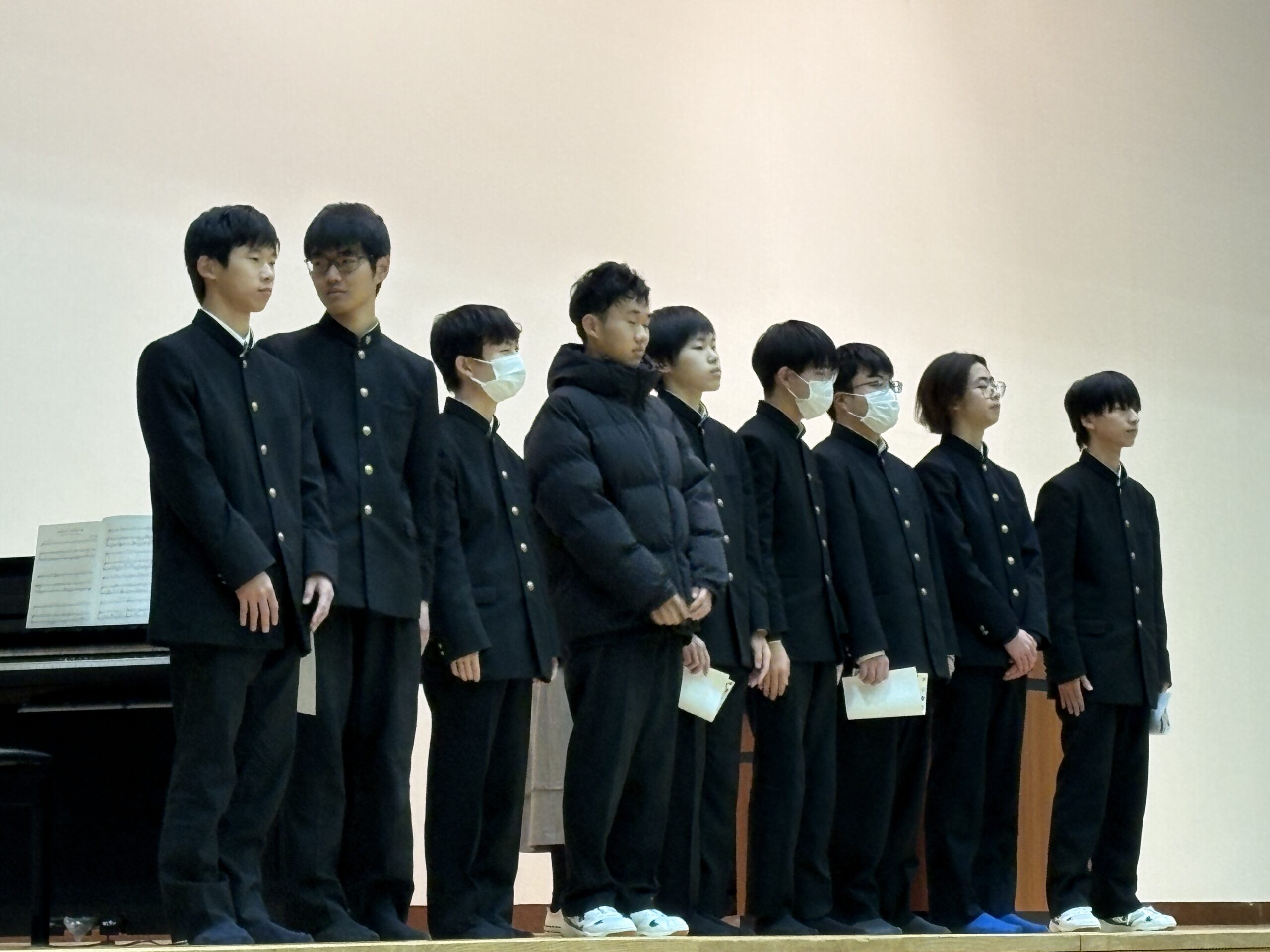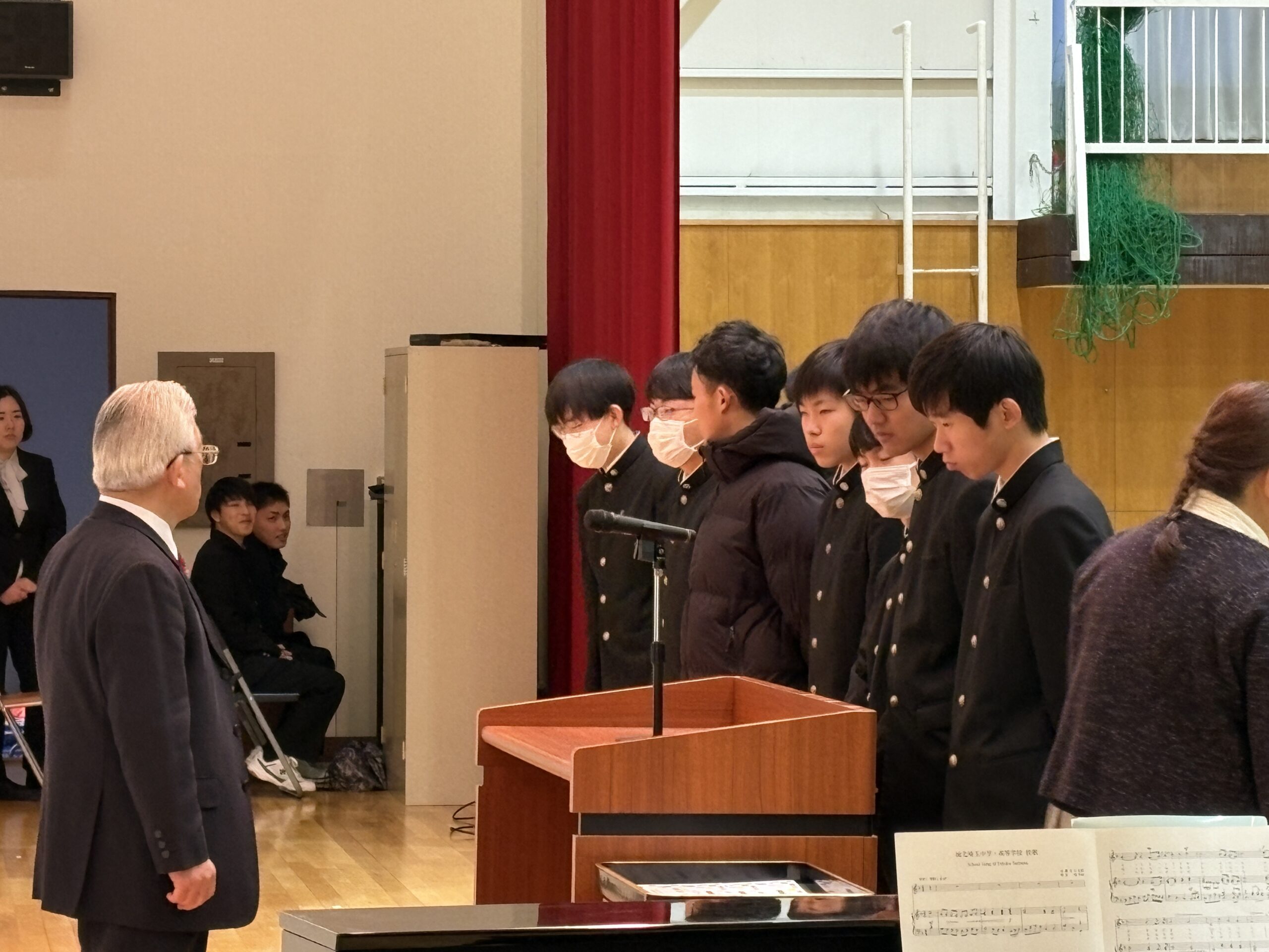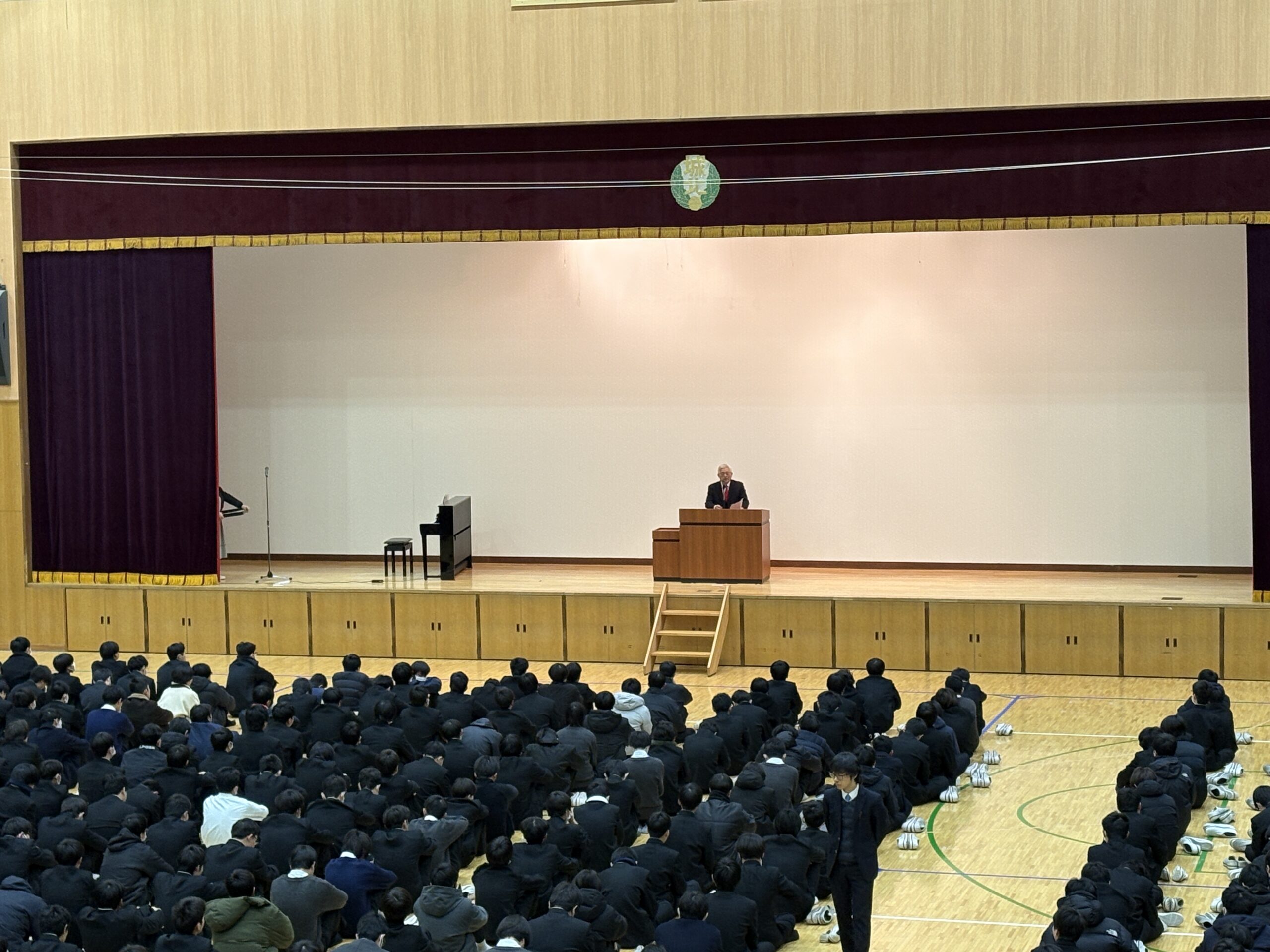 中学生から高校2年生は体育館にて校歌斉唱、入試広報部長講話、校長講話、表彰。