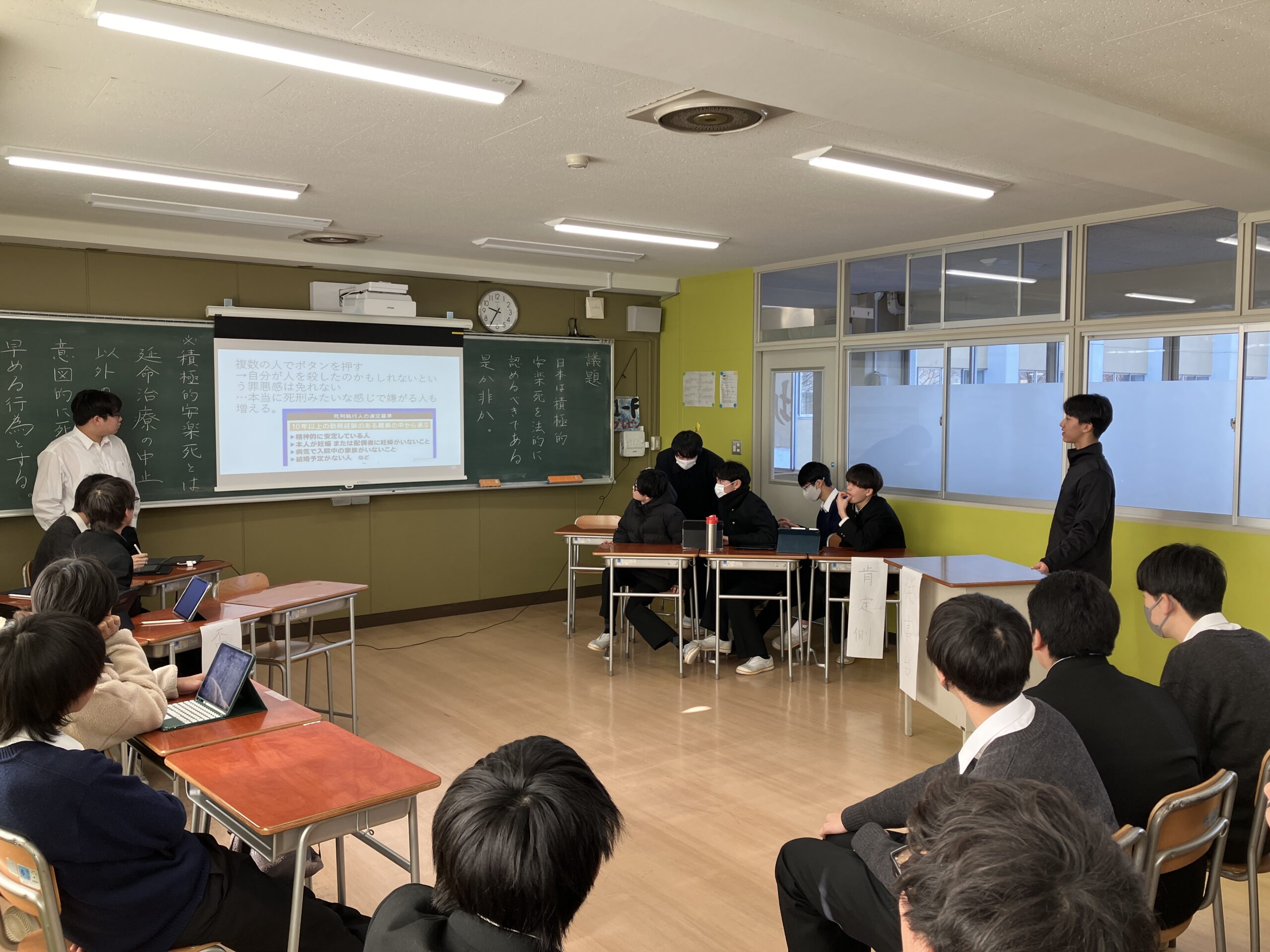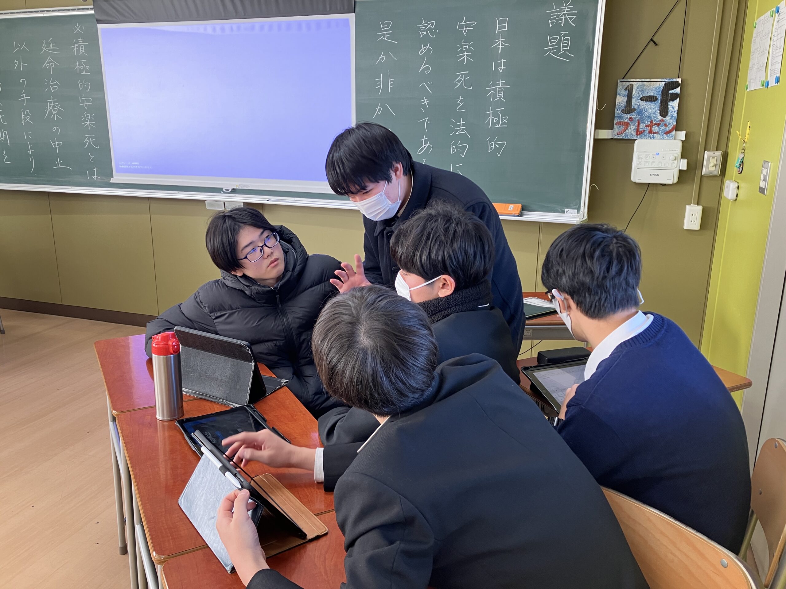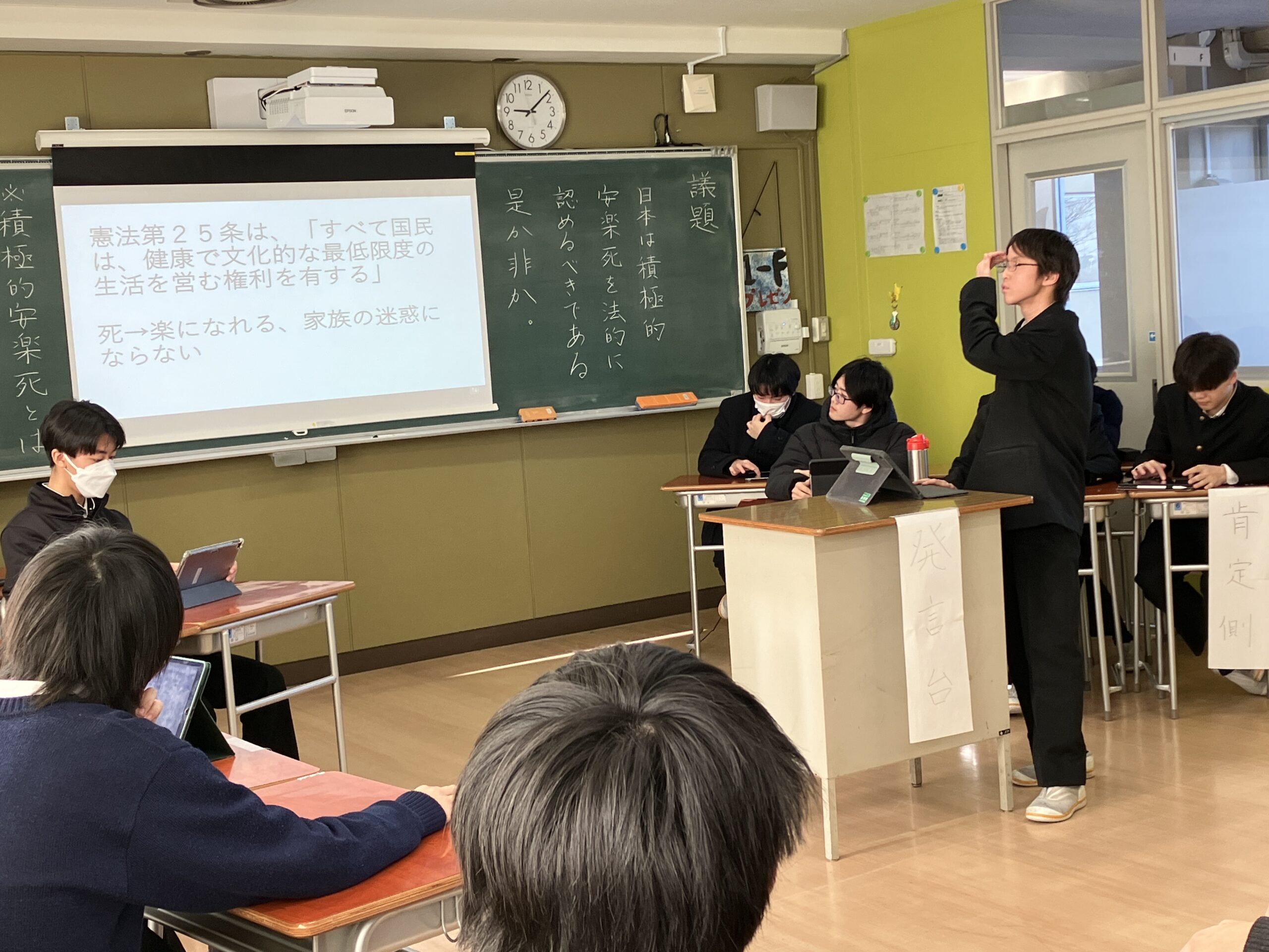 高校1年フロンティアコースの「現代の国語」の授業において、現在日本が抱える社会課題をテーマにディベートを実施しています。