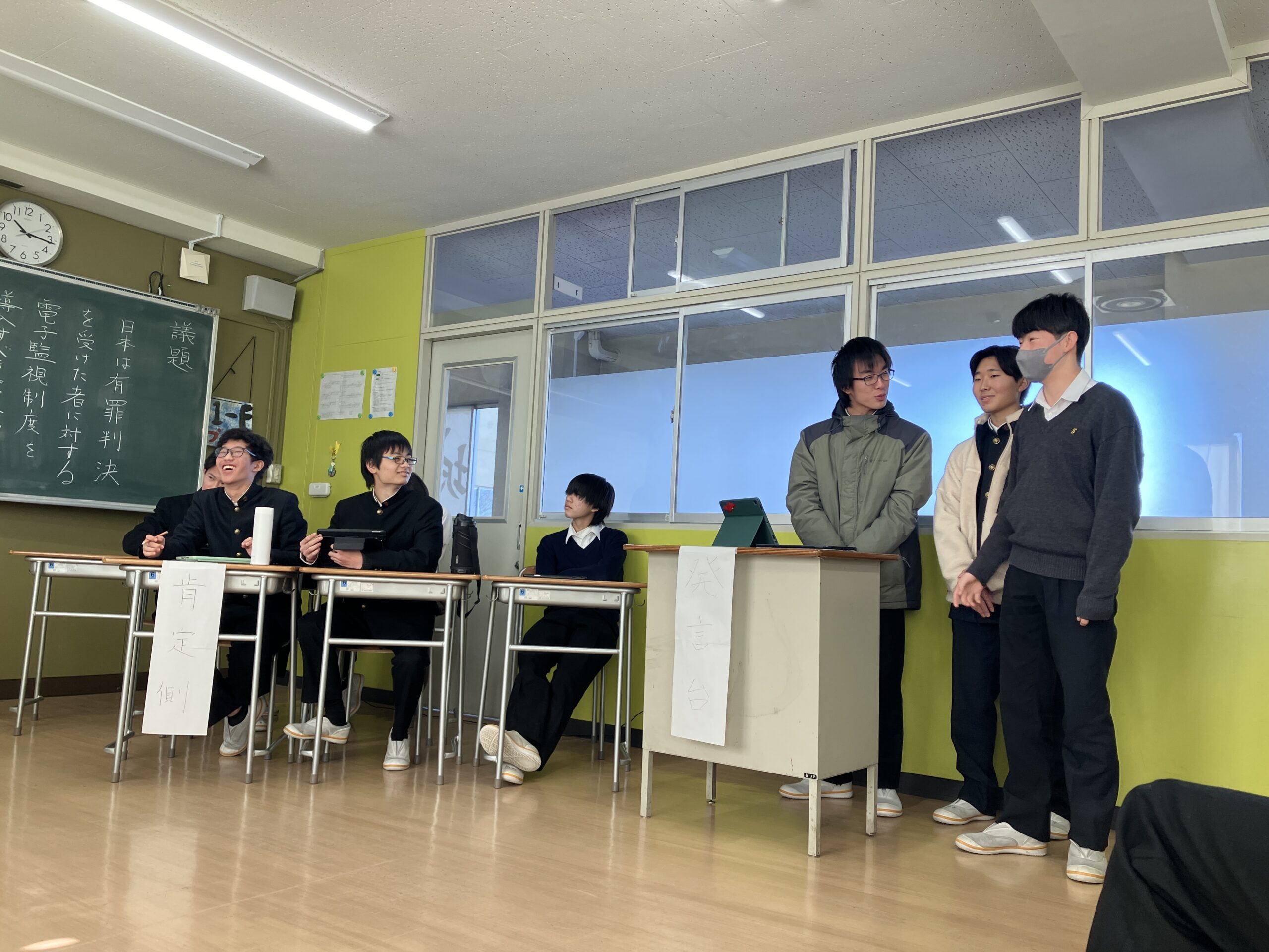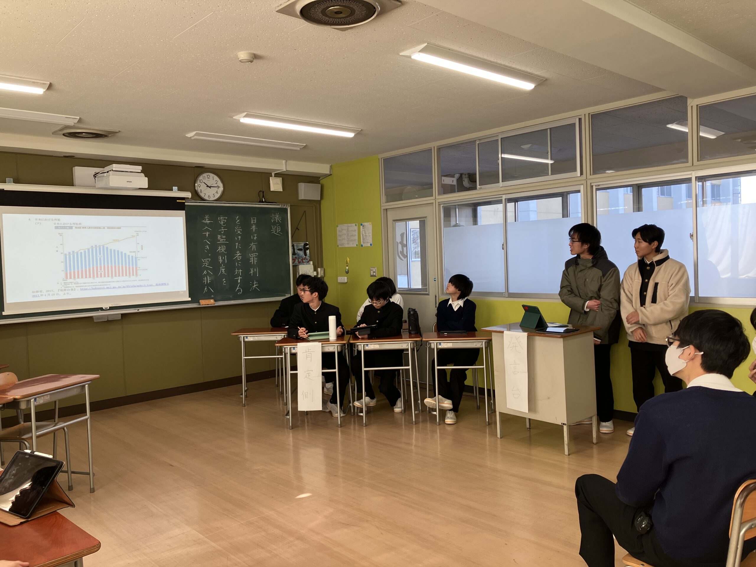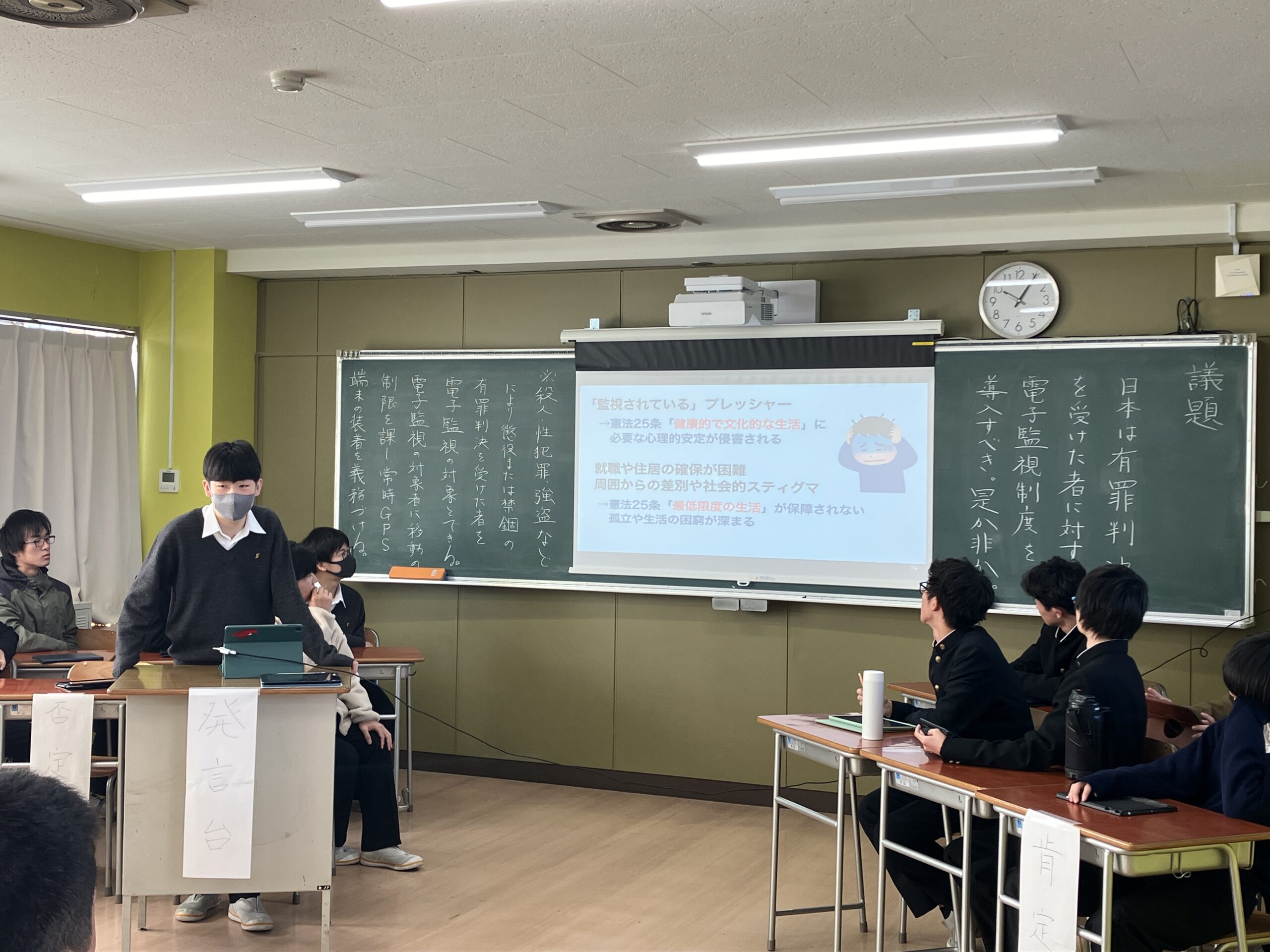 第一回目は「日本は積極的安楽死を法的に認めるべきである。是か非か」「日本は有罪判決を受けた者に対する電子監視制度を導入すべきである。是か非か」の2つのテーマで実施しました。難解なテーマではありましたが、生徒たちは主体的に活動し、積極的に議論に取り組んでいました。