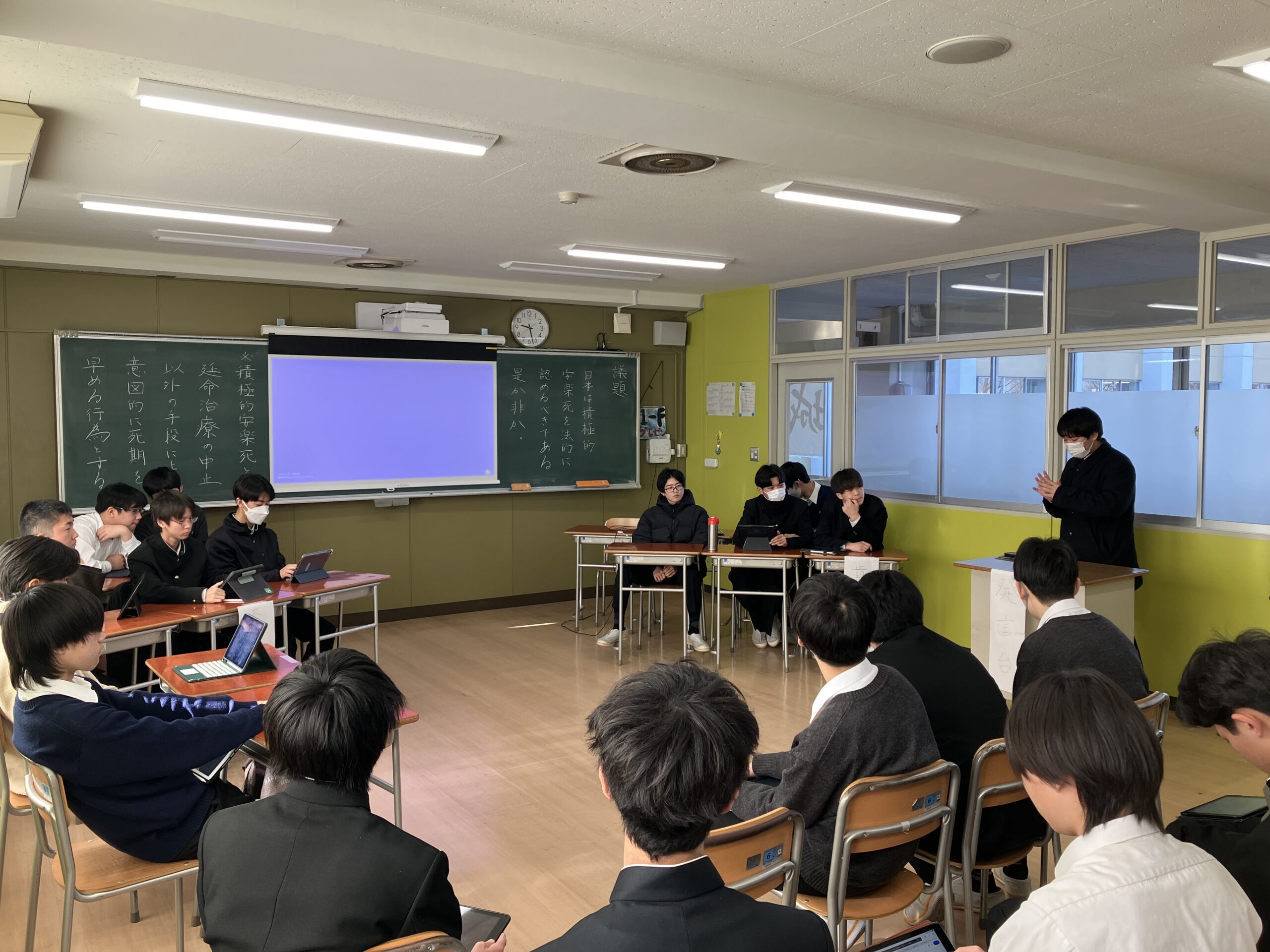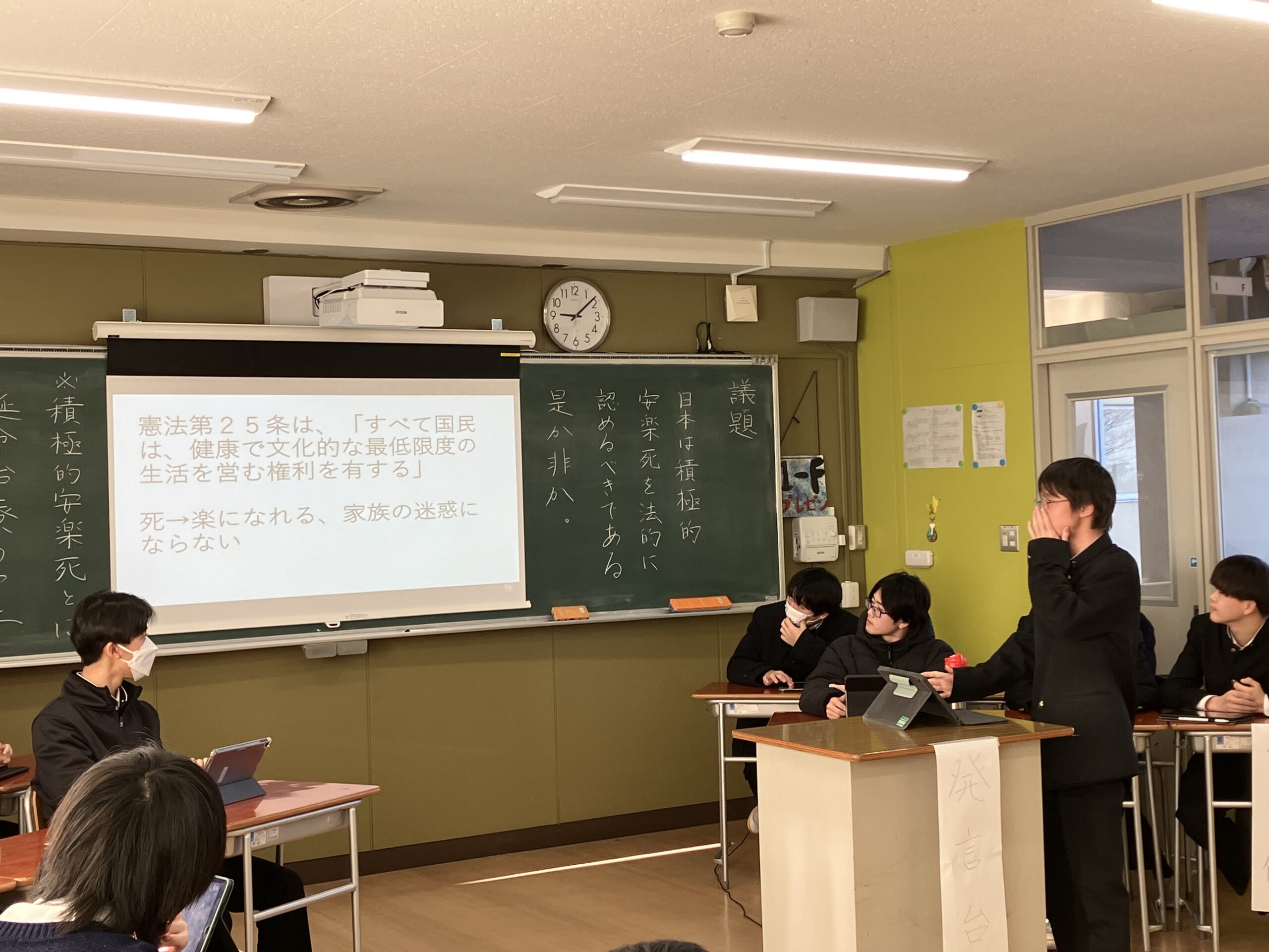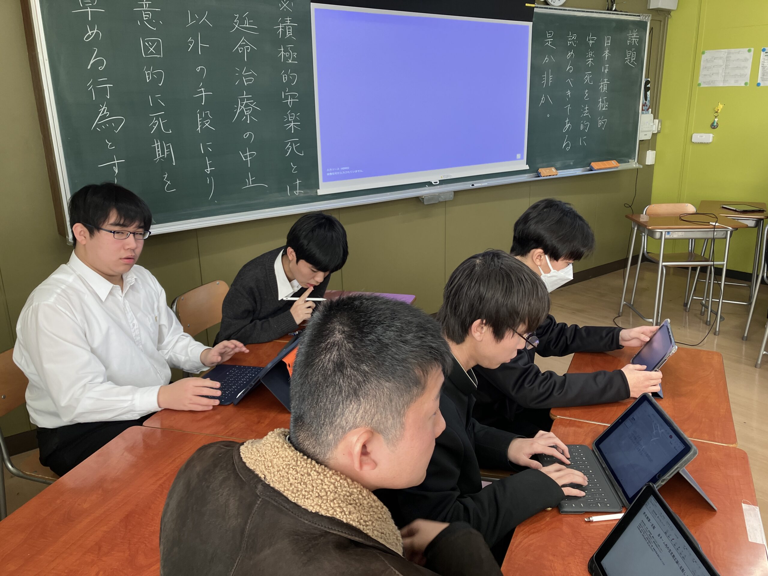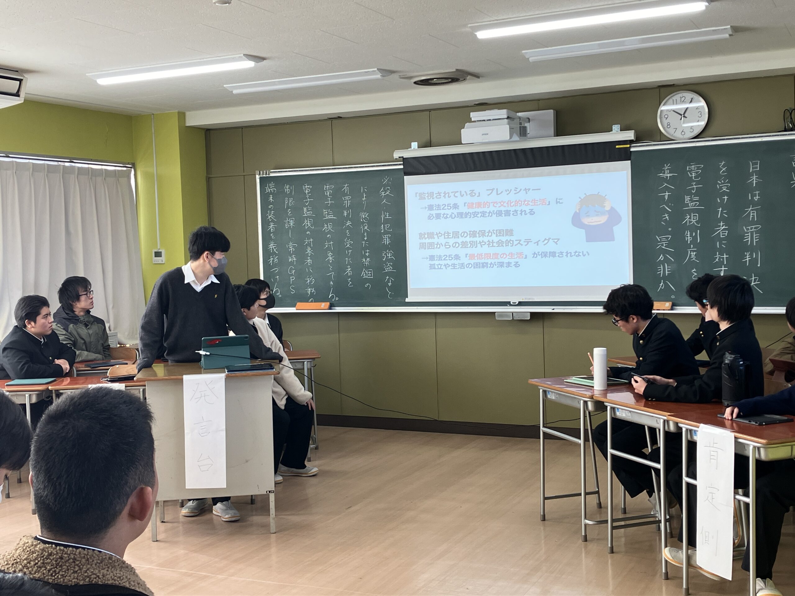 第一回目は「日本は積極的安楽死を法的に認めるべきである。是か非か」「日本は有罪判決を受けた者に対する電子監視制度を導入すべきである。是か非か」の2つのテーマで実施しました。難解なテーマではありましたが、生徒たちは主体的に活動し、積極的に議論に取り組んでいました。