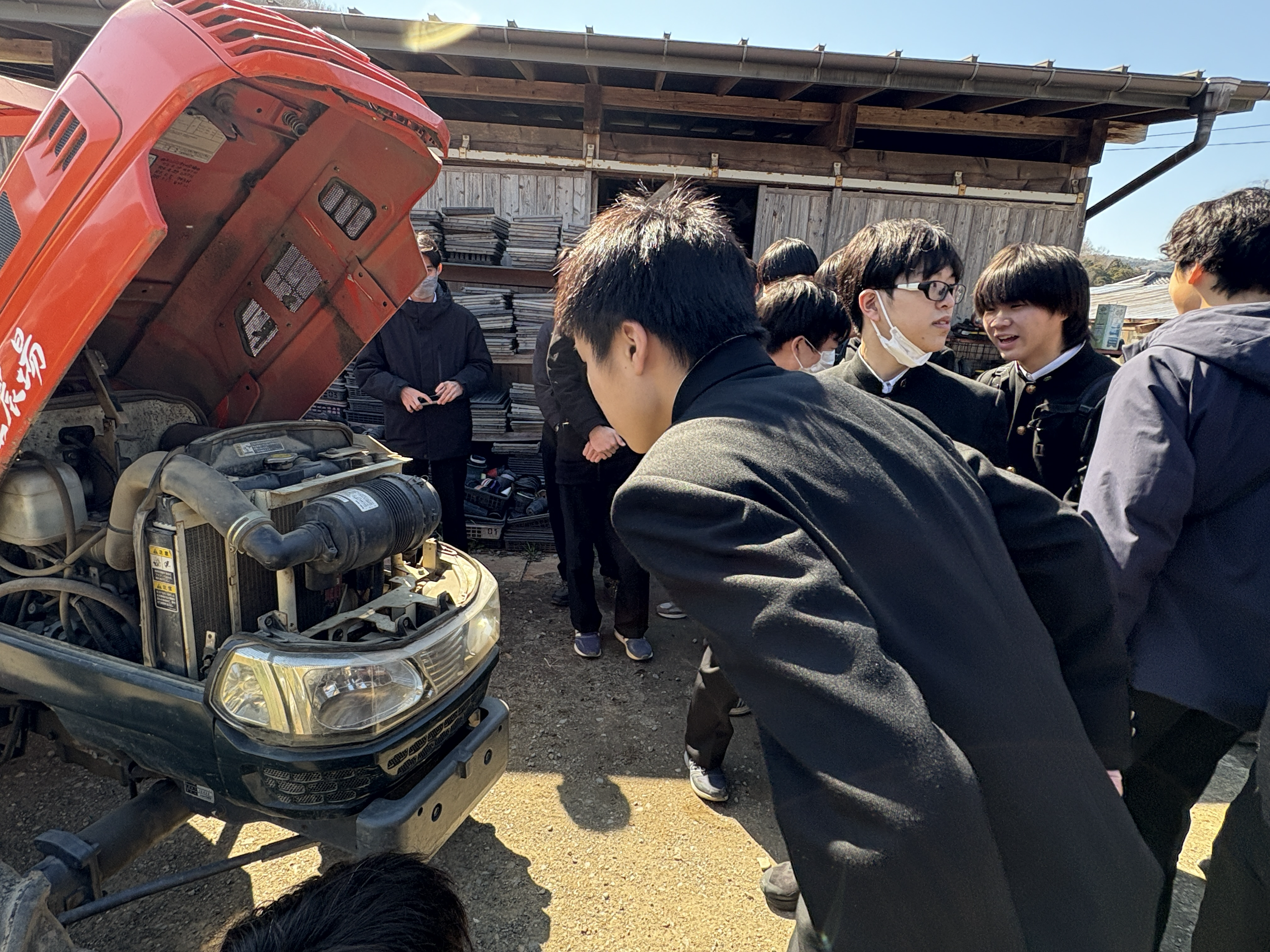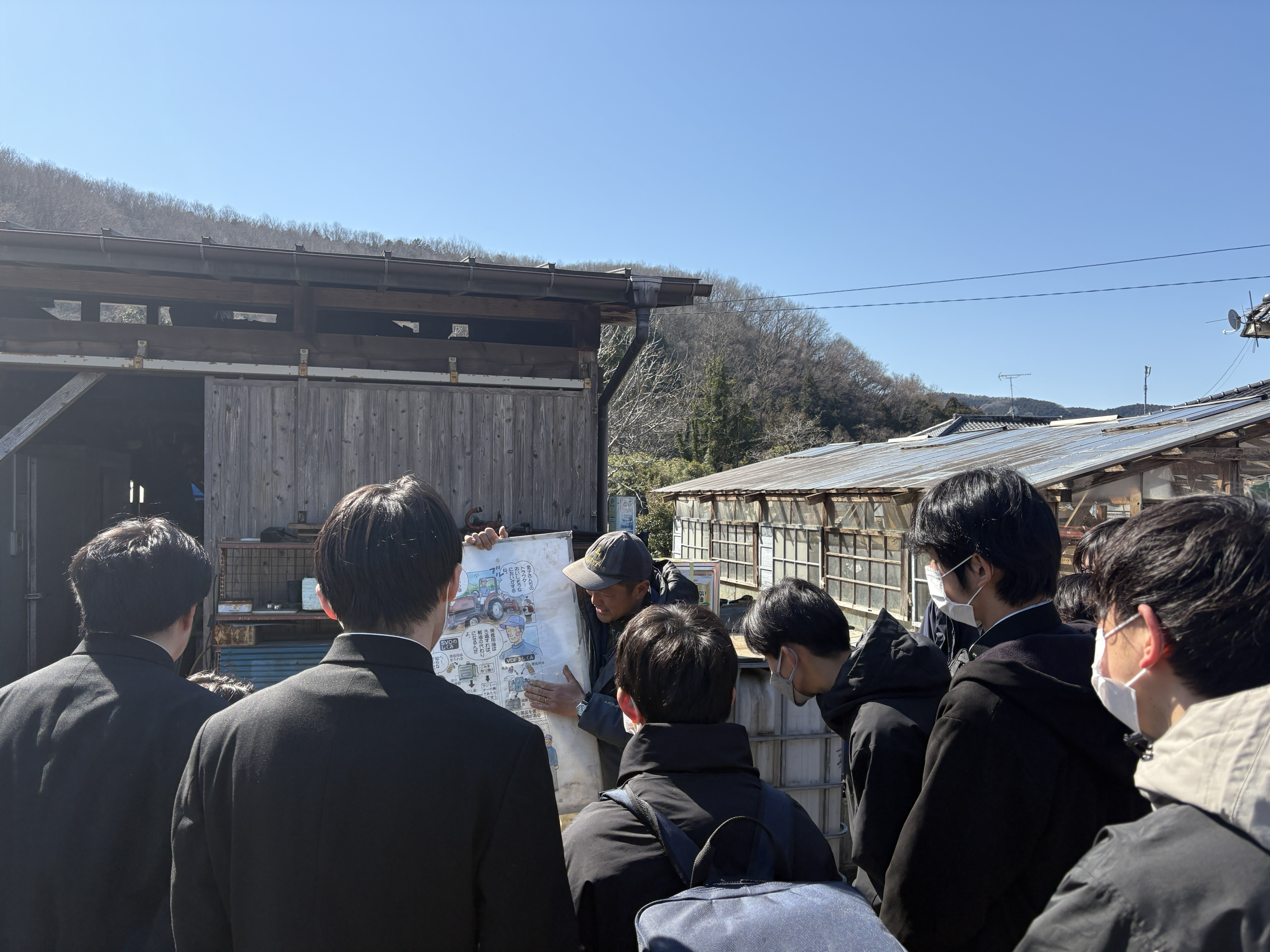 見学を通して、生徒たちは実際に土に触れ、微生物の力を目の当たりにしました。さらに、廃棄予定だったてんぷら油を燃料とする発電機やトラクターを見学し、無駄を出さずにエネルギーを活用する工夫に驚きの声が上がりました。