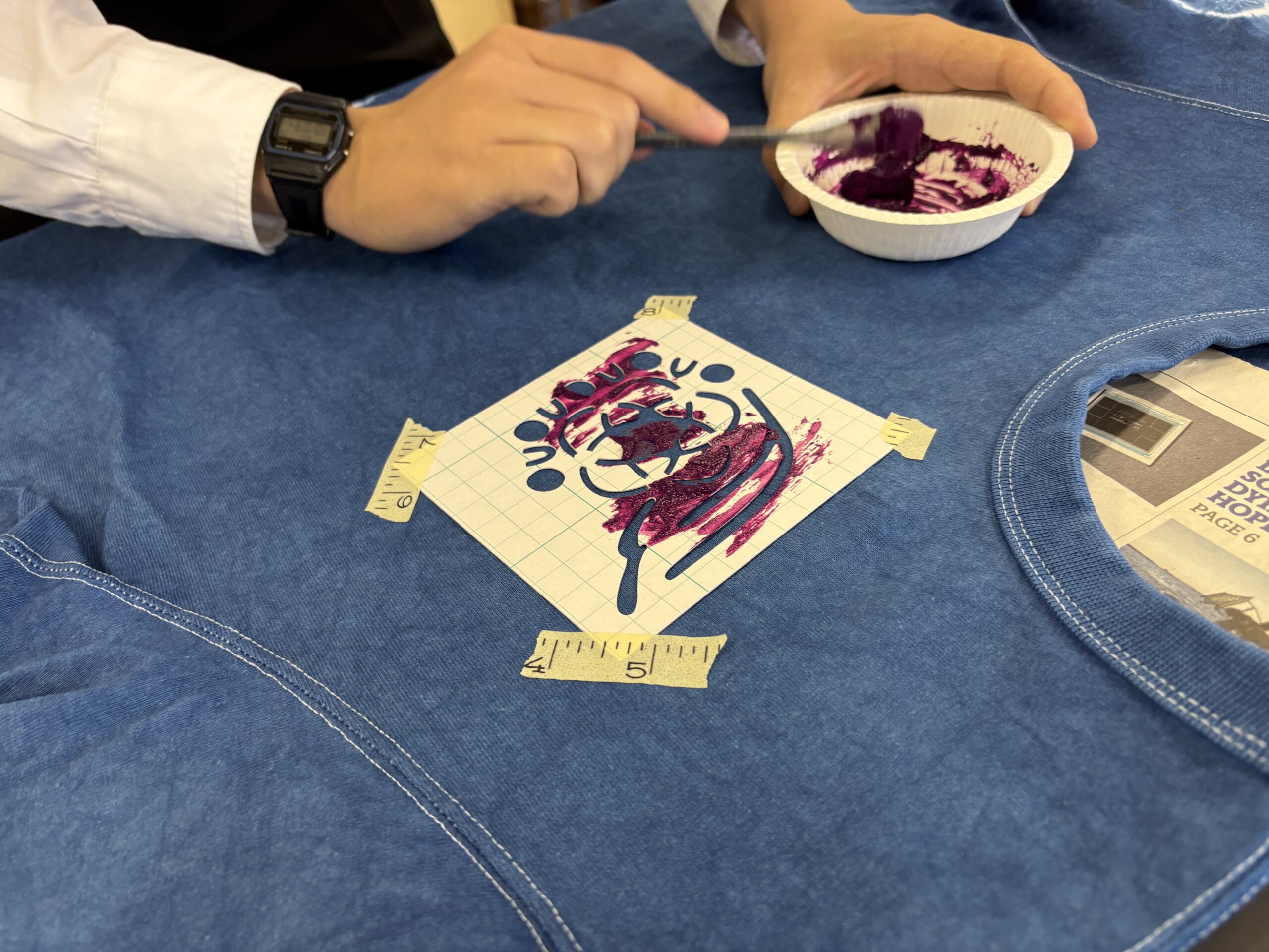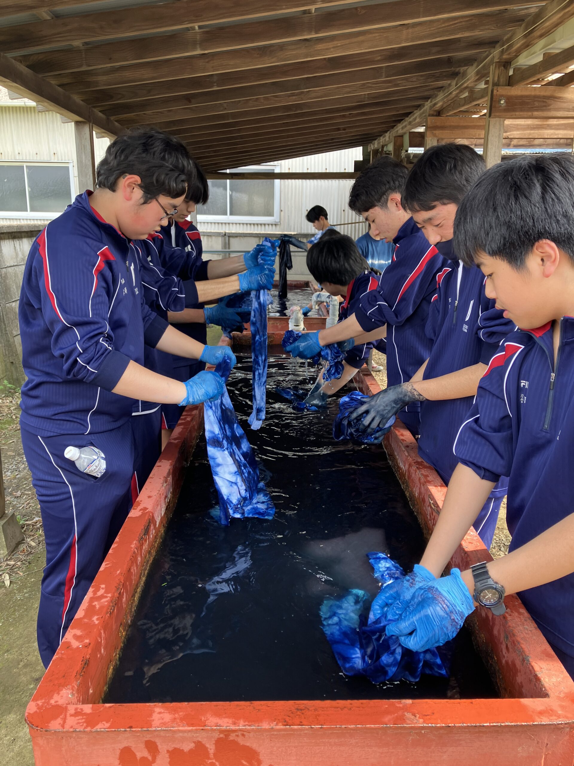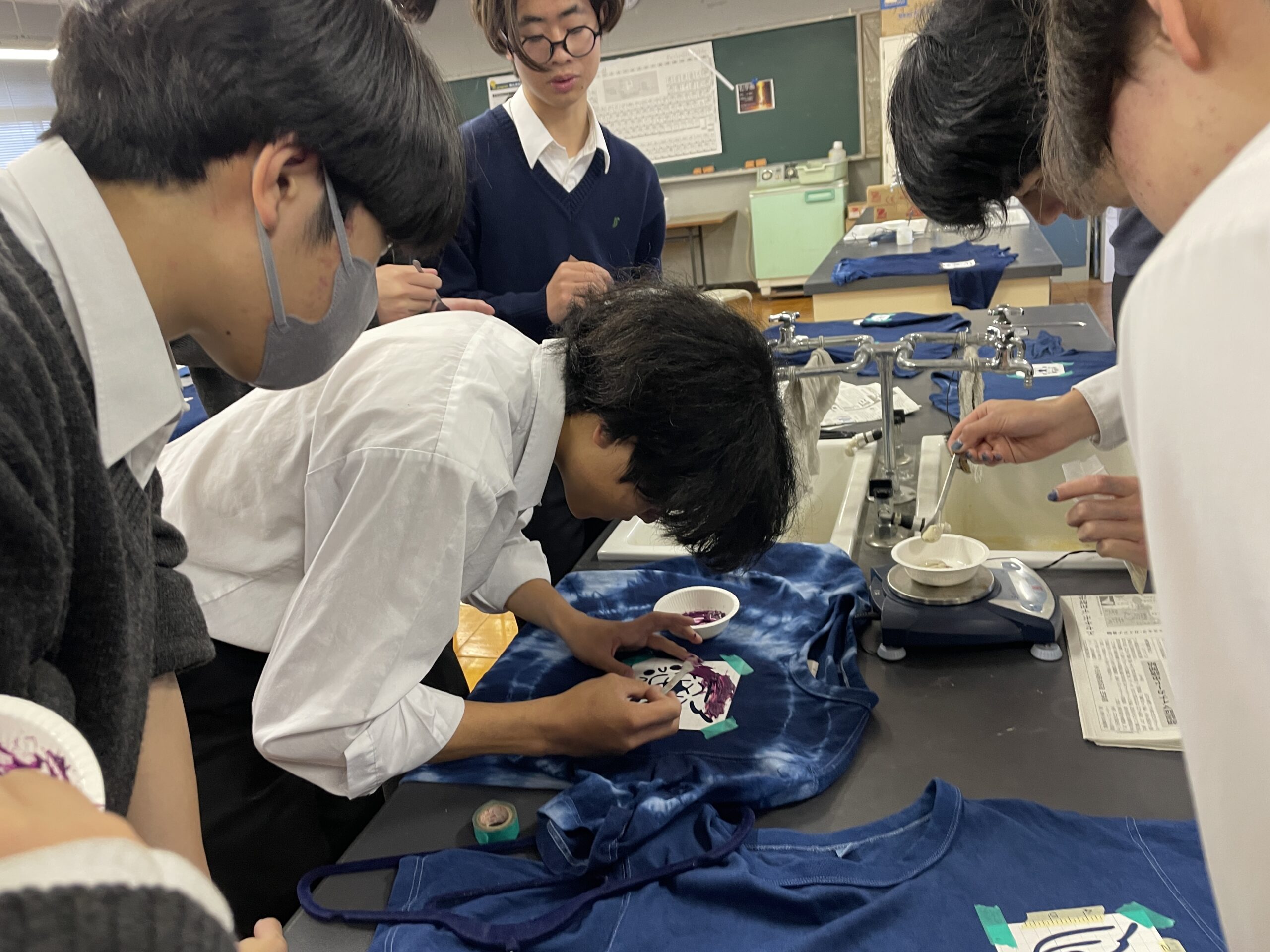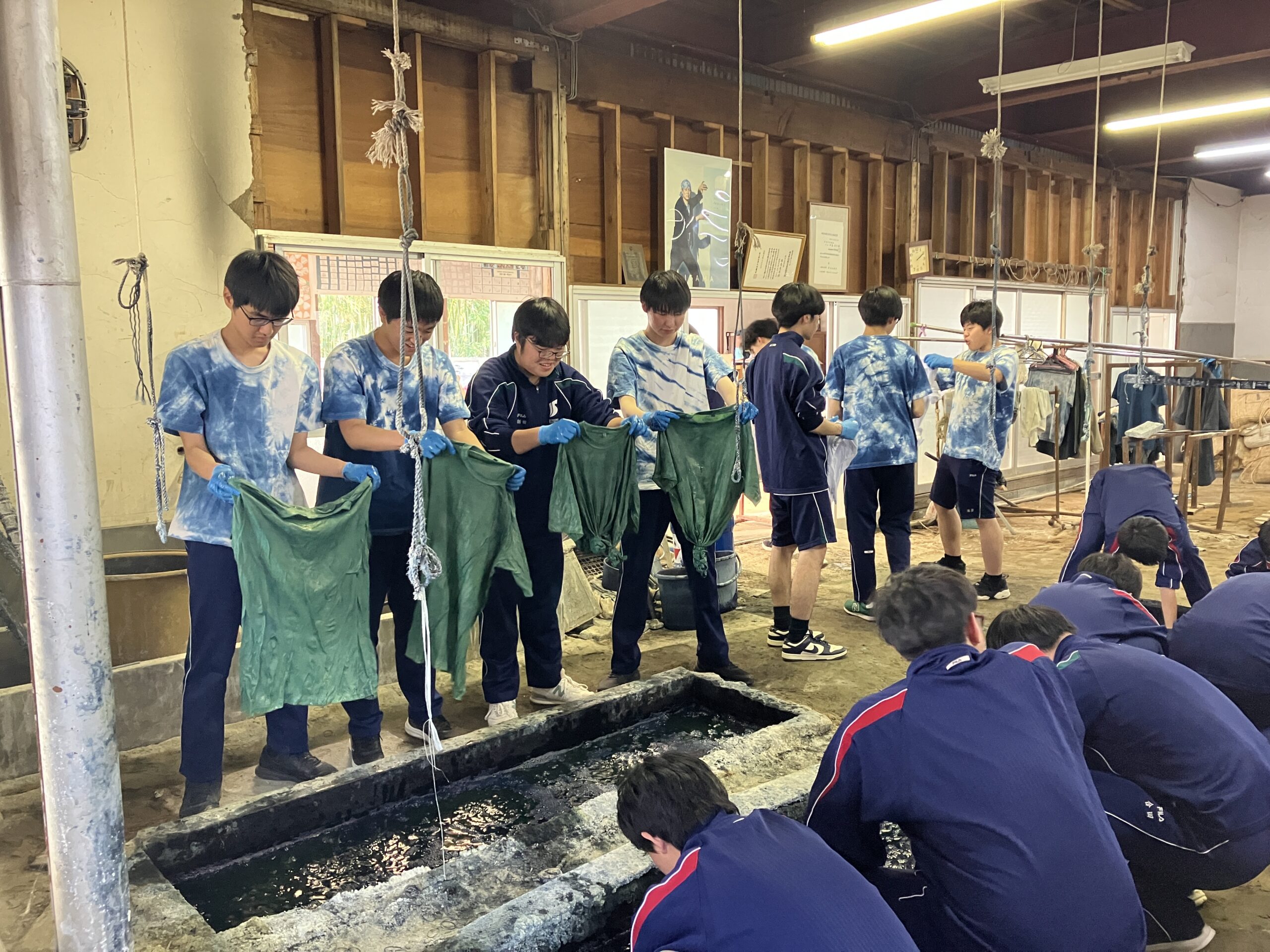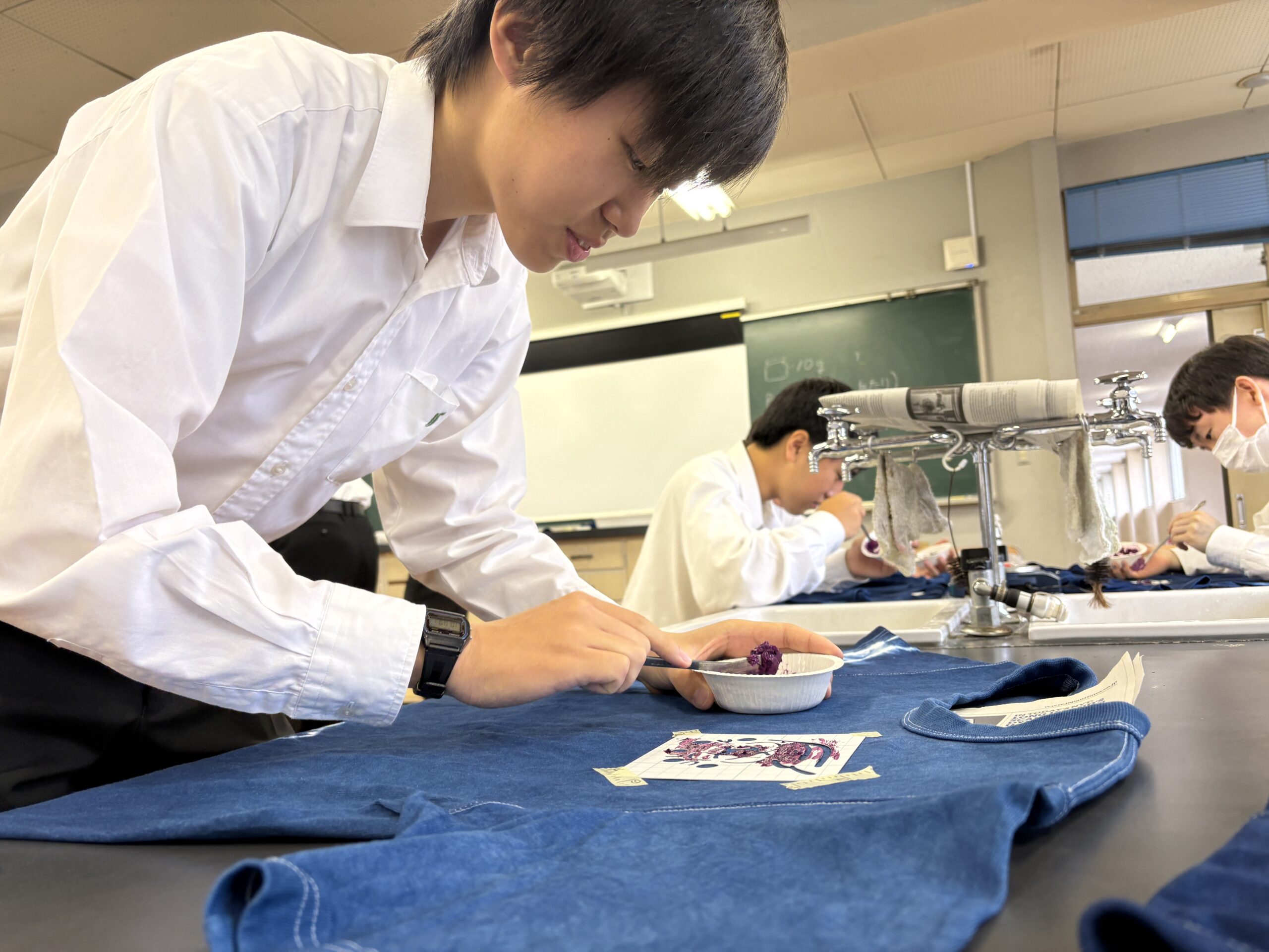 今年のフロンティアコースの3年生たちは、新たな試みに挑戦しました。それが「抜染(ばっせん)」という技法です。抜染とは、染め上げた布地の一部を化学的に脱色し、模様や文字を浮かび上がらせる伝統的な染色技法のひとつ。あえて“色を抜く”ことで、藍の深みの中に新たな表現が生まれます。