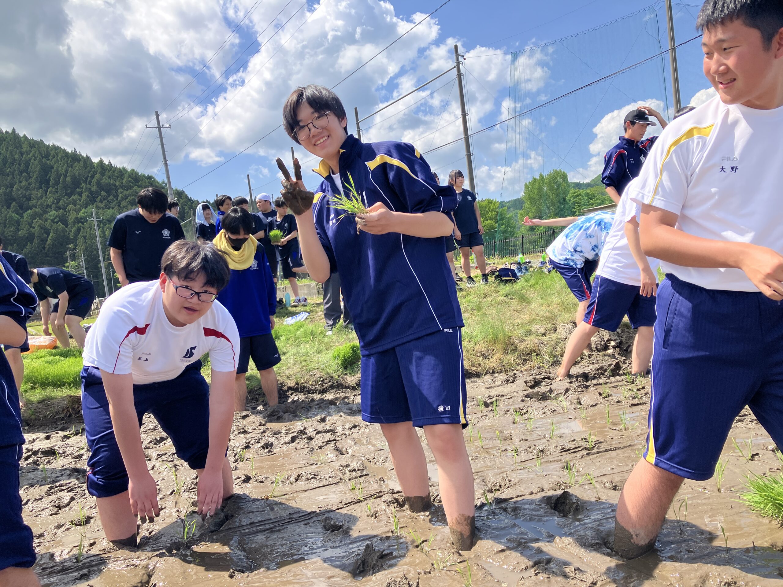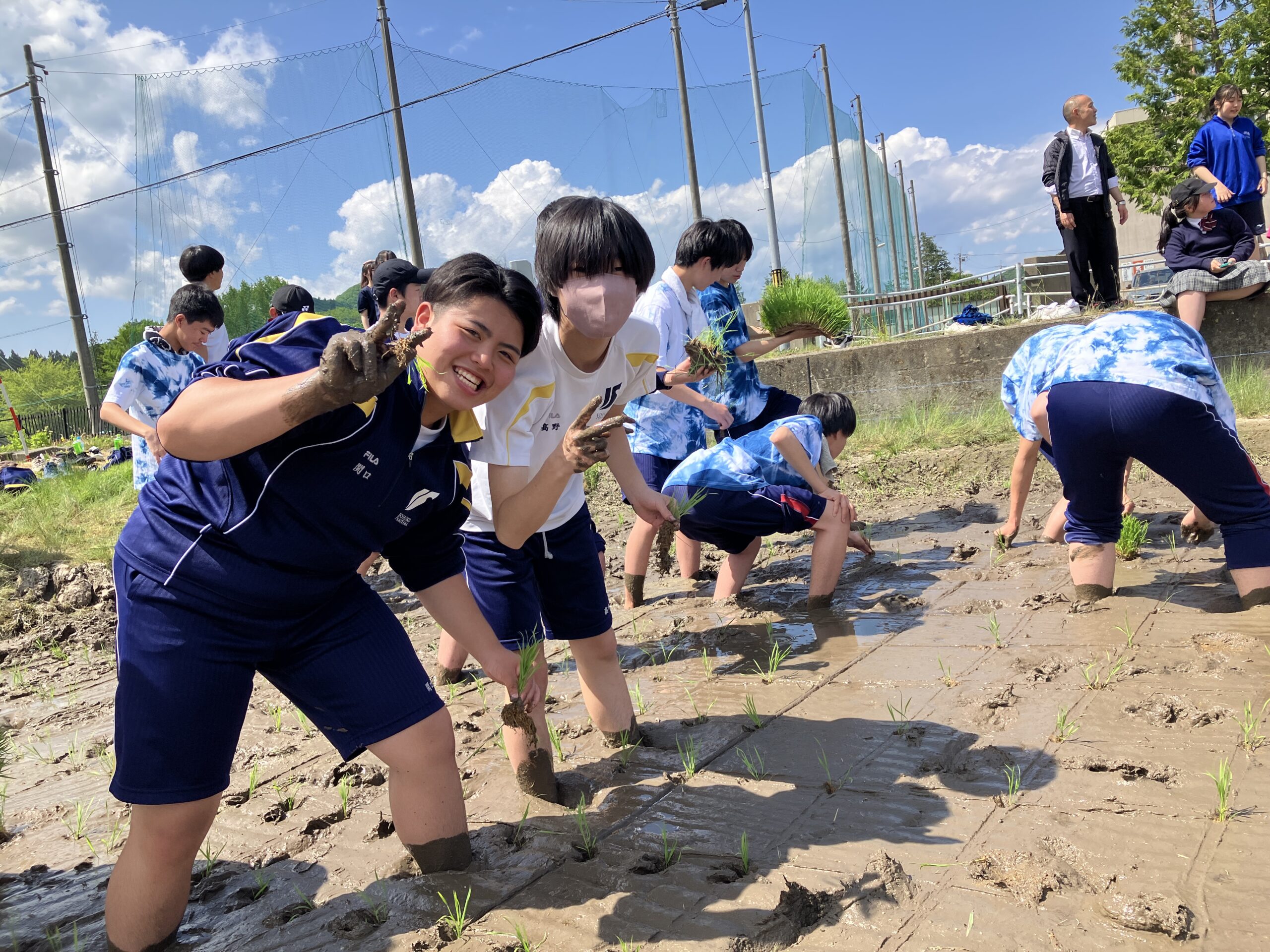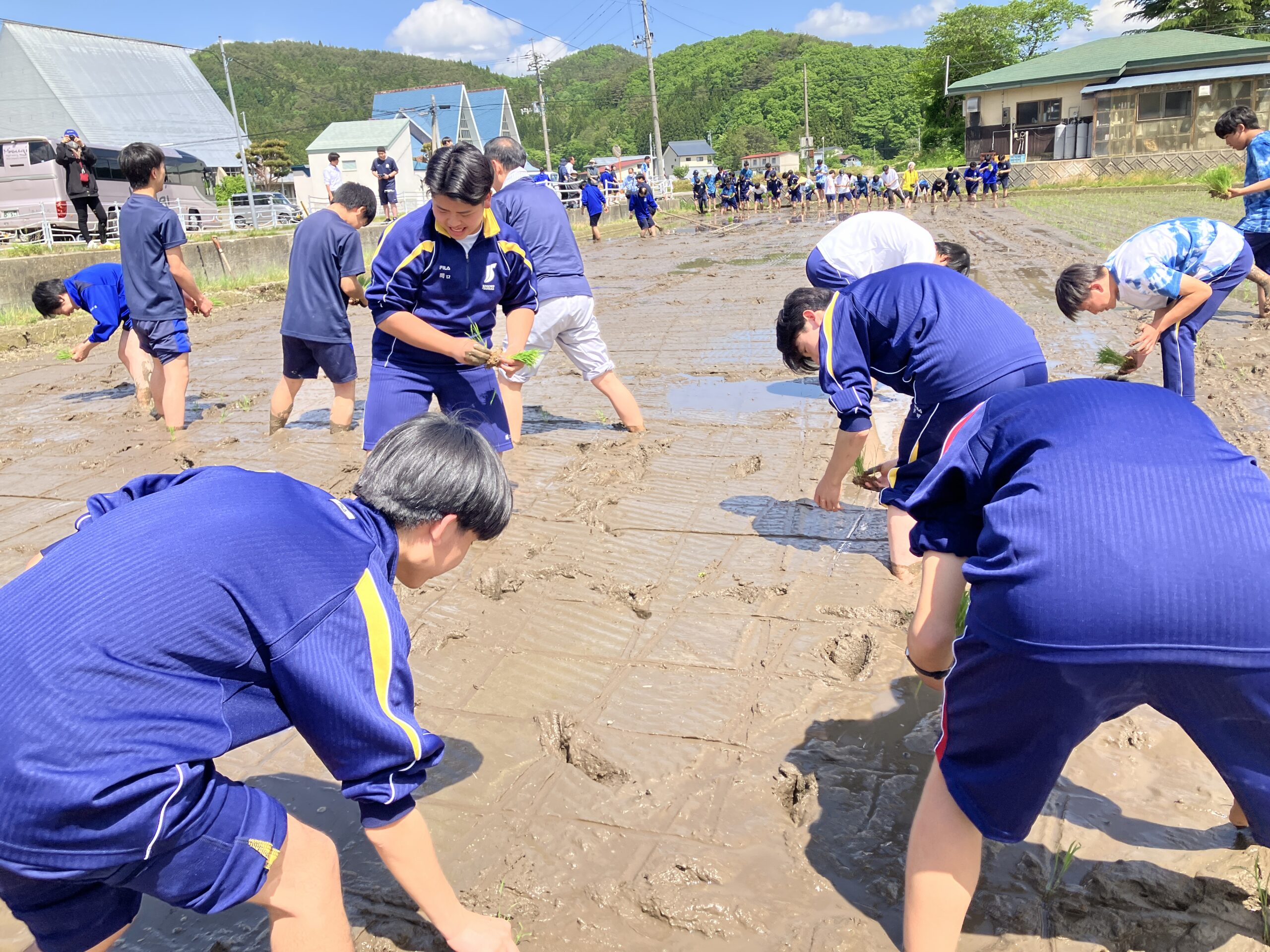 いよいよ待ちに待った湖南高校との交流です。昨年度は雨のため田植えが中止となってしまいました。1年生はもちろん、2年生にとっても初めての田植えです。