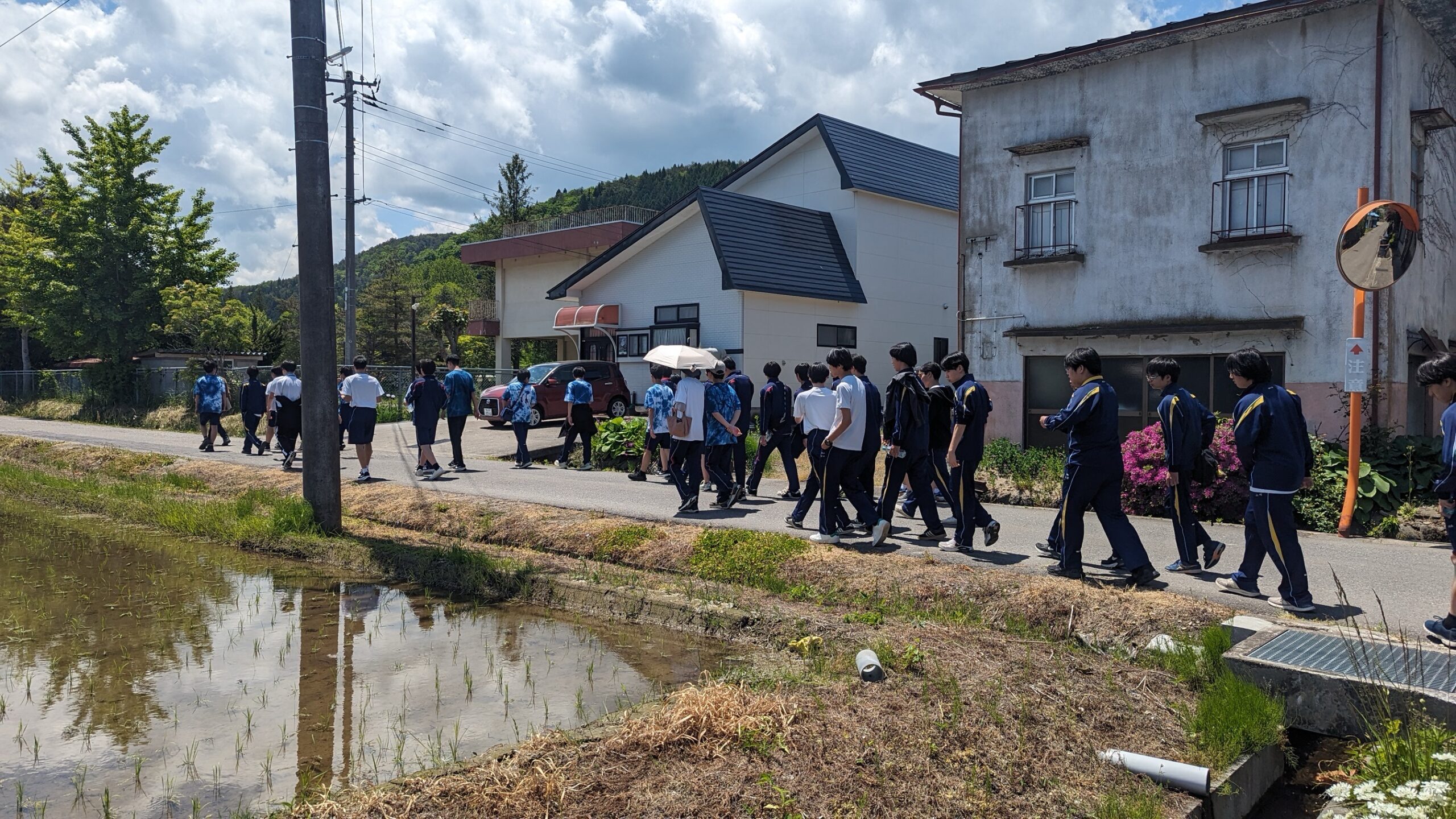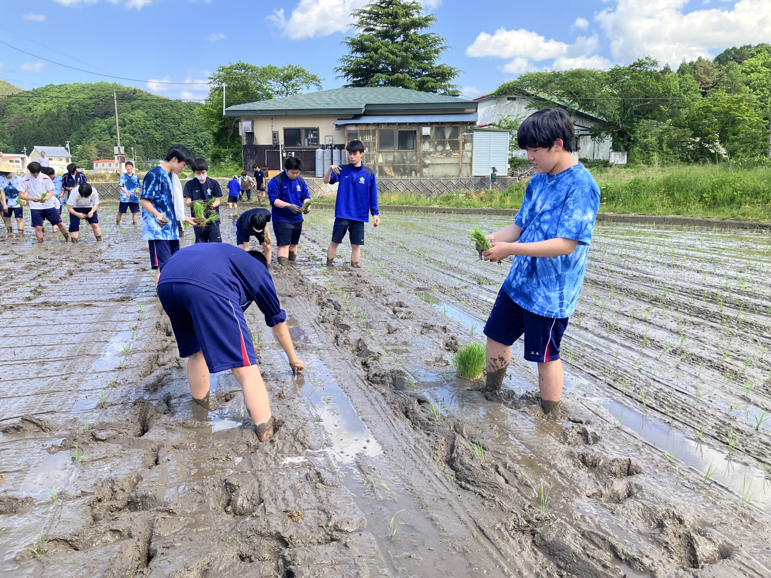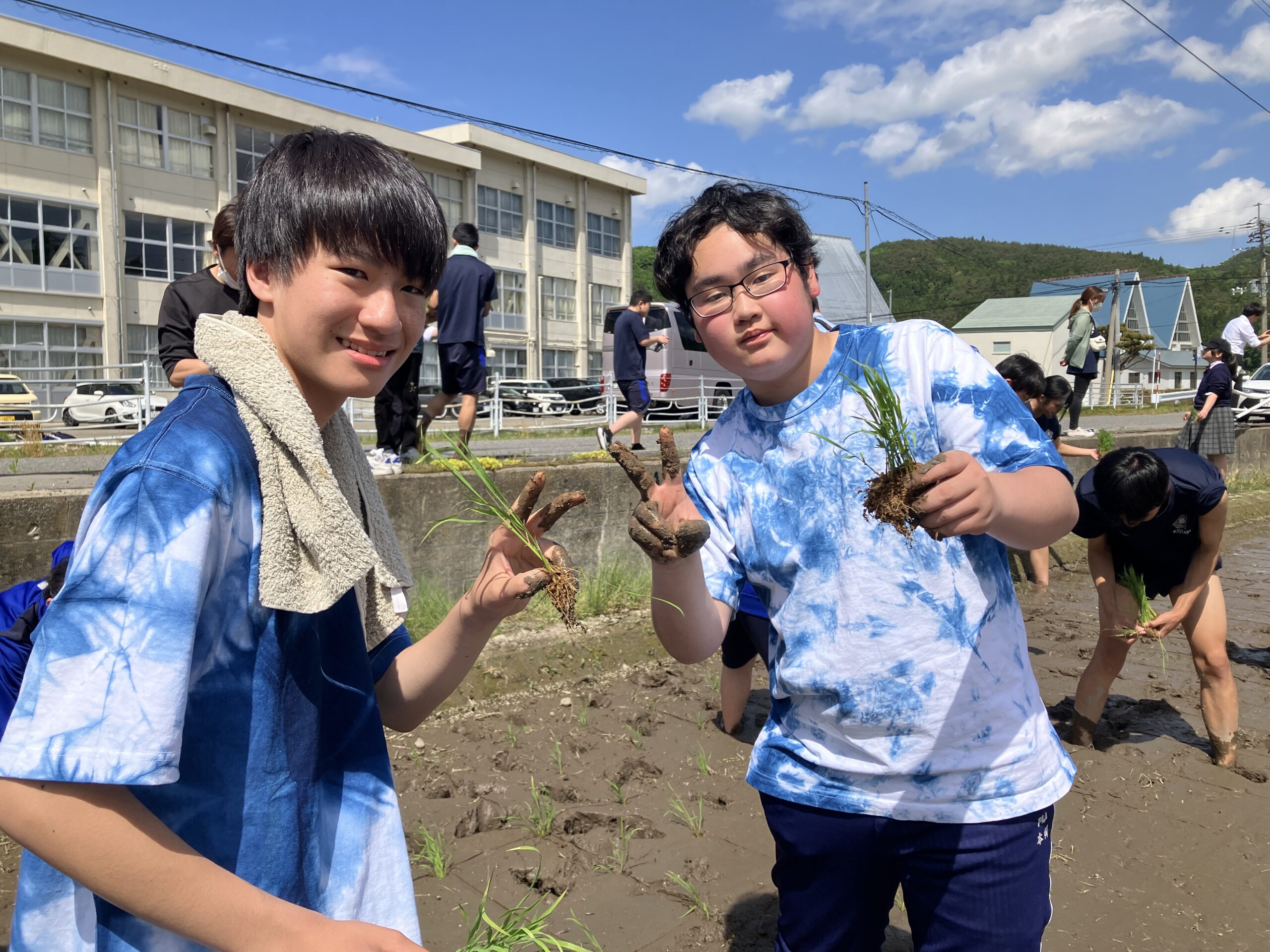 いよいよ待ちに待った湖南高校との交流です。昨年度は雨のため田植えが中止となってしまいました。1年生はもちろん、2年生にとっても初めての田植えです。