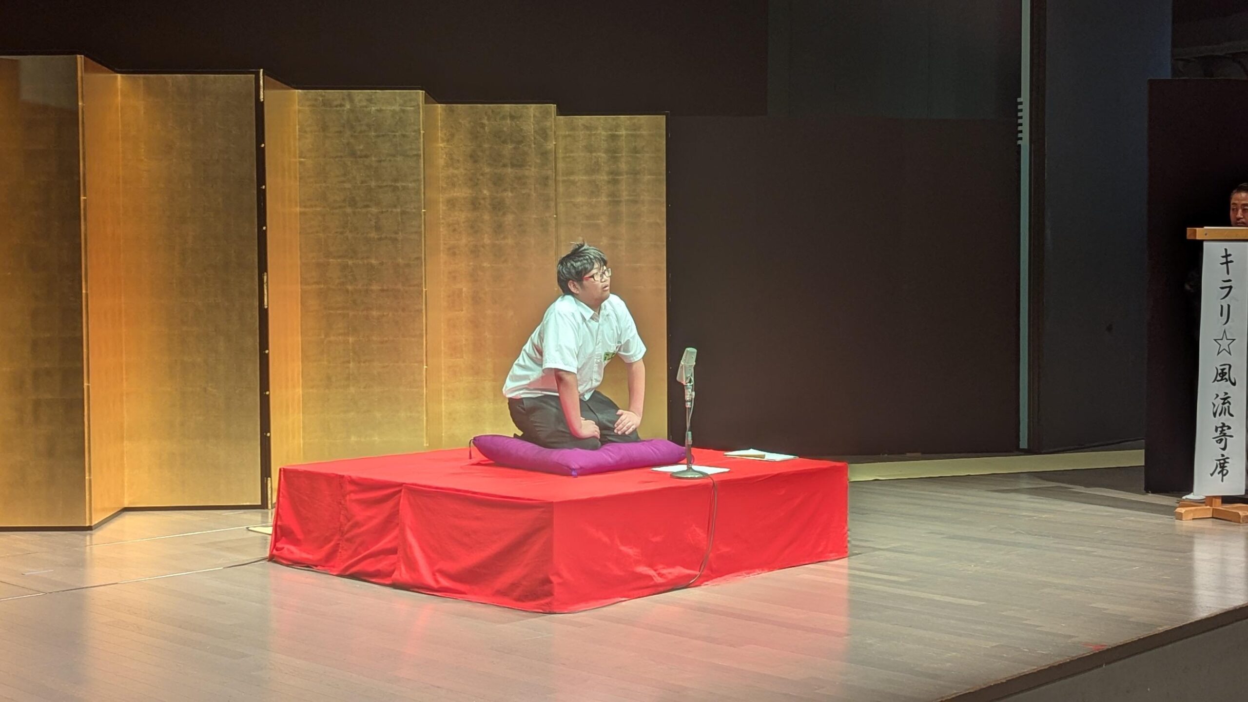 今年は初めての試みとして、「落語、やってみる!?」というワークショップが公演前に開催されました。生徒たちは実際に高座にあがり、台詞を覚えて短い落語を披露するなど、落語の世界を体感しながら学ぶ貴重な時間となりました。