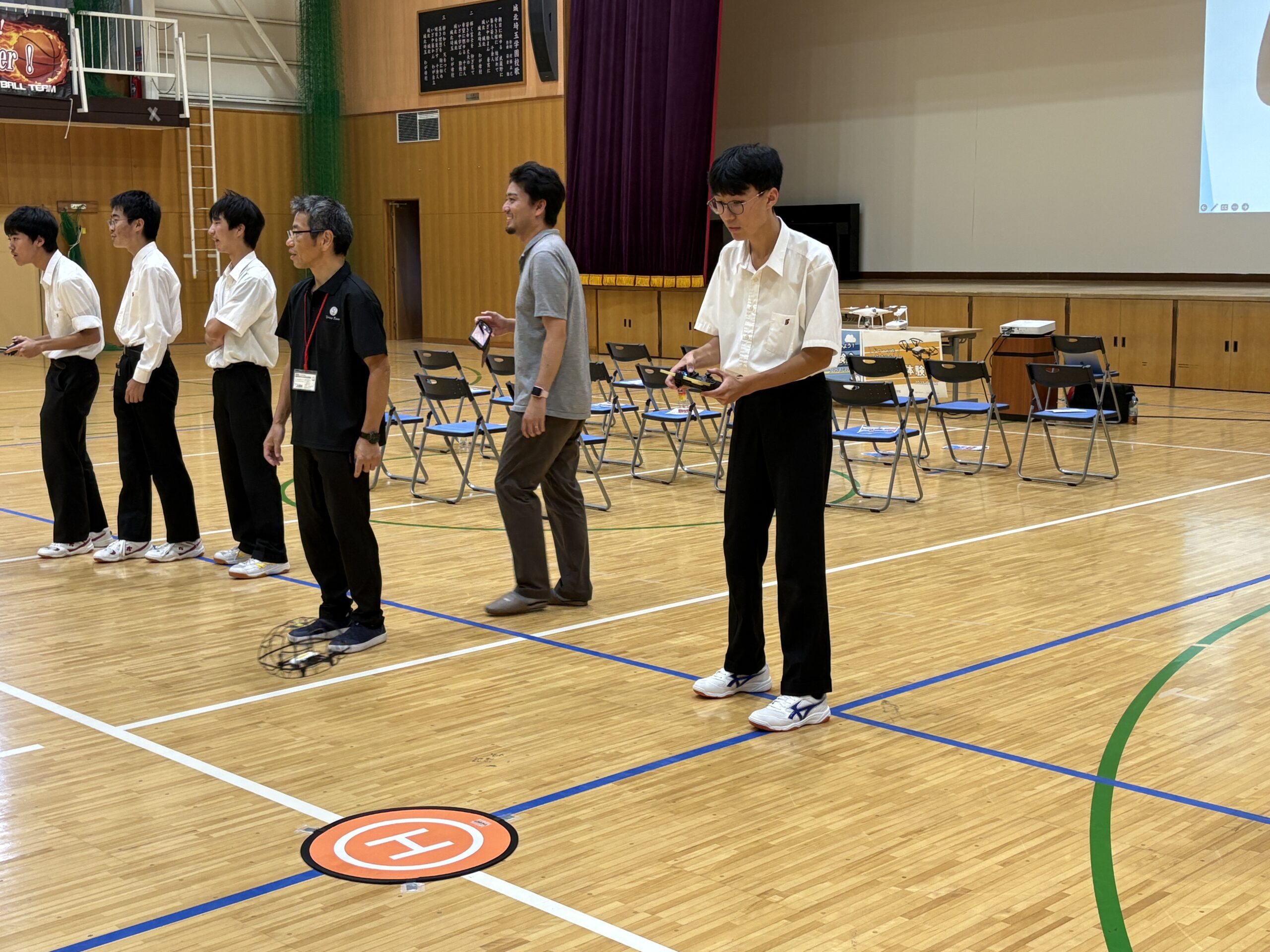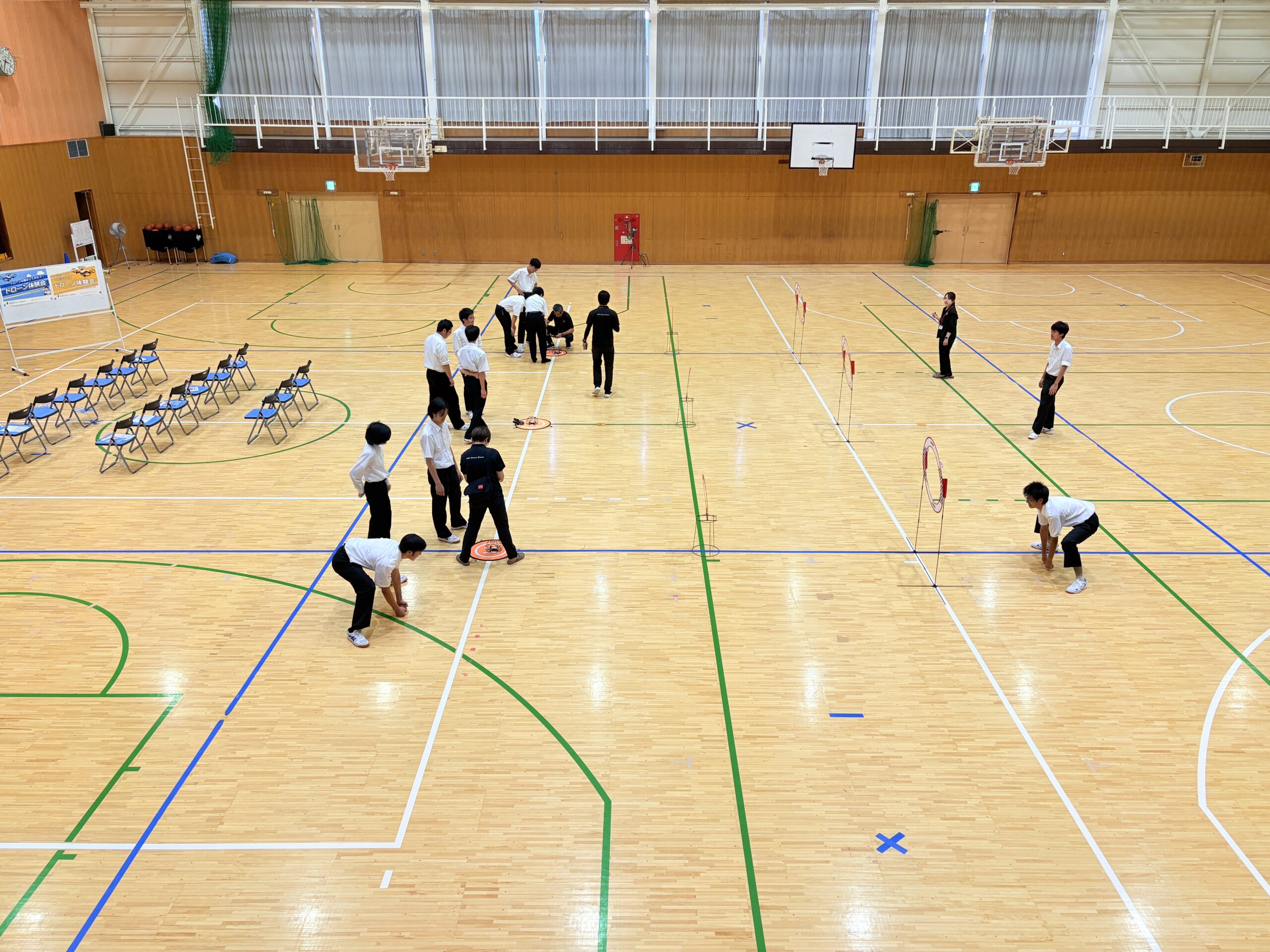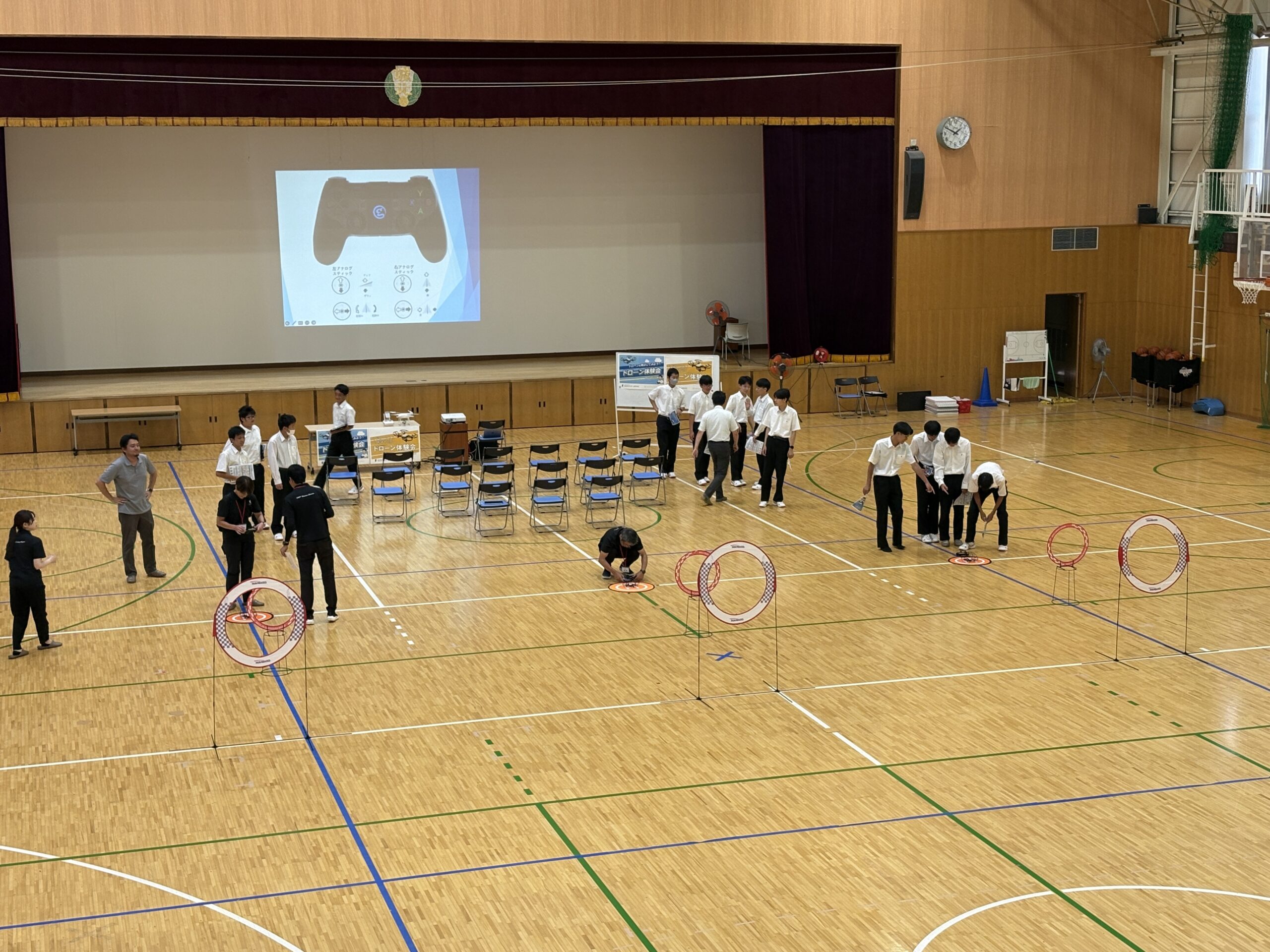 今年度は会場を広い体育館に移し、よりダイナミックな環境の中で講習が行われました。生徒たちはチームに分かれ、実際にドローンを操縦して課題をクリアする体験に挑戦。講習の後半には、ドローンレース形式のチーム対抗戦も開催され、会場は大いに盛り上がりました。