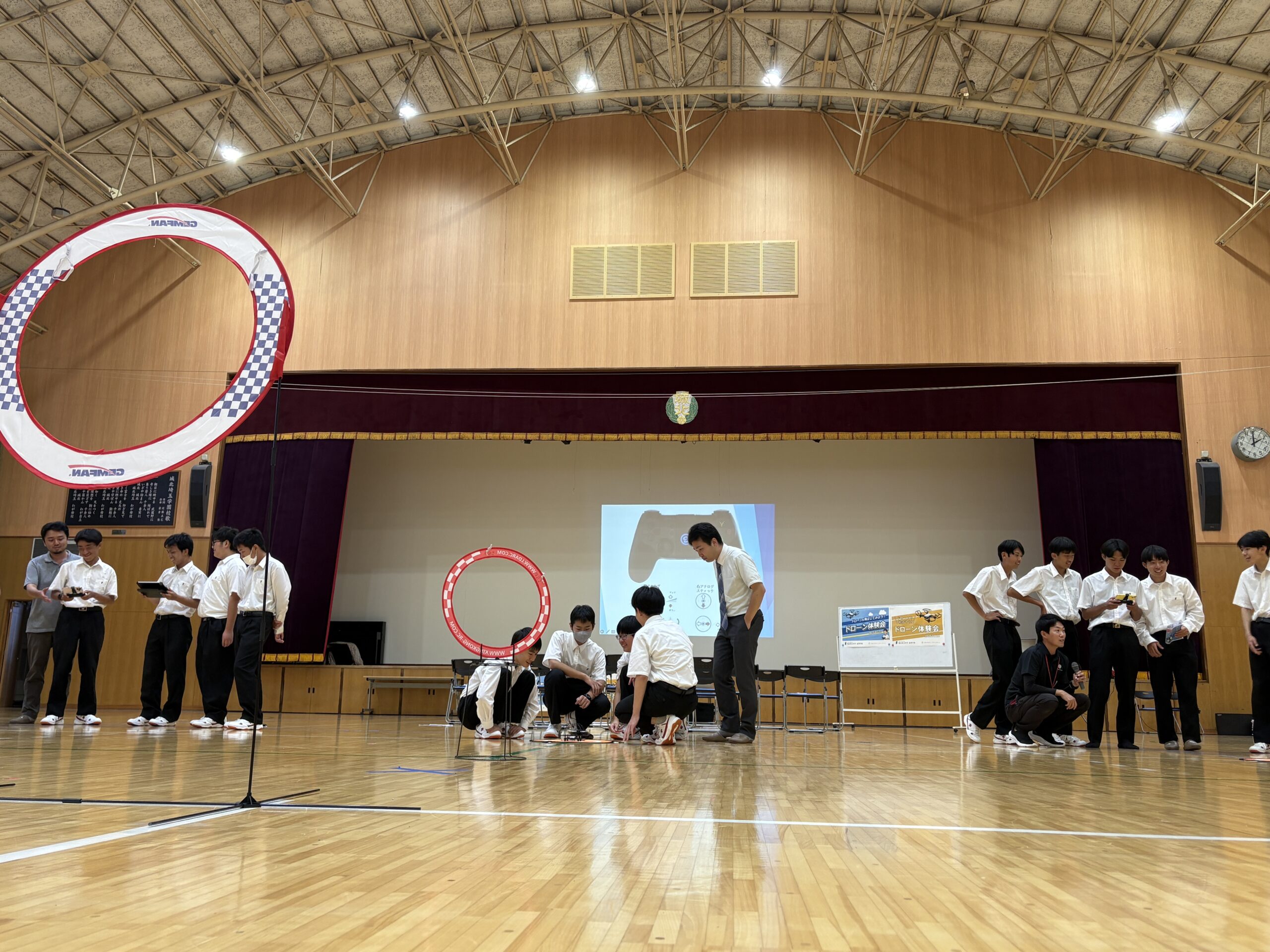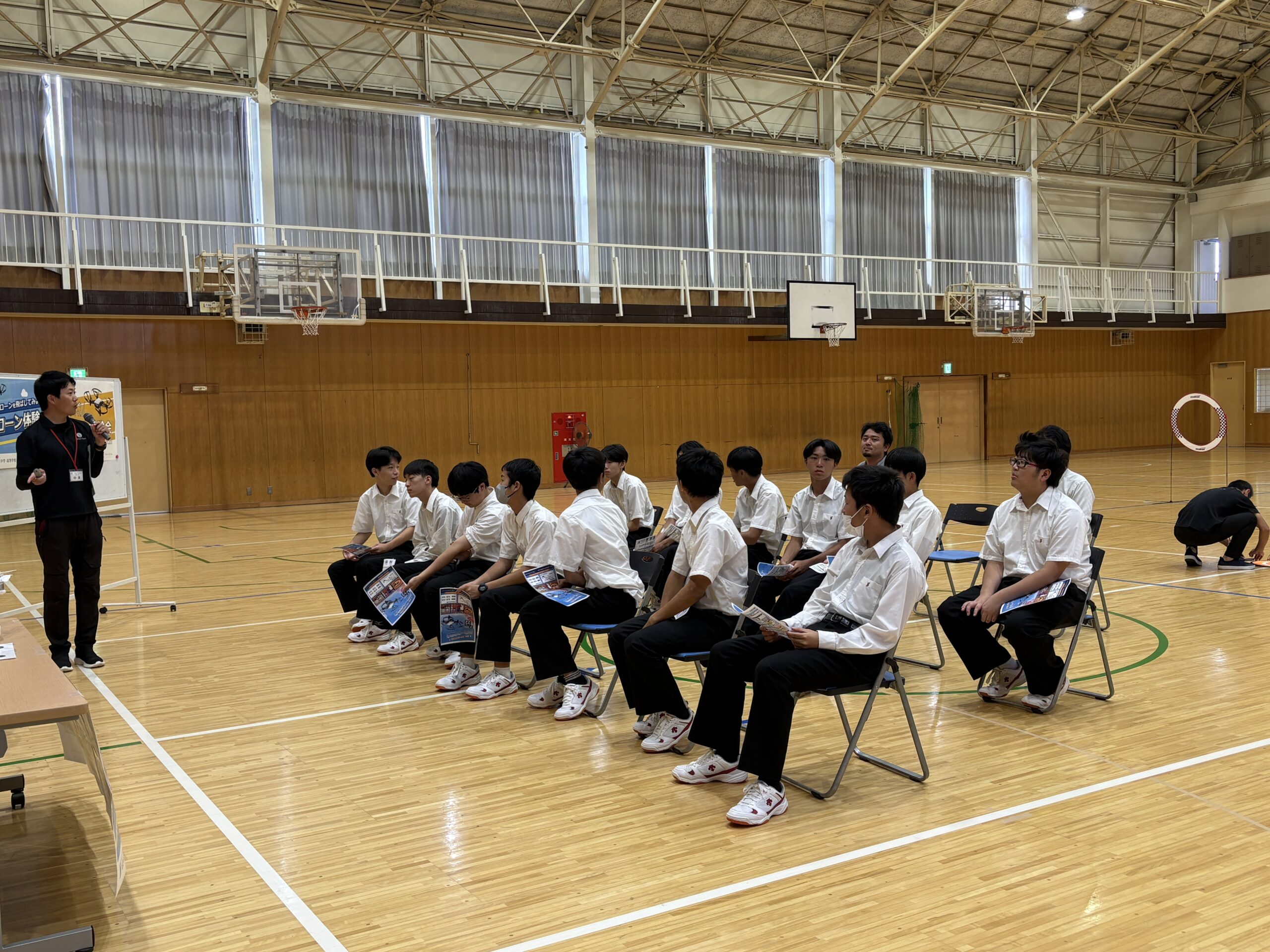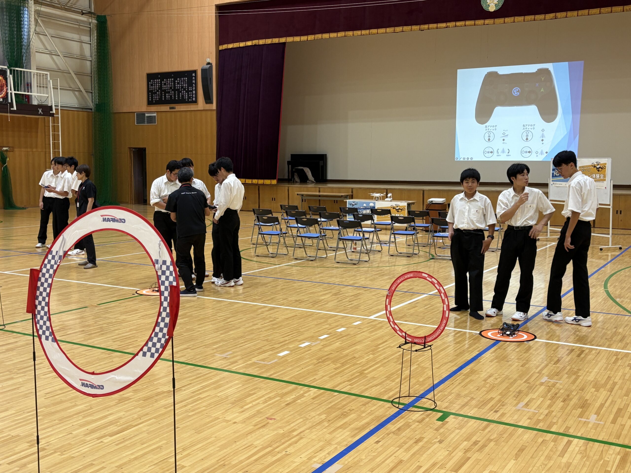 今年度は会場を広い体育館に移し、よりダイナミックな環境の中で講習が行われました。生徒たちはチームに分かれ、実際にドローンを操縦して課題をクリアする体験に挑戦。講習の後半には、ドローンレース形式のチーム対抗戦も開催され、会場は大いに盛り上がりました。