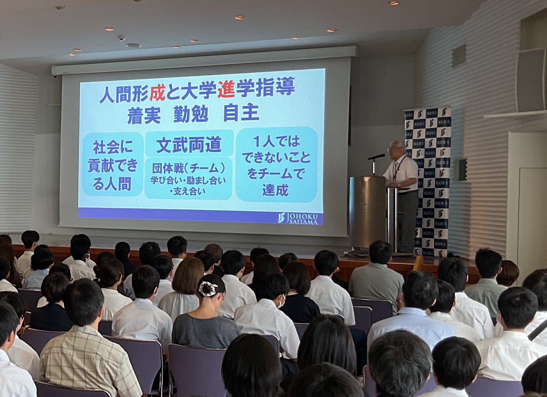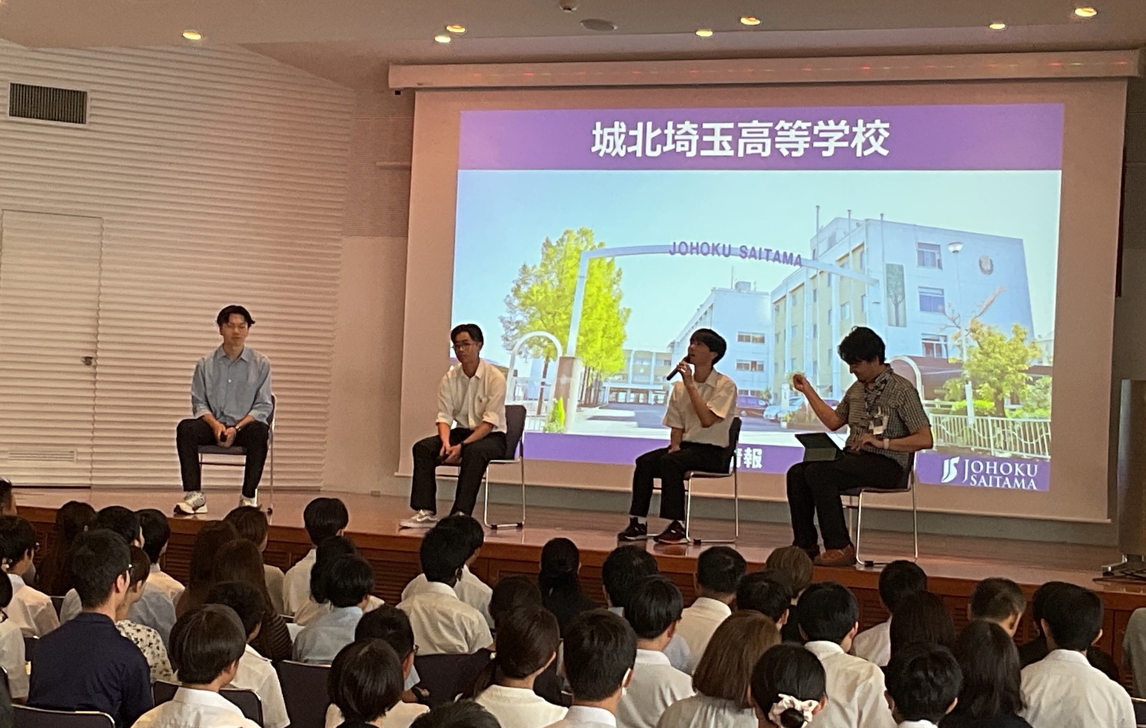校長挨拶、教育方針(教頭)、本科コース(高1主任)、フロンティアコース(コース主任)の説明の後、在校生とOBの座談会をお聞きいただきました。