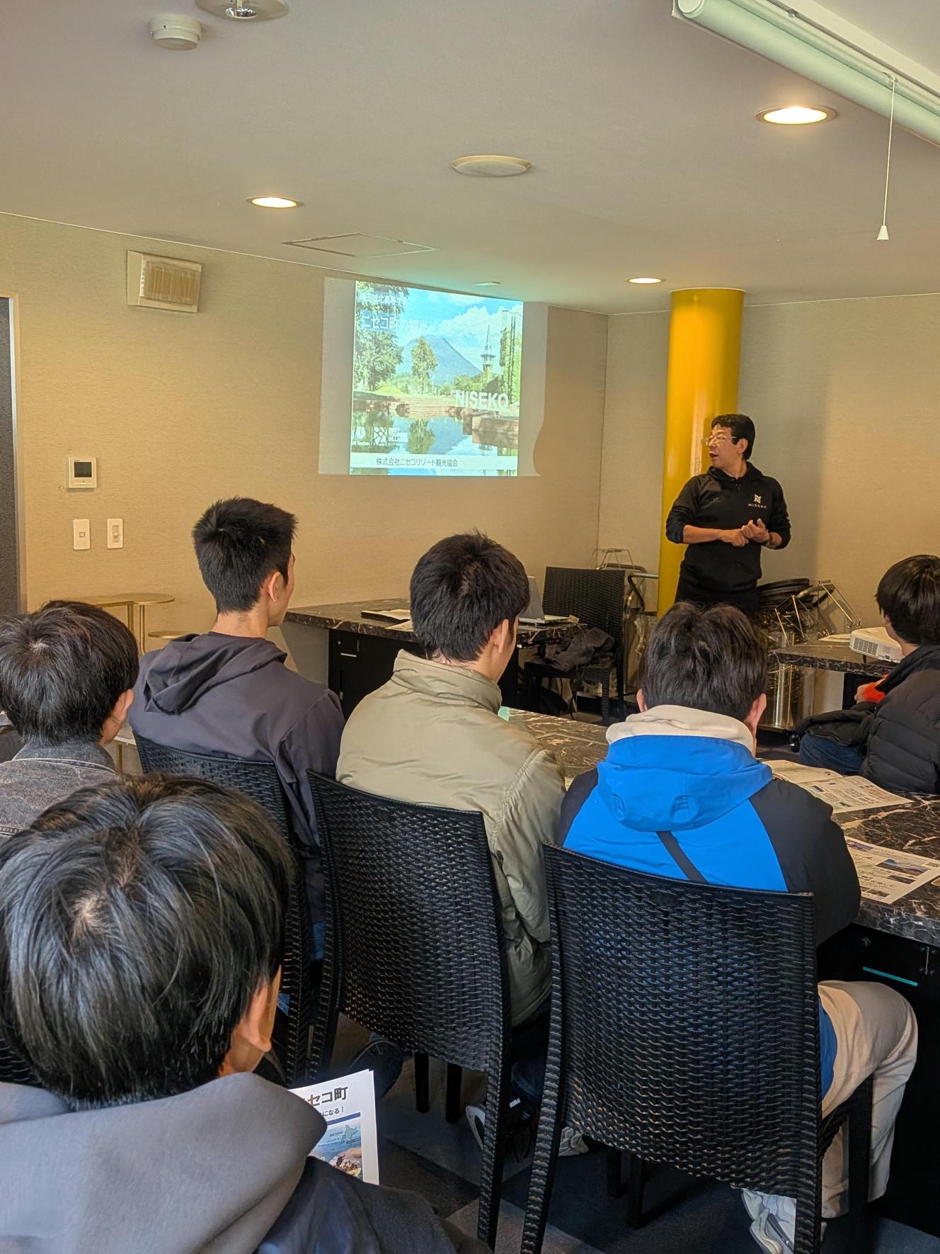 まず、ニセコ観光協会の方から「まちづくり講話」をしていただきました。ニセコ町では「住んでよし・訪れてよし」の持続可能な観光地を目指し、「信頼される国際リゾート」というビジョンのもと、町民や観光客が一体となってまちづくりを進めています。環境モデル都市としての施策も進められており、自然を活かしながら観光資源を守る姿勢が印象的でした。