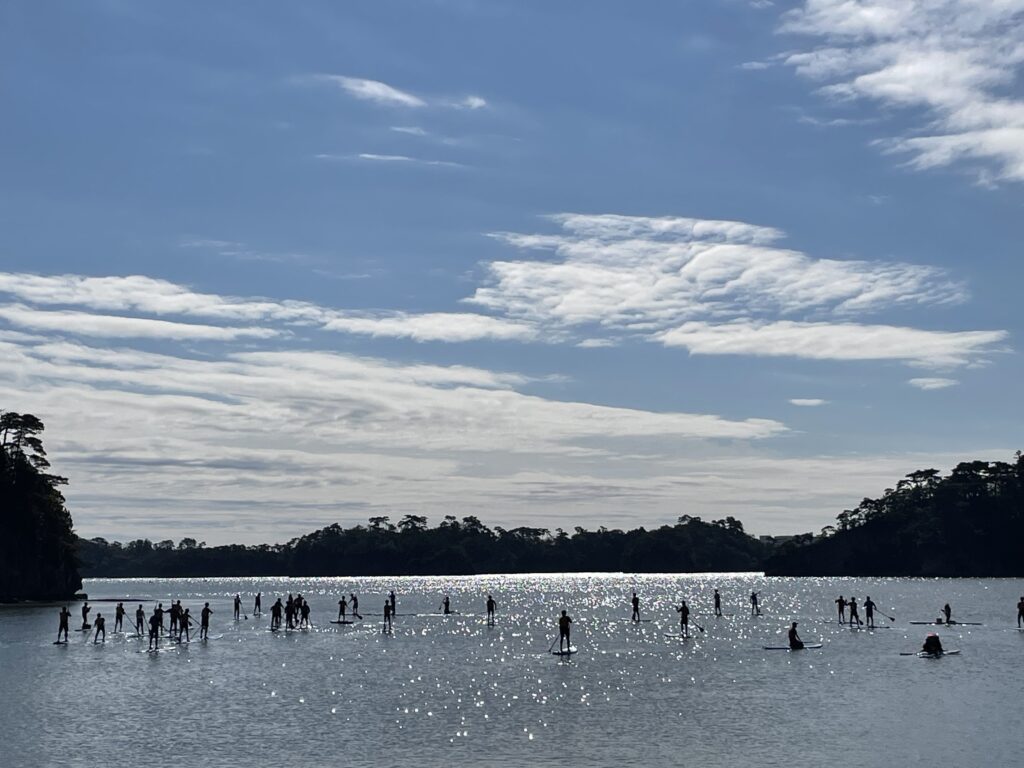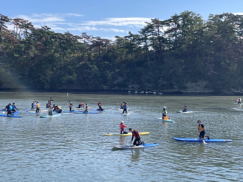 昨日のどんよりした天気とは打って変わって晴天に恵まれた2日目は、日本三景松島にてSUP体験を行いました。水に落ちても大丈夫なようにウェットスーツ、ライフジャケットを着用し、講師の方のレクチャーを受け、万全の状態で漕ぎ出しました。初めこそバランスを取るのに苦戦している様子も見られましたが、すぐにコツを掴んだようで、松島の絶景を存分に味わえたことと思います。終わる頃には海に落ちた回数を競い合っているほどでした。
