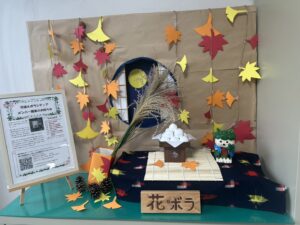 また、職員玄関前の花ボラコーナーについてですが、中学3年生のメンバー様方が秋バージョンの飾り付けを制作して下さいました。お月見団子にススキと紅葉、秋の風情漂う素敵な作品となっております。ご来校の際は、是非ともお立ち寄り願います。