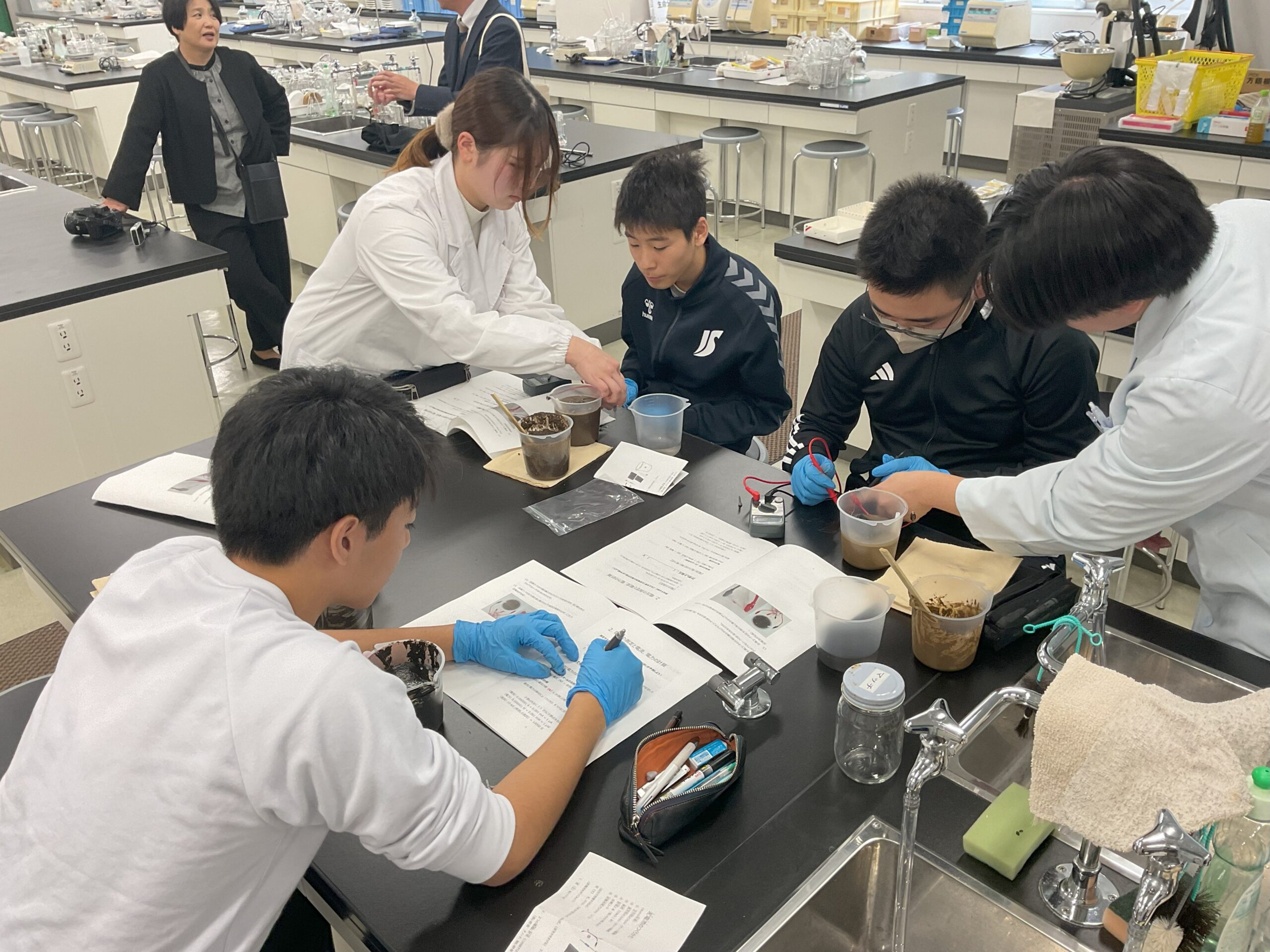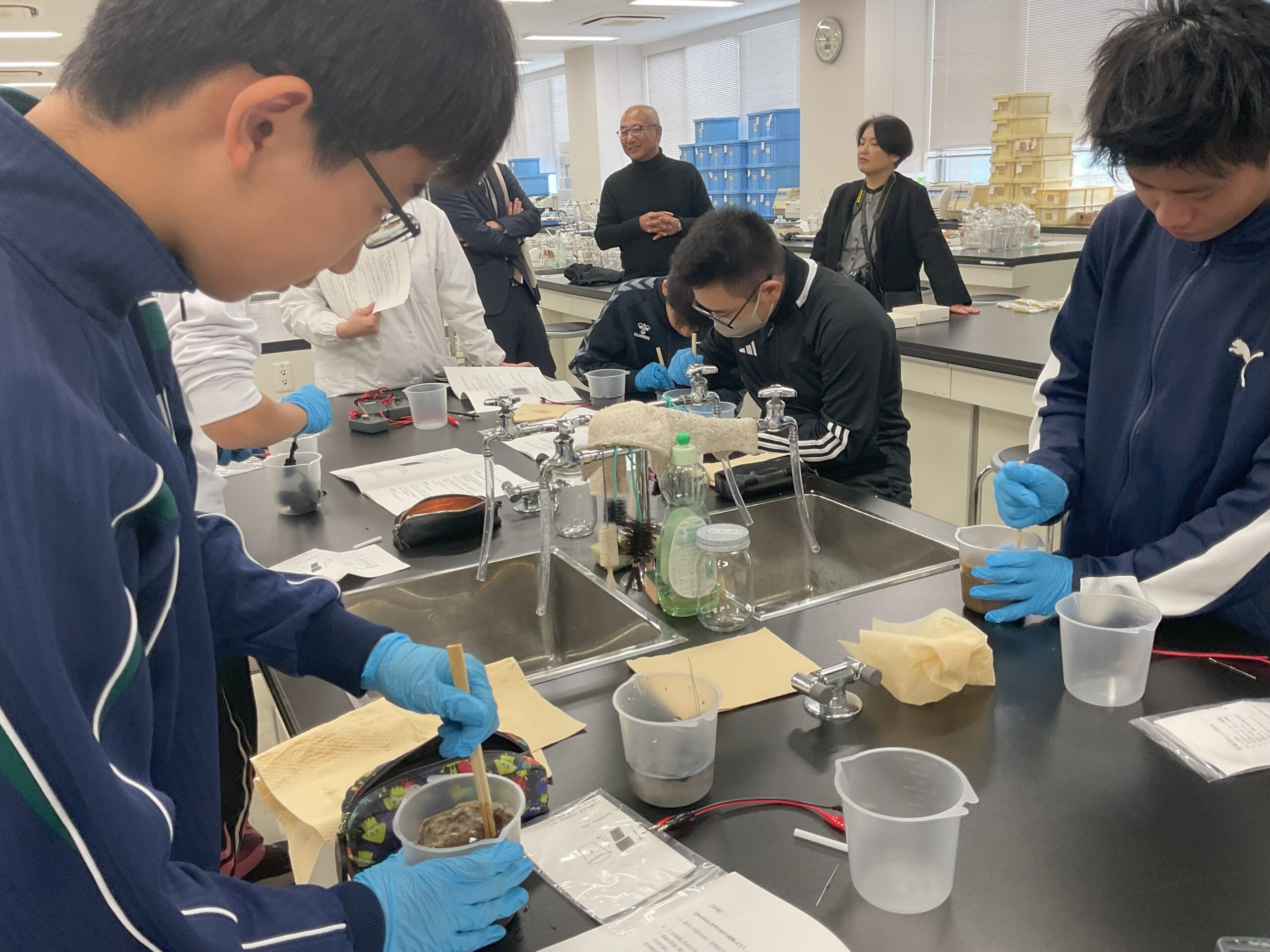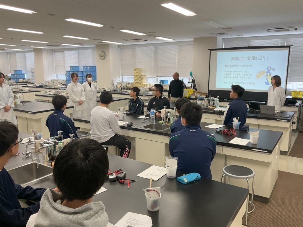 午前の部では、身近な泥を利用した「泥電池」の発電実験を行いました。生徒たちは実際に泥電池を作り、泥の種類によって流れる電圧が異なること、特に沼の泥が最も多く発電することを確認しました。当初、泥からの発電に驚きを感じた生徒もいましたが、実験を通して、泥の中にいる微生物が電力を生み出しているという事実に深い感動を覚えました。この経験は、身近なものでも使い方次第でSDGsにつながるという気づきを与えました。