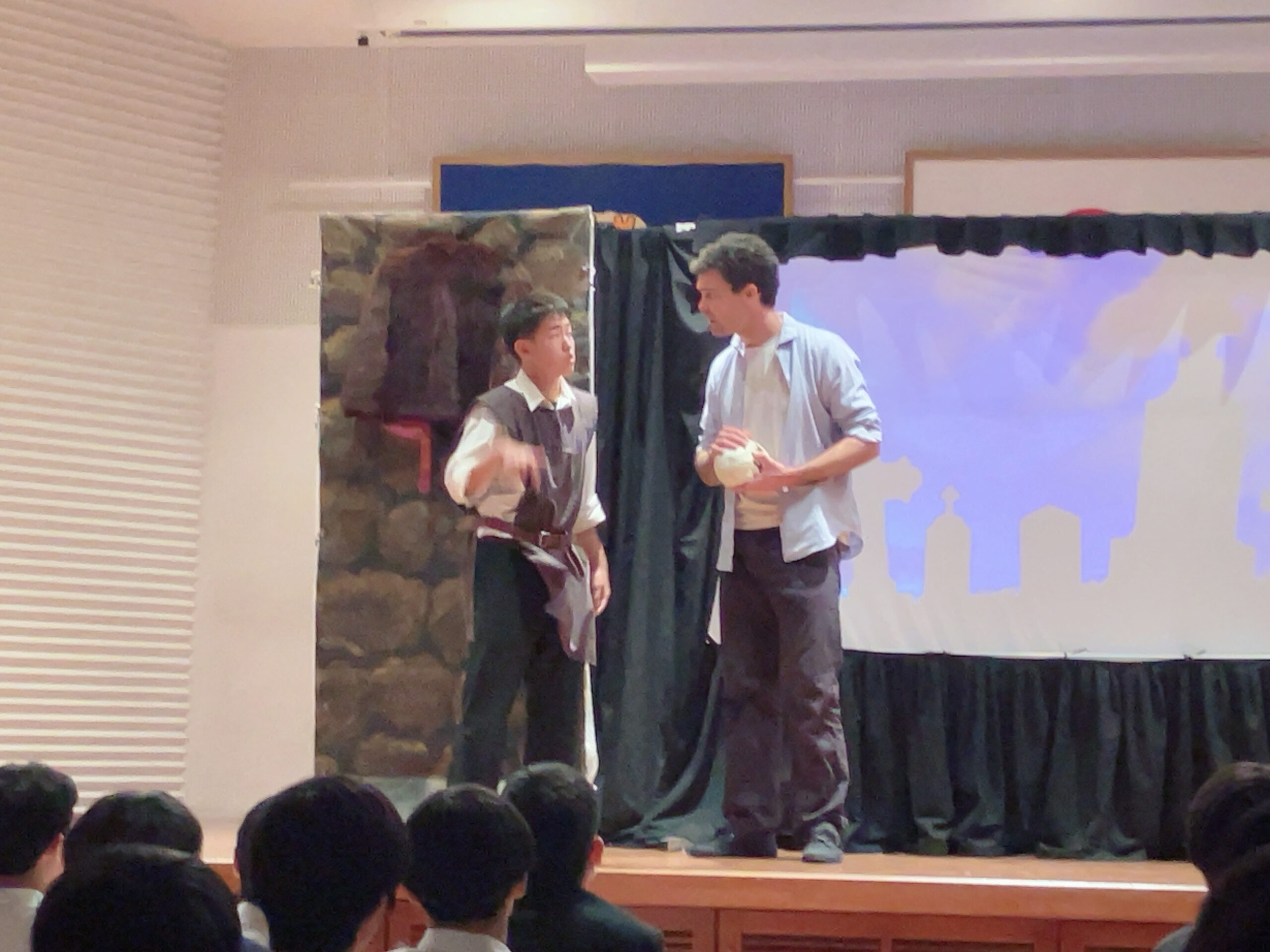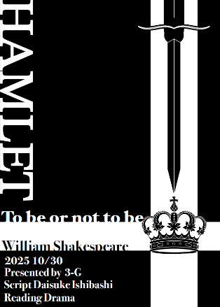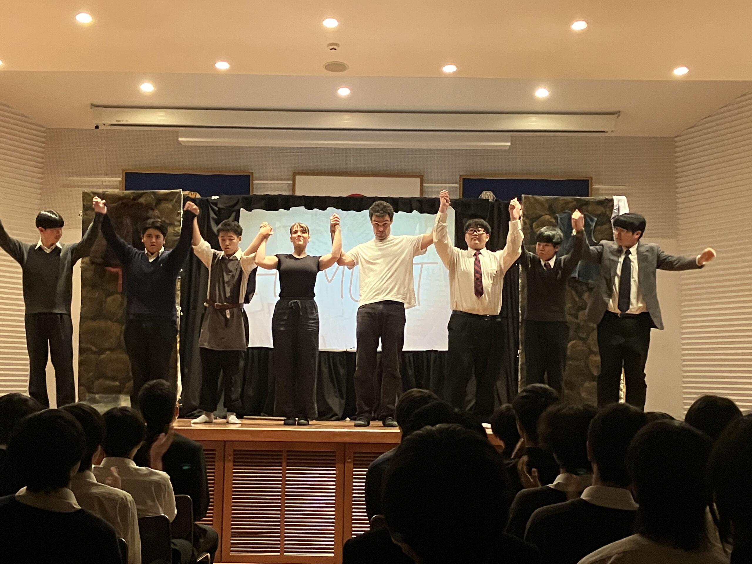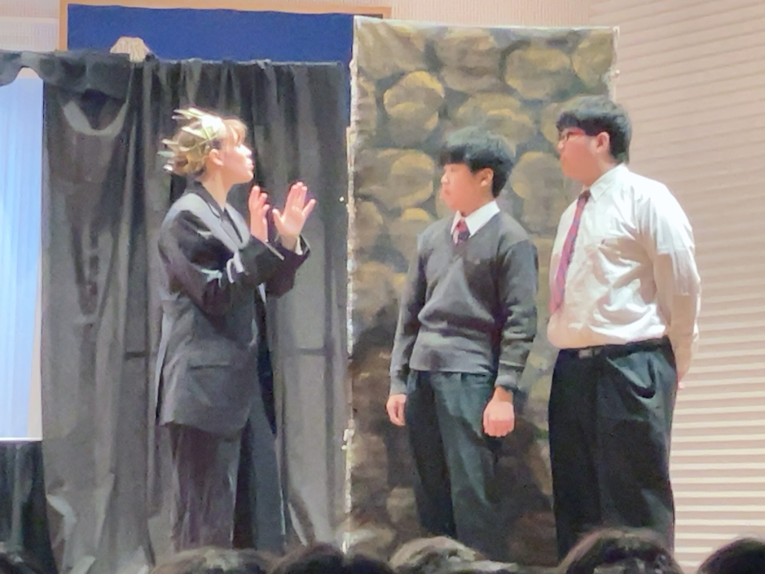 まず、10月30日に、3年生による『朗読劇 ハムレット』を1・2年生向けに公演しました。 朗読劇は生徒にとって初めての挑戦でしたが、緩急のあるセリフの読み回しや表現によって、観ている後輩や教員も固唾をのんで舞台に引き込まれていました。言葉だけで世界観を立ち上げる力を感じる公演となりました。