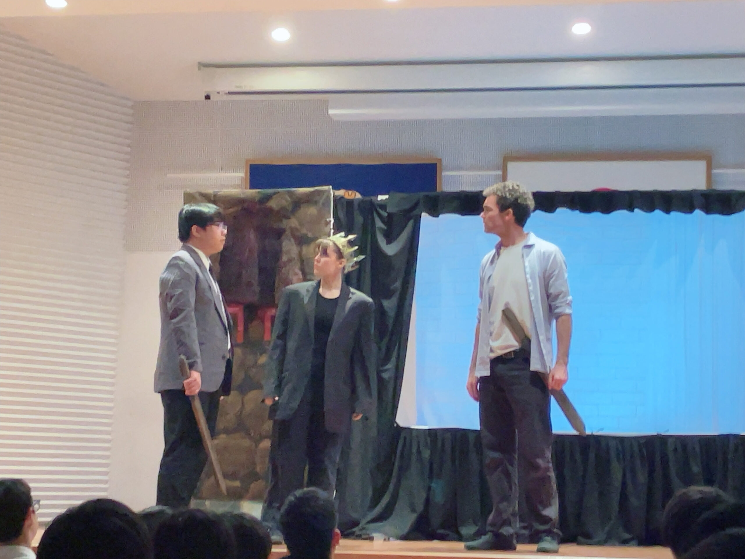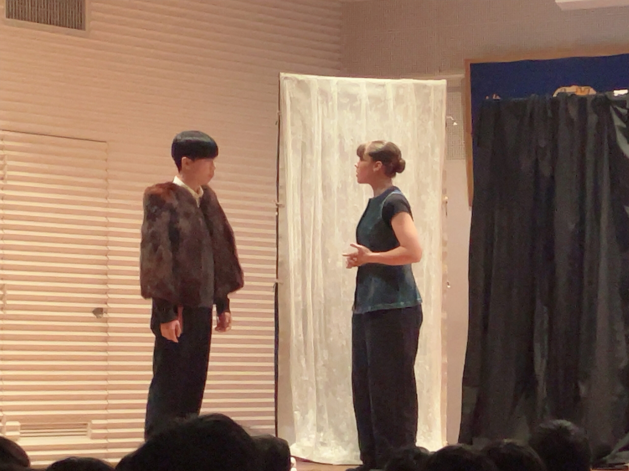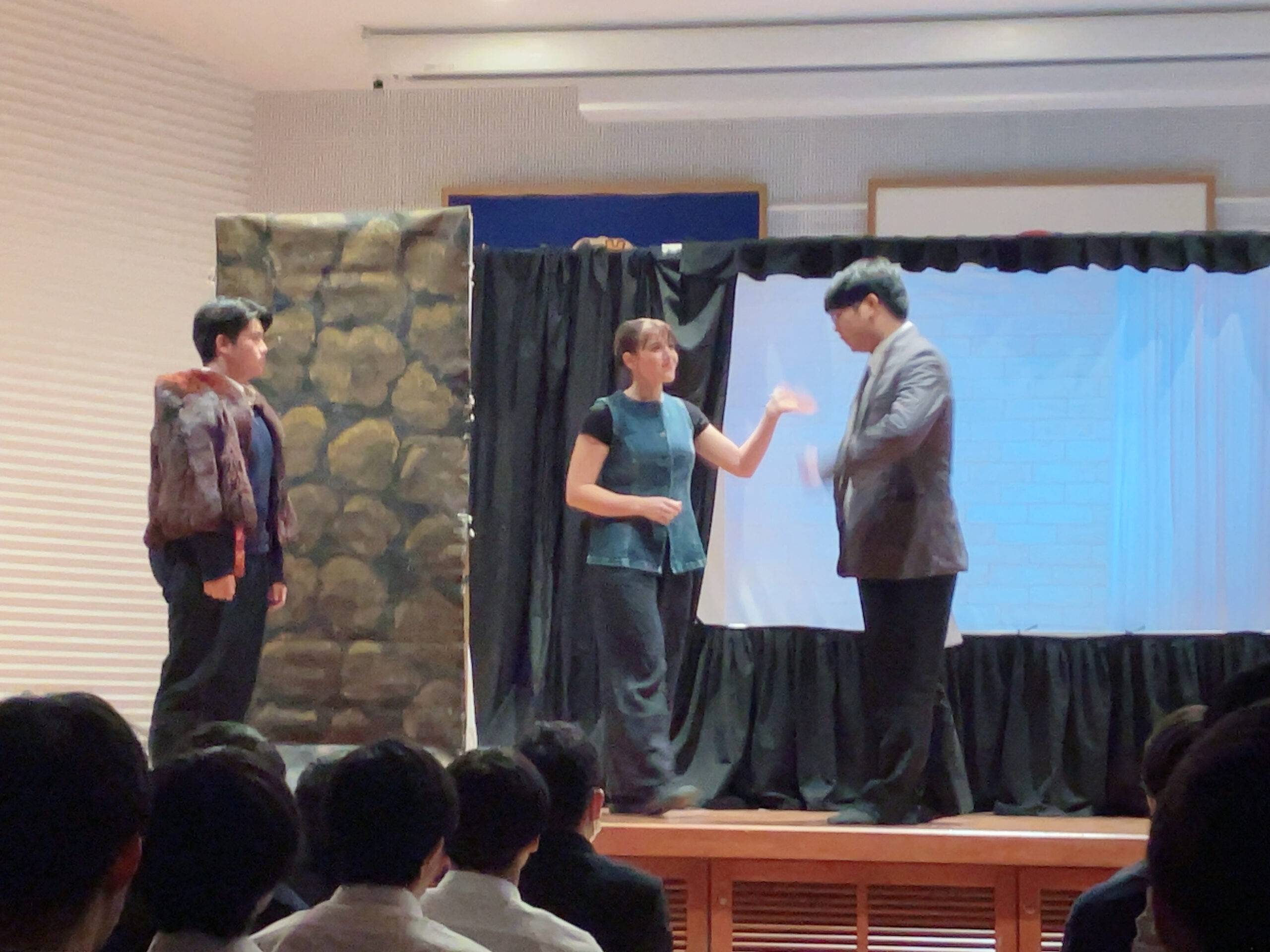 今年は、1・2年生の計5名が英語のセリフを覚え、実際にステージに上がって演じました。緊張しながらも、堂々とした姿で舞台に立つことができました。 公演後には恒例の質問タイムが設けられ、生徒たちは英語で積極的に質問に挑戦していました。