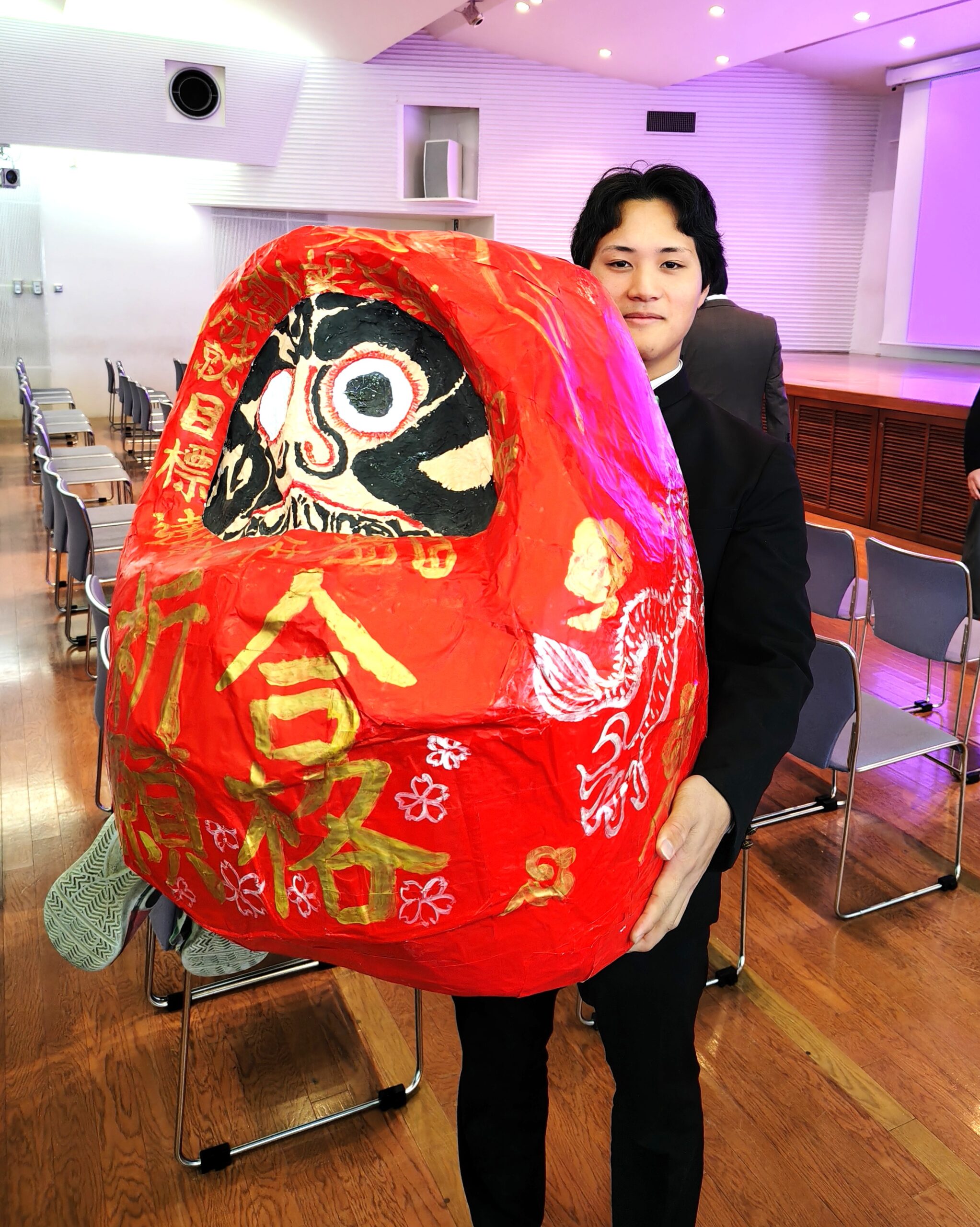 最後には、クラス代表の生徒と担任が合格祈願だるまに共同作業で目入れを行いました。