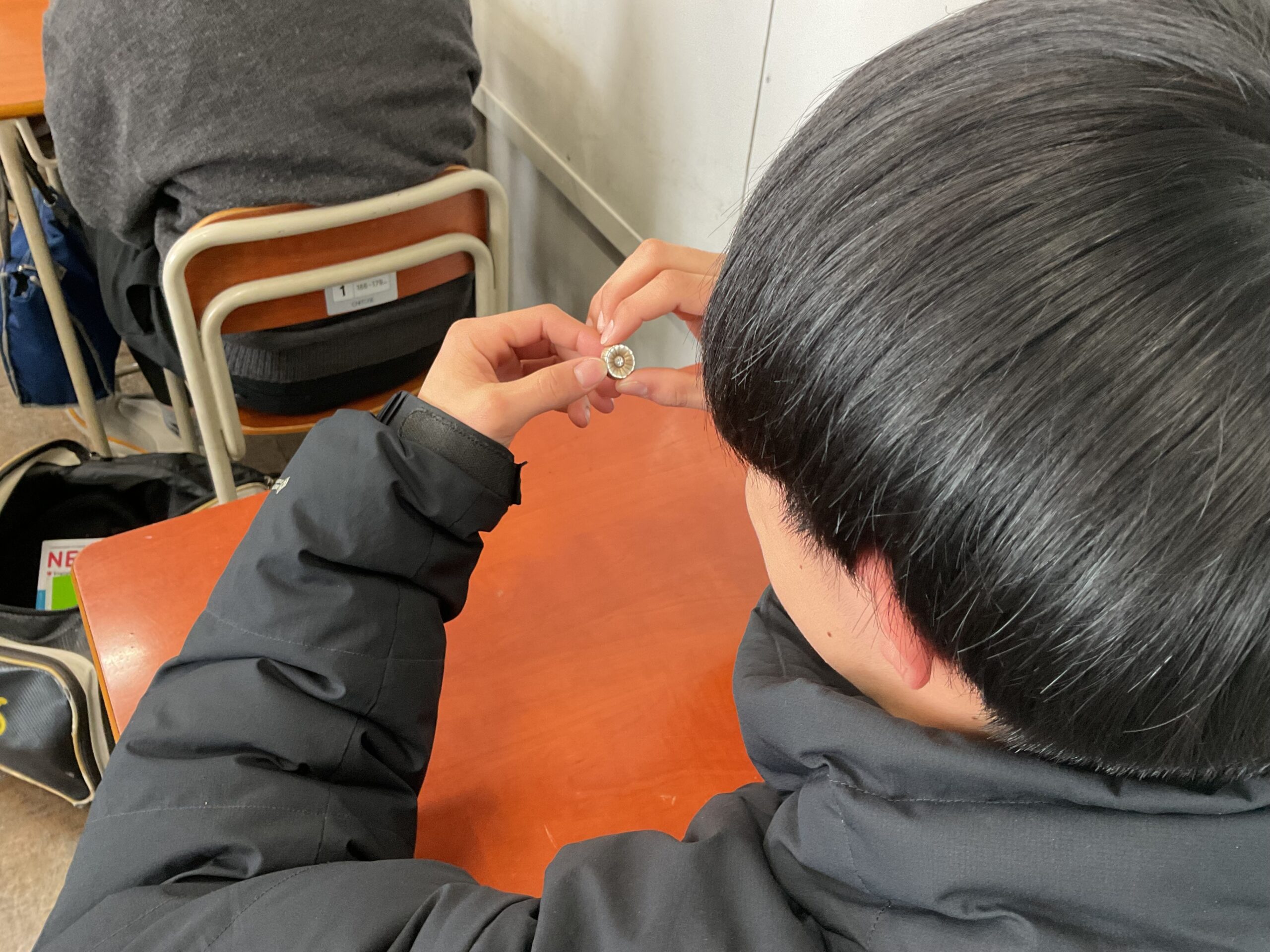 生徒たちの多くは、生の弁護士に会うのは初めてでした。宮﨑先生は、実際に使用されている弁護士バッジを生徒たちに回して見せてくださるなど、親しみやすい雰囲気で「紛争解決のプロ」としての弁護士の役割を語ってくださいました。弁護士の仕事は単に相手を論破することではなく、証拠や根拠に基づいて筋道立てて話し合い、相手を納得させて解決に導くことであるという言葉に、生徒たちは真剣に耳を傾けていました。
