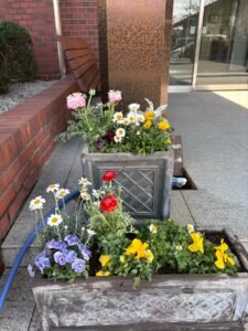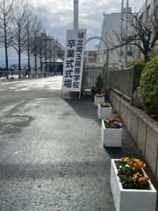 卒業式・入学式へ向けて、花壇及びプランターにパンジー,ガーベラ,ラナンキュラス等、色鮮やかな春の花苗を植えました。