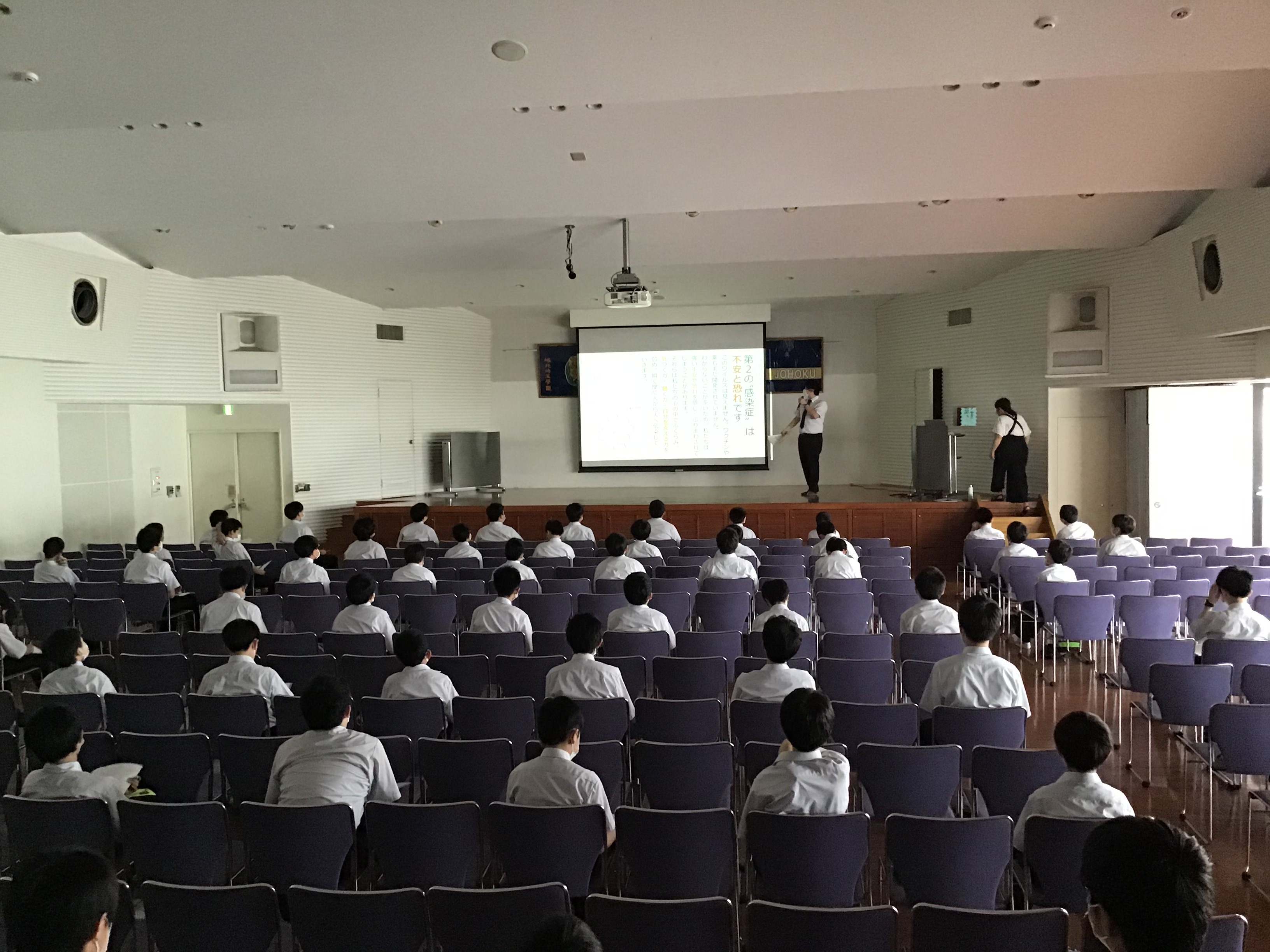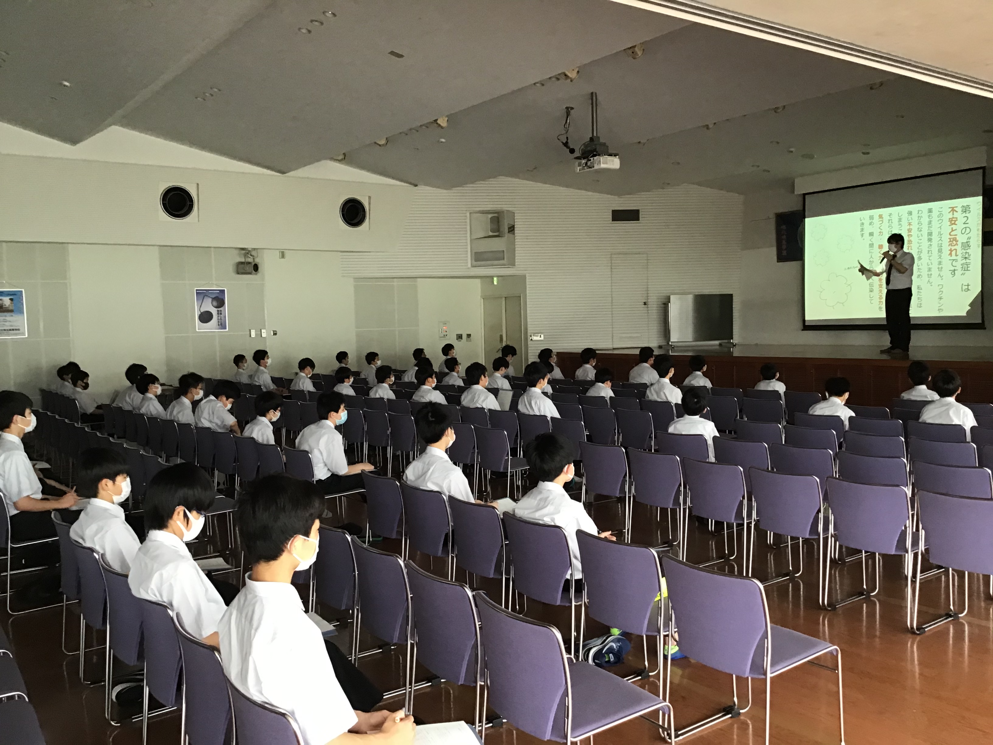 本日5時間目(3・4組)、6時間目(1・2組)を使って、記念ホールで道徳の授業を行いました。今回は第1回の道徳授業でもあり、学年として「新型コロナウイルスについて」を取り上げました。