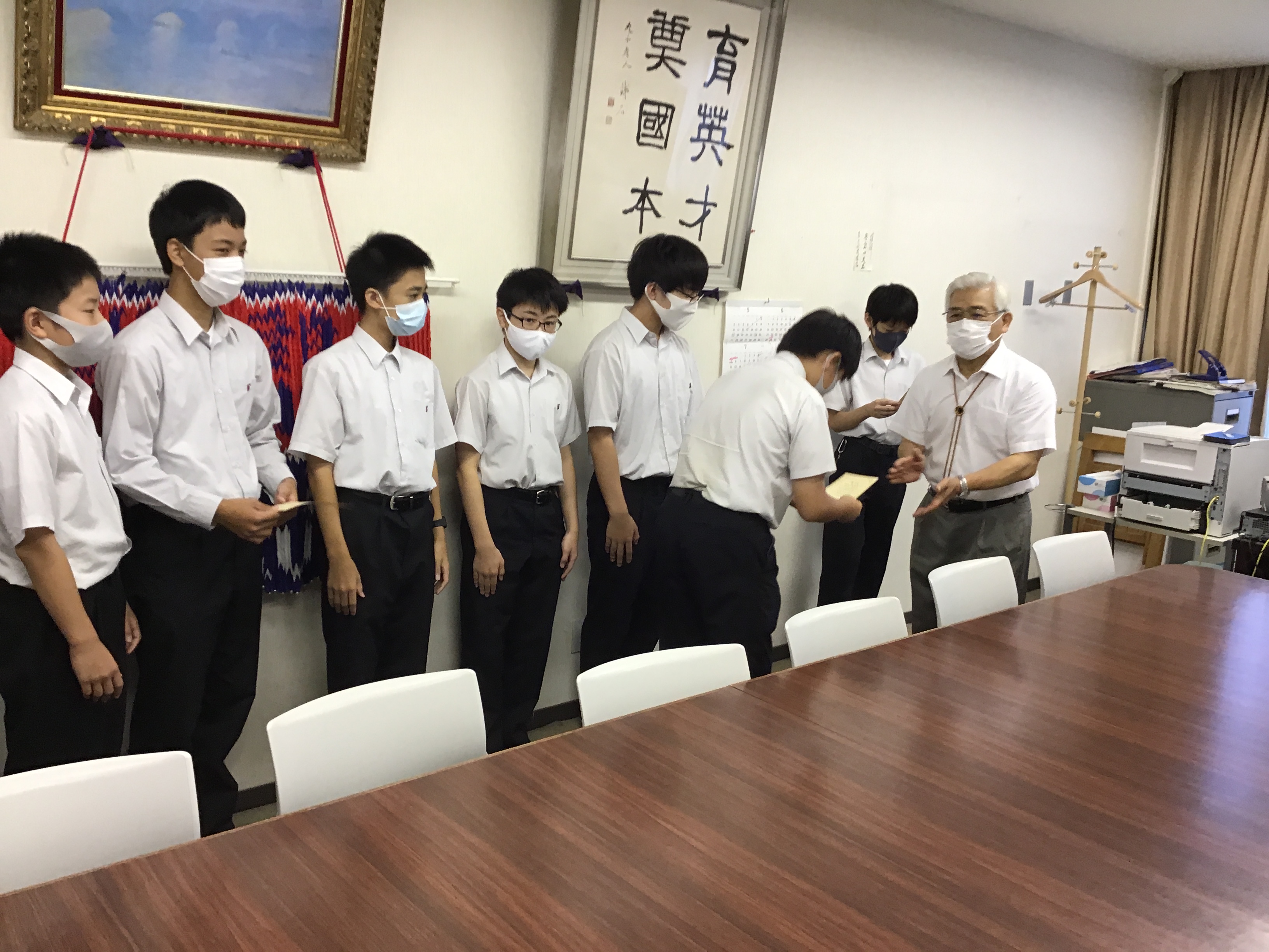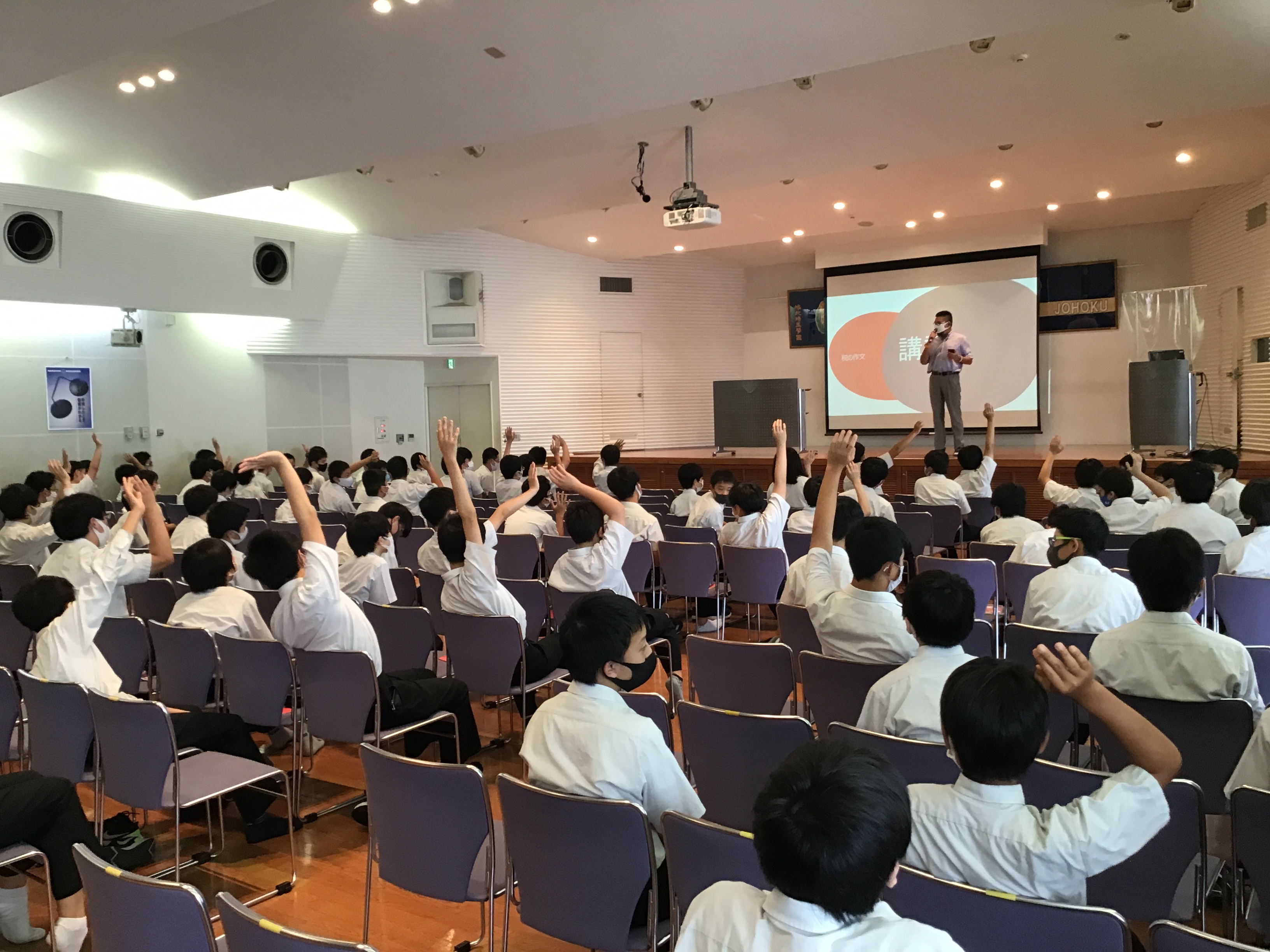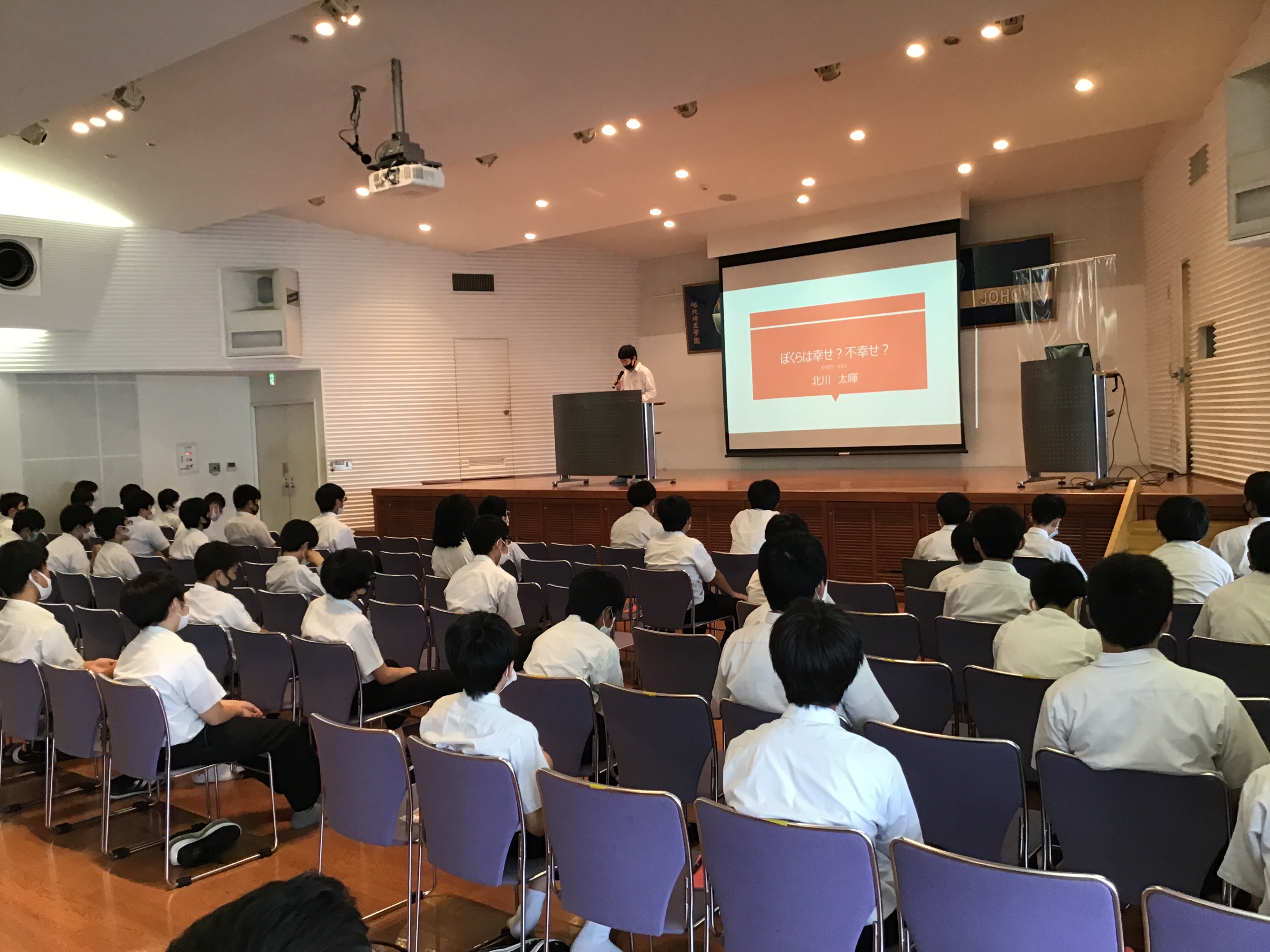 総合の授業を通して税について学んでいます。そのアウトプットとして全員で税の作文に取り組みました。今日は各クラスから2名ずつ代表者に作文を披露してもらいました。特に発表の練習をしたわけではなく、ぶっつけ本番で舞台に登壇したので、緊張したことと思います。9名の皆さん、多様な意見をありがとうございました。学年で考えを共有できる貴重な時間となりました。