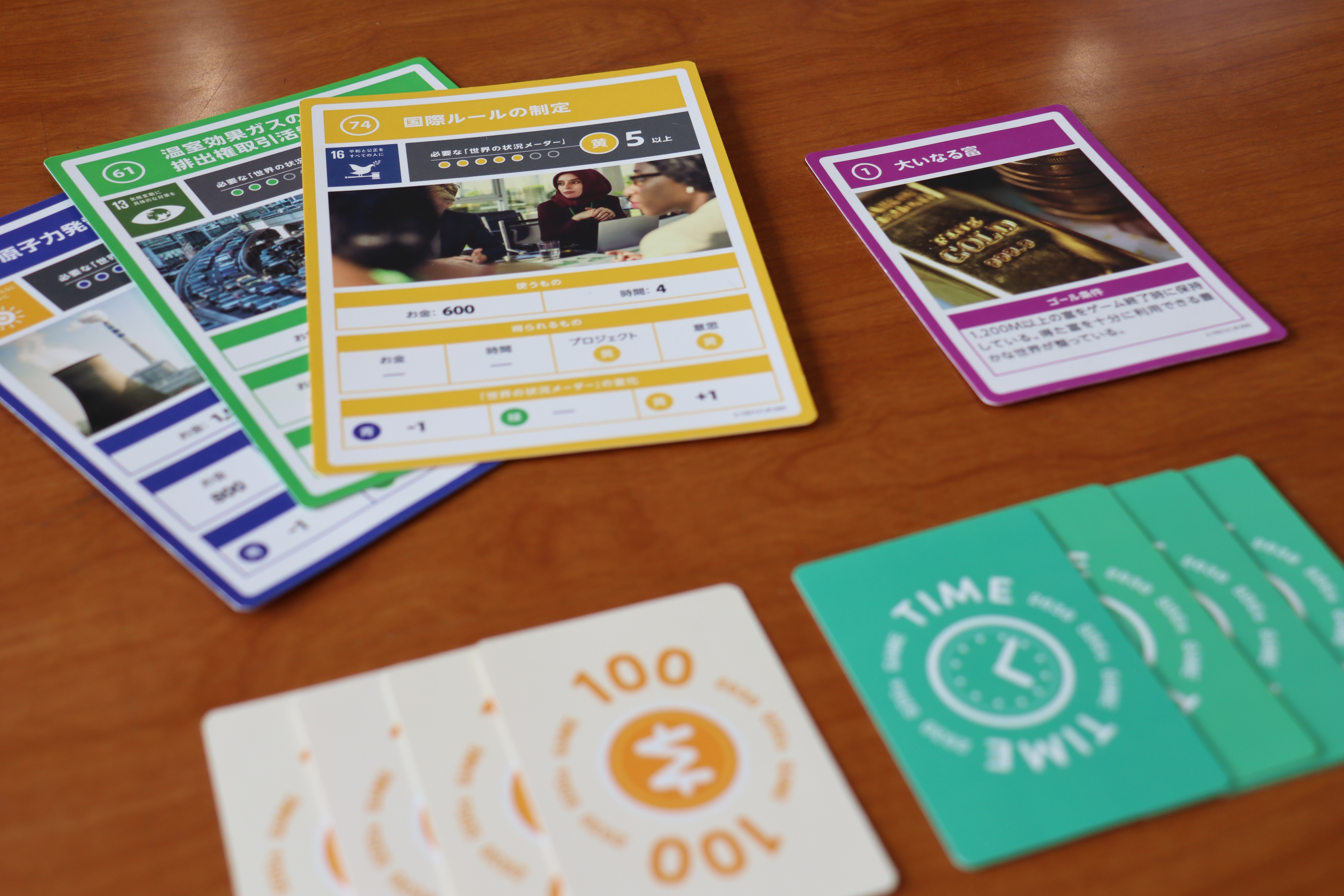2~3人で1つの国(グループ)を作り、各グループに与えられた課題と世界(クラス)の「経済・環境・社会」の3つのバランスを考えながらカードのプロジェクトを実行していきます。