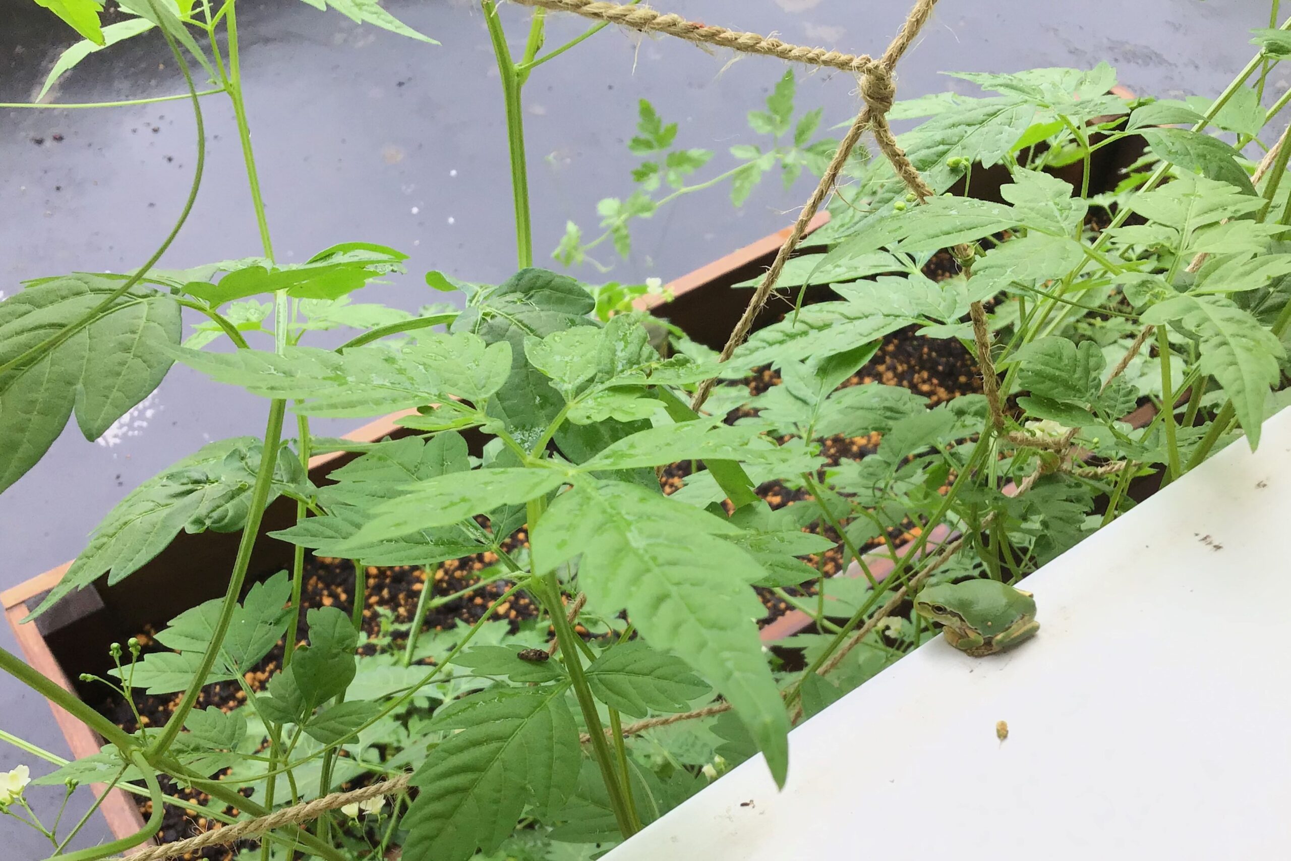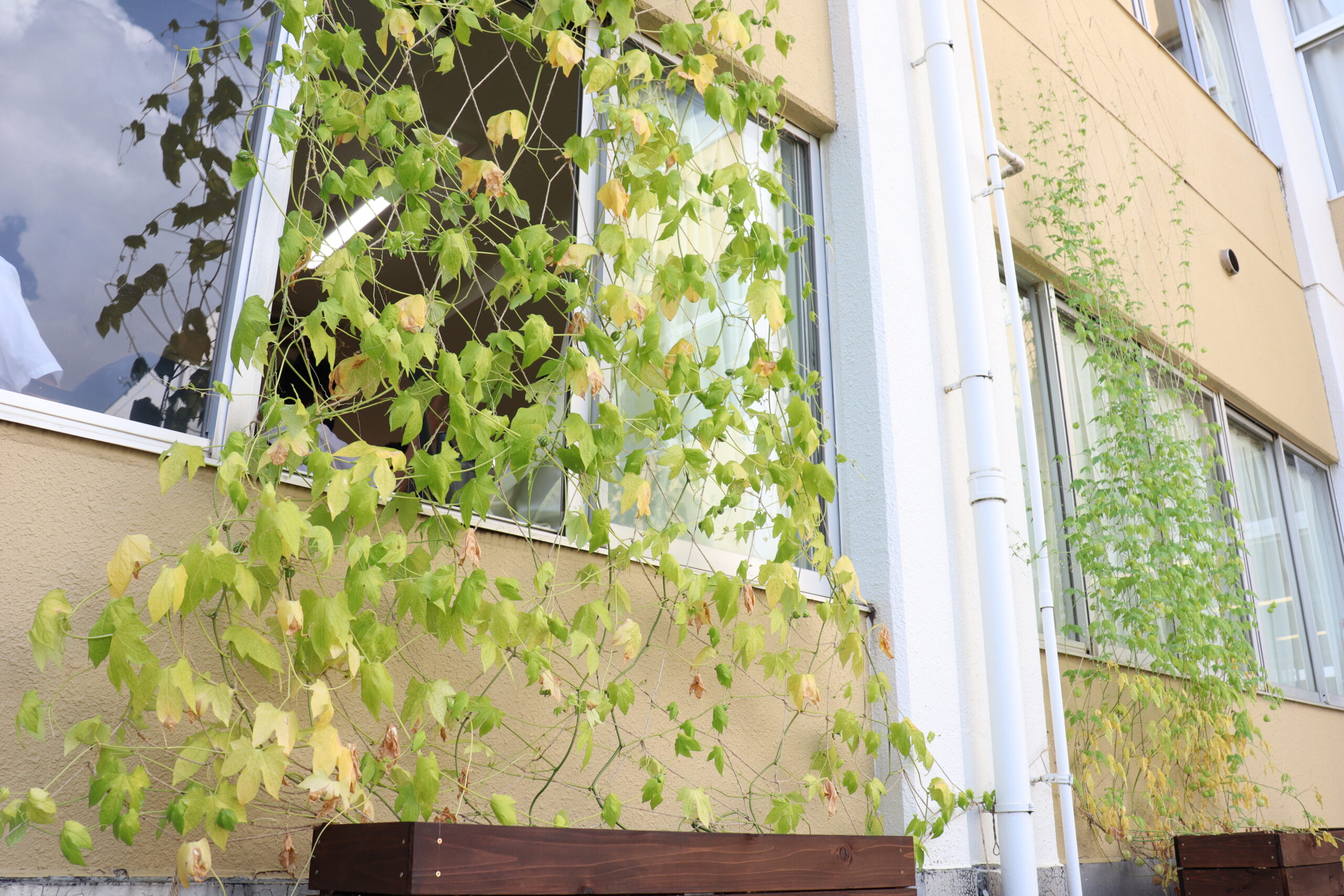 夏の日を浴びてさらなる成長を見せるグリーンカーテンですが、それぞれのカーテンに違いがあらわれました。