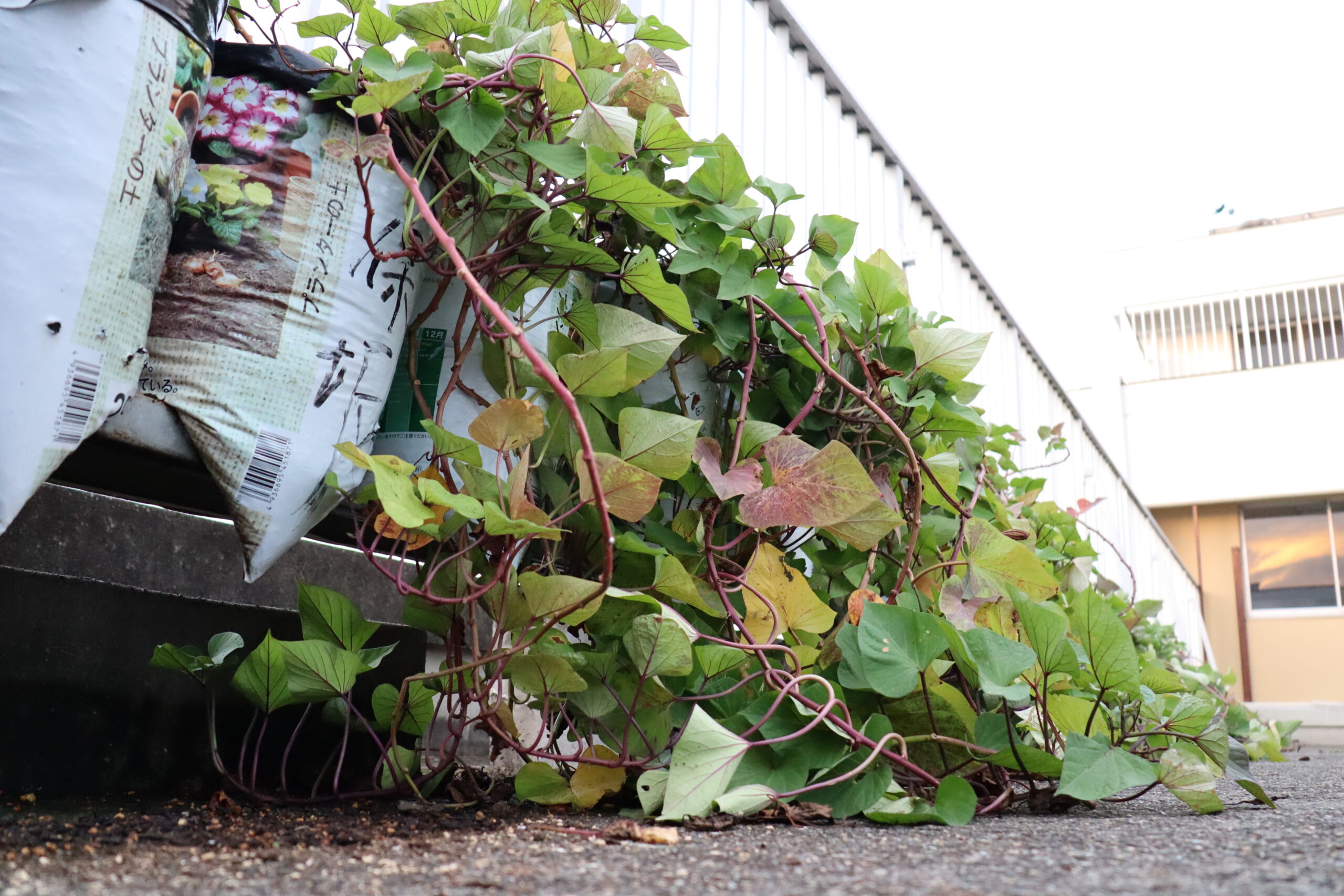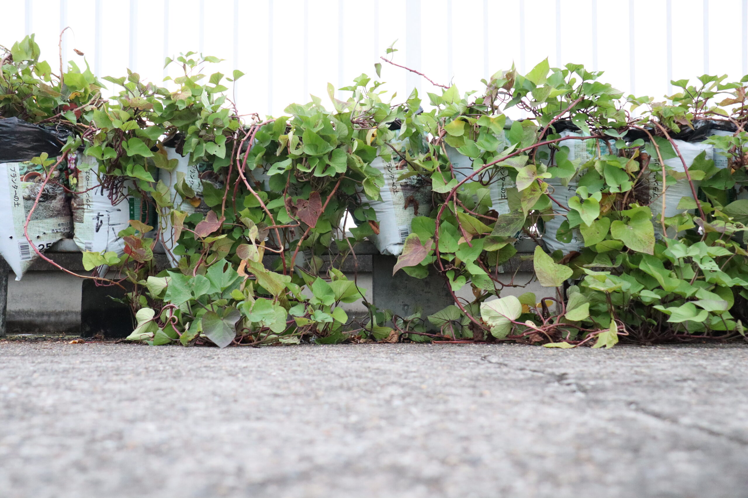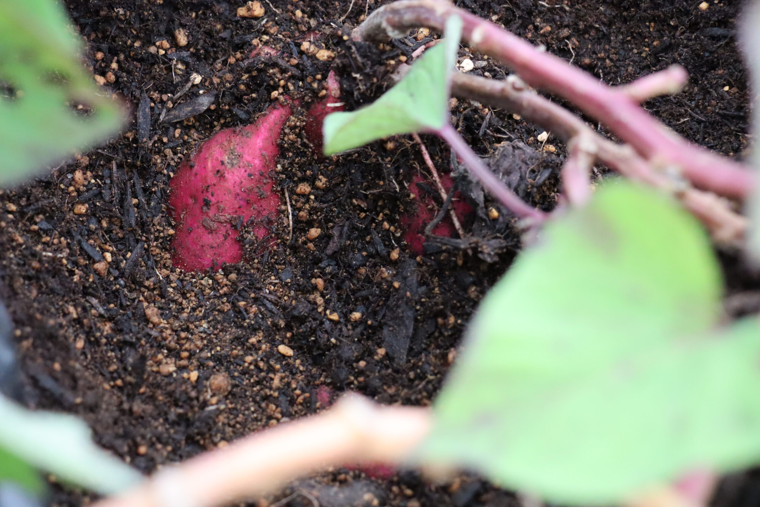 毎日欠かさない水やりでさつまいもは日を重ねるごとにたくましく成長しています。地面をはうように長く伸びたつるには大きな葉がたくさんつき、土の間からはさつまいもがひょっこり顔を出しています。