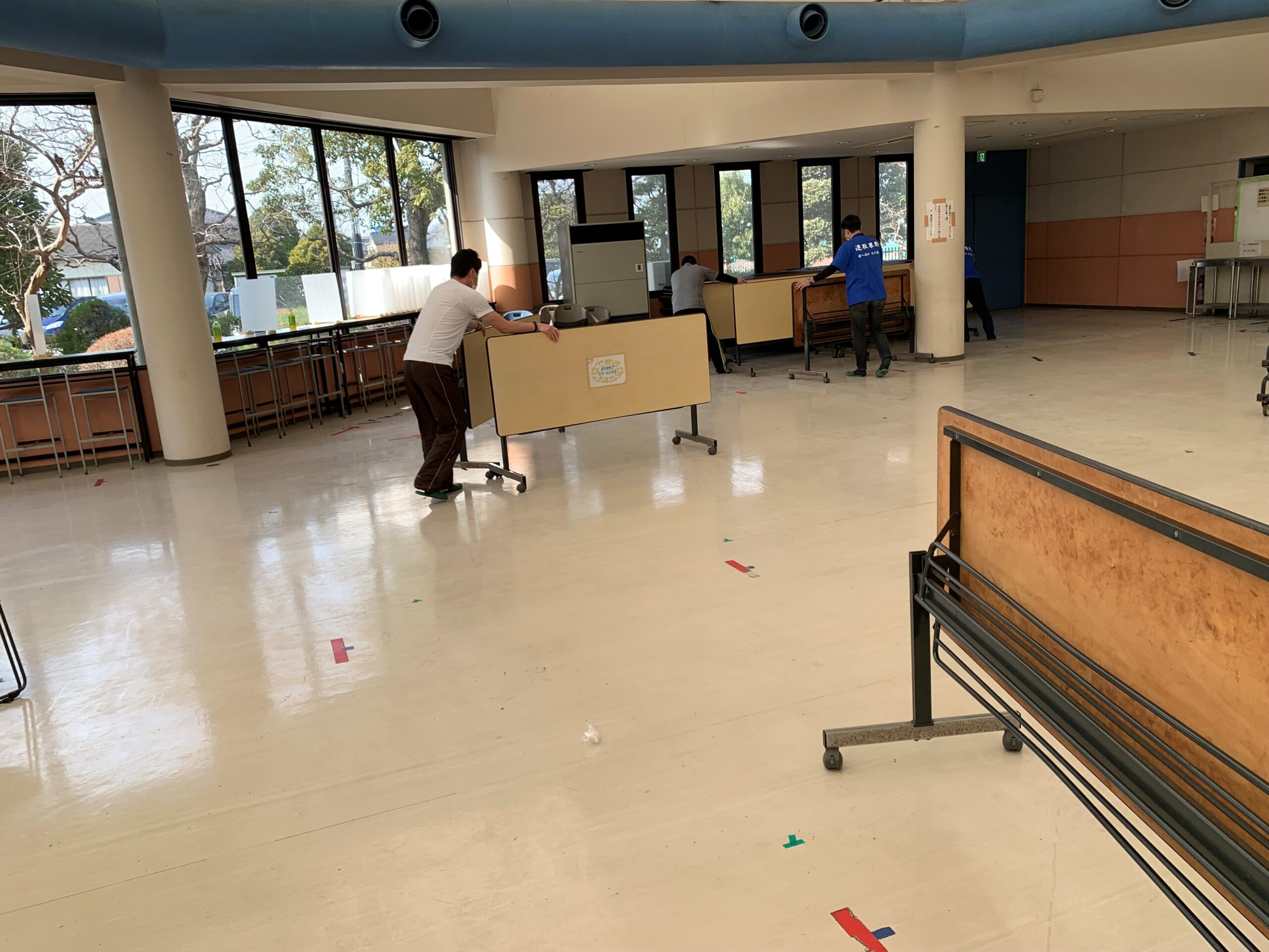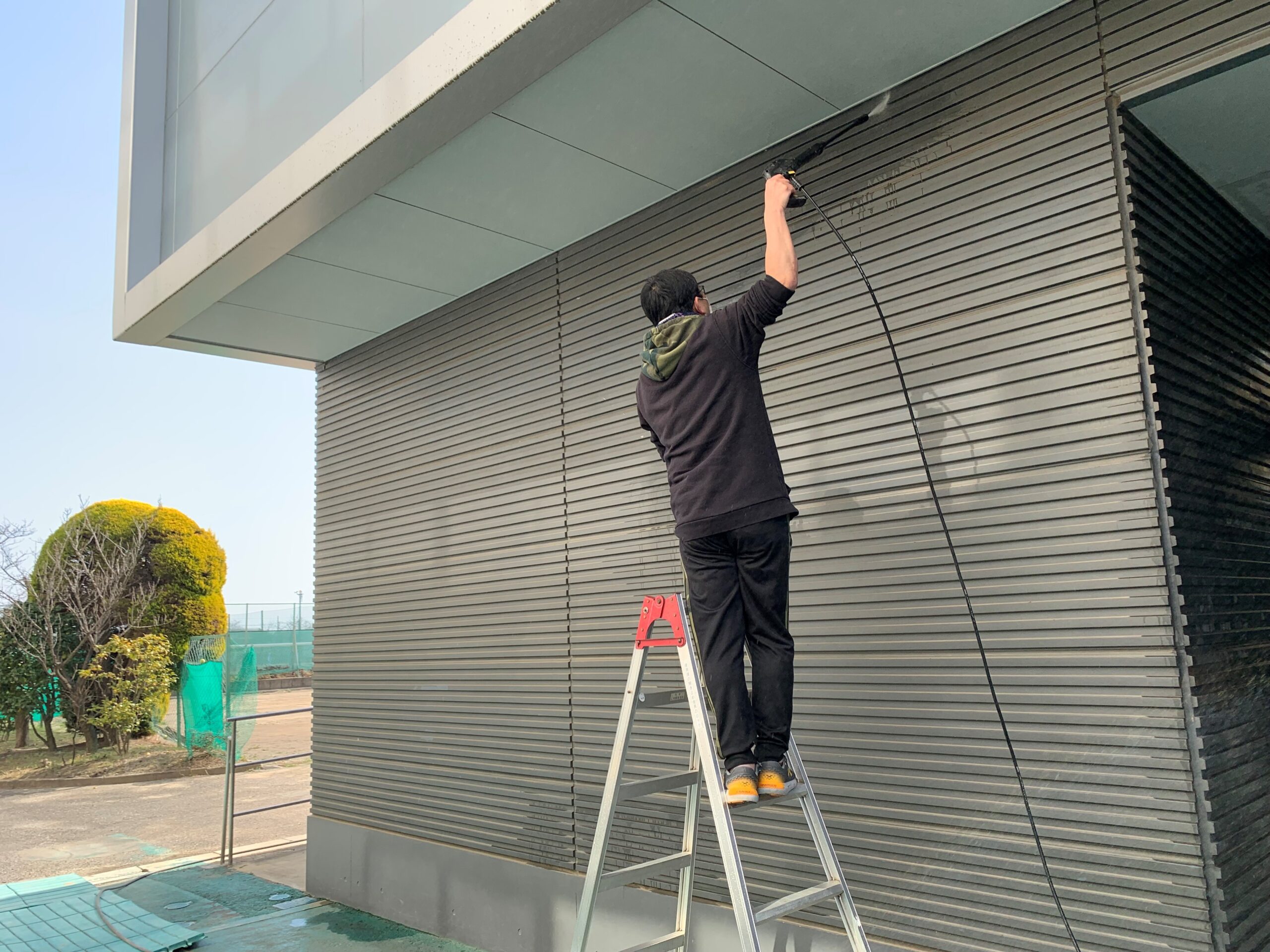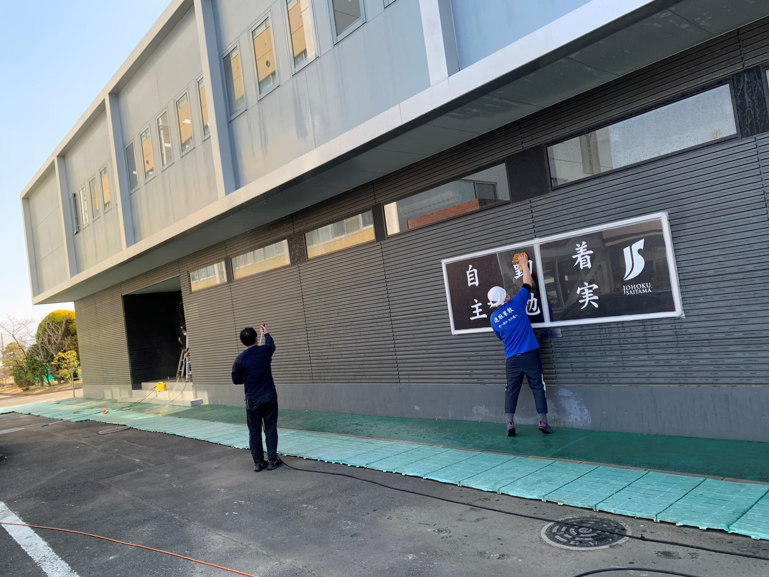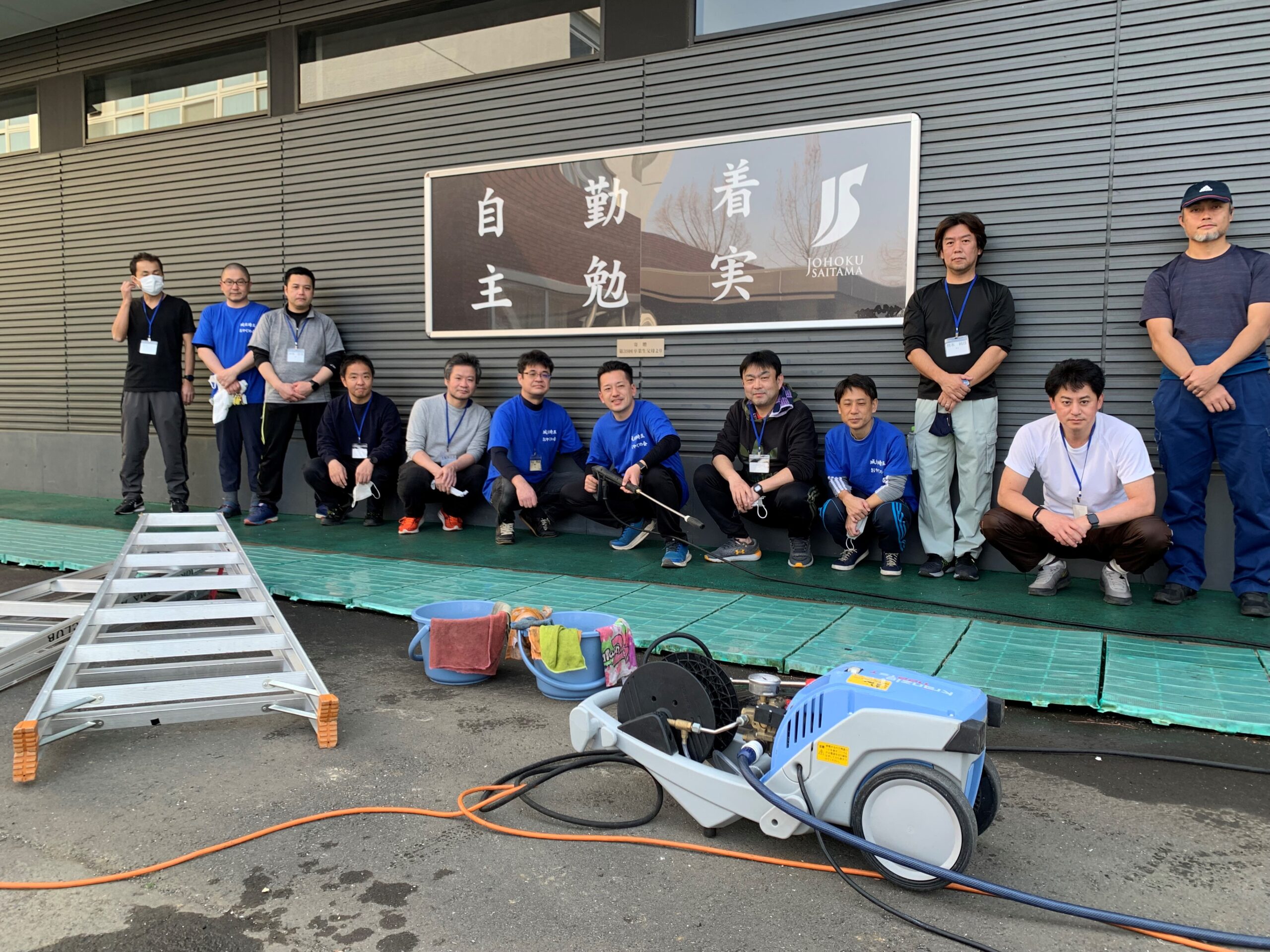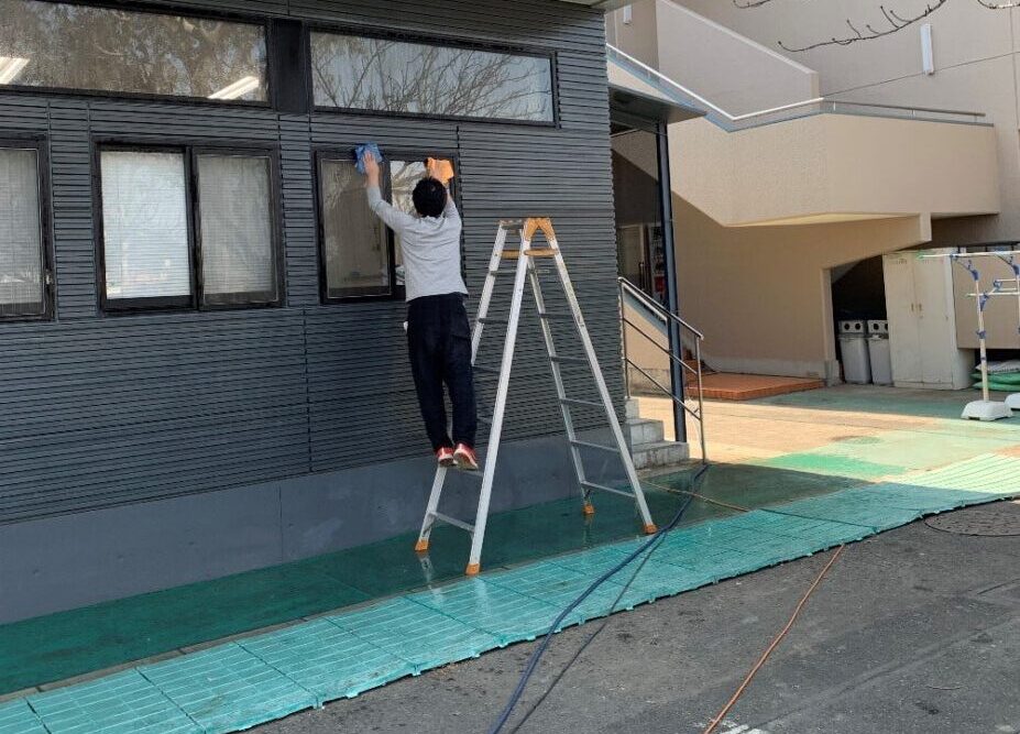 今回は、卒業式に向けて体育館の外壁清掃、新入生への制服販売に向けた食堂のテーブル・椅子移動、清掃を行わせていただきました。