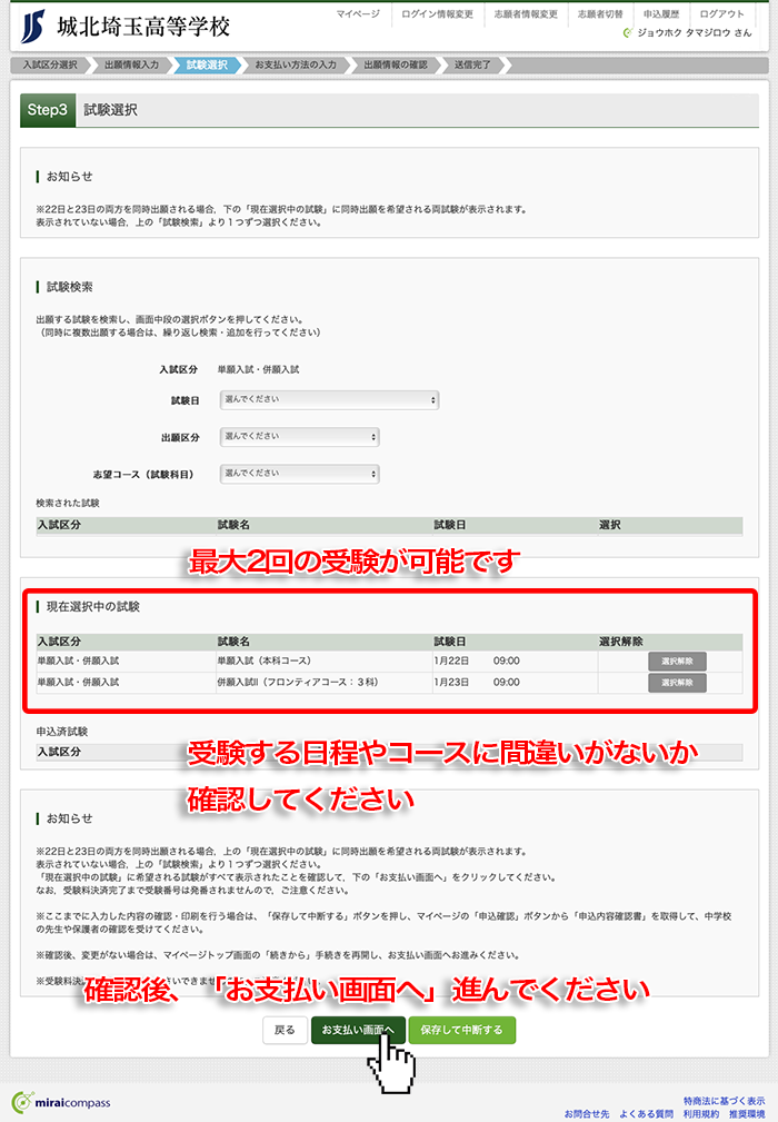 出願されるすべての試験日程を選択した後、「お支払い画面へ」ボタンをクリックし、次へ進んでください。